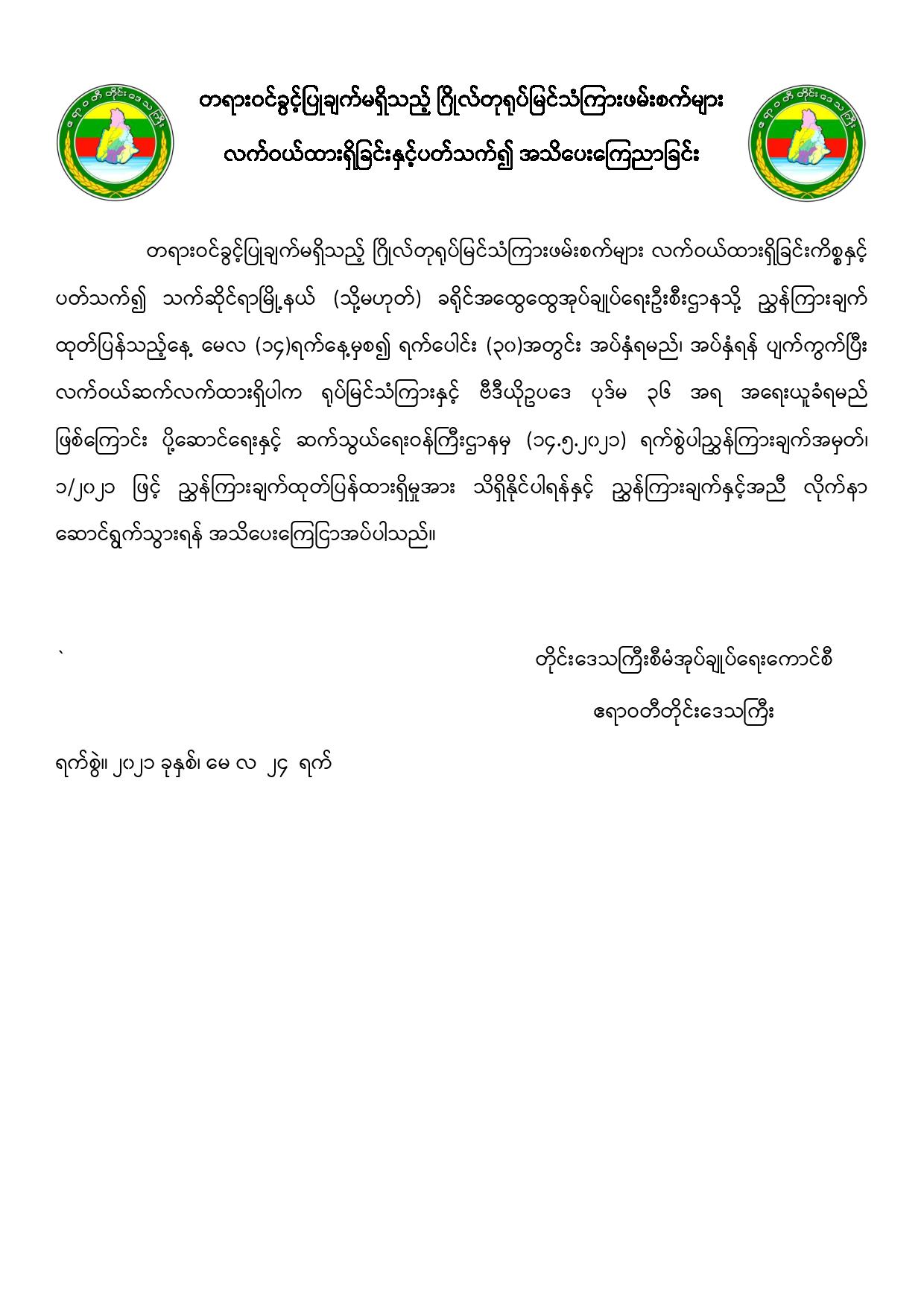 တရားဝင်ခွင့်ပြုချက်မရှိသည့် ဂြိုလ်တုရုပ်မြင်သံကြားဖမ်းစက်များ လက်ဝယ်ထားရှိခြင်းကိစ္စနှင့် ပတ်သက်၍ သက်ဆိုင်ရာမြို့နယ် (သို့မဟုတ်) ခရိုင်အထွေထွေအုပ်ချုပ်ရေးဦးစီးဌာနသို့ ညွှန်ကြားချက် ထုတ်ပြန်သည့်နေ့ မေလ (၁၄)ရက်နေ့မှစ၍ ရက်ပေါင်း (၃၀)အတွင်း အပ်နှံရမည်၊ အပ်နှံရန် ပျက်ကွက်ပြီး လက်ဝယ်ဆက်လက်ထားရှိပါက ရုပ်မြင်သံကြားနှင့် ဗီဒီယိုဥပဒေ ပုဒ်မ ၃၆ အရ အရေးယူခံရမည် ဖြစ်ကြောင်း ပို့ဆောင်ရေးနှင့် ဆက်သွယ်ရေးဝန်ကြီးဌာနမှ (၁၄.၅.၂၀၂၁) ရက်စွဲပါညွှန်ကြားချက်အမှတ်၊ ၁/၂၀၂၁ ဖြင့် ညွှန်ကြားချက်ထုတ်ပြန်ထားရှိမှုအား သိရှိနိုင်ပါရန်နှင့် ညွှန်ကြားချက်နှင့်အညီ လိုက်နာ ဆောင်ရွက်သွားရန် အသိပေးကြေငြာအပ်ပါသည်။
