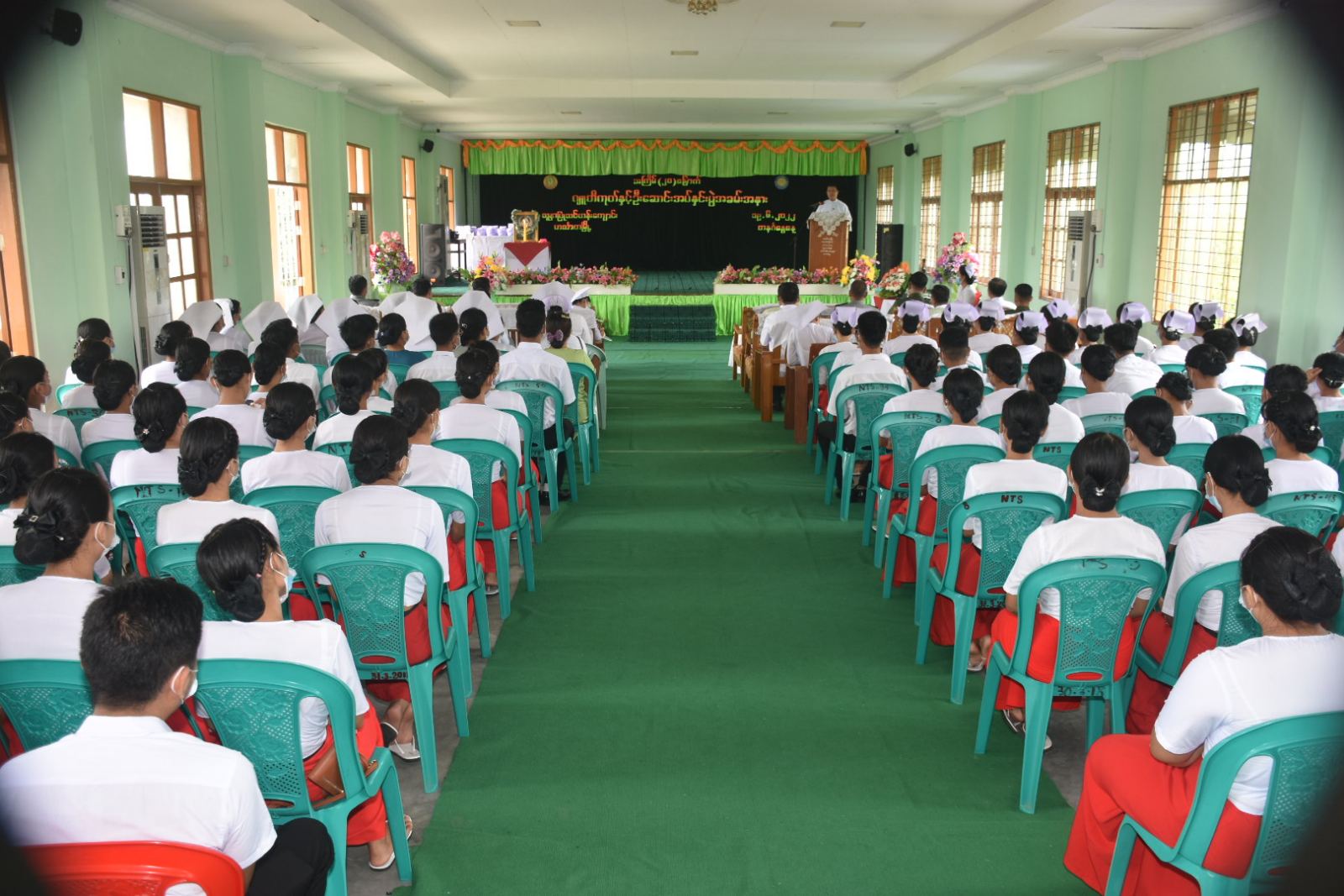 ဆက်လက်၍ ဟင်္သာတမြို့၊ သူနာပြုသင်တန်ကျောင်း၊ ကျောင်းအုပ်ဆရာမကြီးမှ ဂျူတီကုတ်နှင့် ဦးဆောင်းအပ်နှင်းရခြင်းအကြောင်းအား ရှင်းလင်းတင်ပြခဲ့ပြီး သင်တန်းသားသင်တန်းသူများအားဂျူတီကုတ်နှင့် ဦးဆောင်းအပ်နှင်းခဲ့ပါသည်။ ထို့နောက် သင်တန်းသားသင်တန်းသူ များ မှဆီမီးထွန်းညှိခြင်းနှင့်သူနာပြုသစ္စာဓိဌာန်ရွတ်ဆို ခဲ့ကြပါသည်။ ဆက်လက်၍ တိုင်းဒေသကြီးဝန်ကြီးချုပ်မှ အပတ်စဉ်(၂၀)၊ သူနာပြု-သားဖွားဒီပလိုမာ(၃)နှစ်သင်တန်း၊ ပထမနှစ် သင်တန်းတွင် ဆုရရှိခဲ့ကြသည့် သင်တန်းသားသင်တန်းသူများအား ဆုများအသီးသီးချီးမြှင့်၍ သင်တန်းကျောင်းအတွက် ထောက်ပံ့ငွေများပေးအပ်ခဲ့ပါသည်။ ထို့နောက် သင်တန်းသားတစ်ဦးမှ ကျေးဇူးတင်စကားပြန်လည်ပြောကြားခဲ့ကာ စုပေါင်းမှတ်တမ်းဓာတ်ပုံများရိုက်ကူးခဲ့ကြကာ သင်တန်းသားသင်တန်းသူများ၏ ဖျော်ဖြေမှုများကို ကြည့်ရှုအားပေးခဲ့ကြပါသည်။