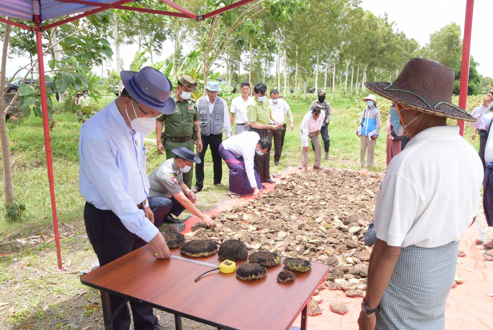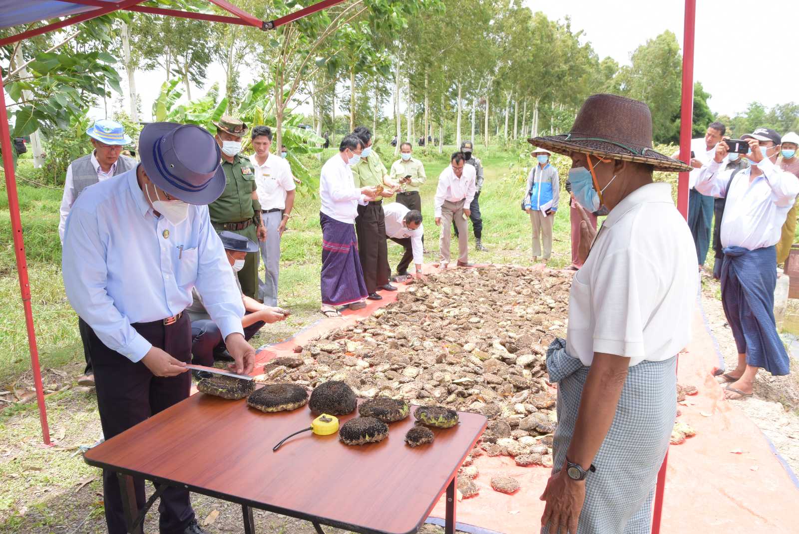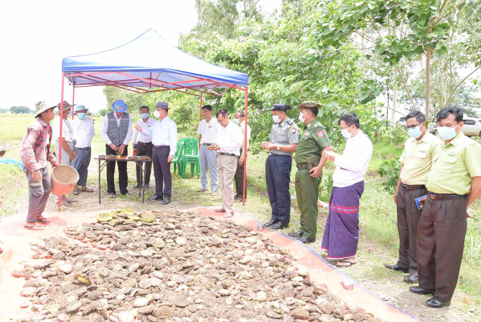 ဆက်လက်၍ ခရိုင်စိုက်ပျိုးရေးဦးစီးဌာနမှူးမှ မိုးရာသီနေကြာ မျိုးစေ့ထုတ်စိုက်ပျိုးဆောက်ရွက်နေမှုများအားရှင်းလင်းတင်ပြခဲ့ပြီးနောက် တိုင်းဒေသကြီးဝန်ကြီးချုပ်မှ မြန်အောင်မြို့နယ်ရှိ မိုးရာသီနေကြာ မျိုးစေ့ထုတ်စိုက်ပျိုးသည့်တောင်သူများအတွက် ဓာတ်မြေသြဇာ အိတ် ၁၃၀၀ ကို ထောက်ပံ့ပေးအပ်ခဲ့ပြီး ဒေသခံတောင်သူတစ်ဦးမှ ကျေးဇူးတင်စကားပြန်လည်ပြောကြားခဲ့သည်။ ထို့နောက် မြန်အောင်မြို့နယ်၊ ကဇွန်းခုံကျေးရွာ၊ မိုးရာသီနေကြာ မျိုးစေ့ထုတ်စံပြ(၅)ဧက စိုက်ခင်းရှိ တောင်သူဦးစိန်ကြည်ပါ (၂)ဦး၏ မိုးရာသီနေကြာ မျိုးစေ့ထုတ်စိုက်ခင်းနှင့် ဘုရားငုတ္တိုကျေးရွာ၊ တောင်သူဦးအောင်မြင့်စိန်၏ မိုးရာသီနေကြာ မျိုးစေ့ထုတ်စိုက်ခင်းများ ဖြစ်ထွန်းအောင်မြင်မှုများကို ကြည့်ရှုအားပေးခဲ့သည်။