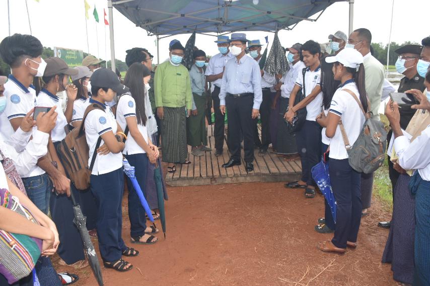 ထို့နောက် ပျိုးဗန်းဖြင့်ပျိုးထောင်ထားသည့်ပျိုးပင်များကို ကောက်စိုက်စက်ဖြင့်စိုက်ပျိုးခြင်း ကွင်းသရုပ်ပြပွဲသို့ လာရောက်လေ့လာကြသည့် အစိုးရစက်မှုလက်မှုသိပ္ပံ ကျောင်းအုပ်ကြီးနှင့် သင်တန်းသူသင်တန်းများနှင့်တွေ့ဆုံ၍ လယ်ယာကဏ္ဍဖွံ့ဖြိုးတိုးတက်ရေးအတွက် စက်မှုလယ်ယာသို့ပြောင်းလဲဆောင်ရွက်လျက်ရှိရာ စက်ပစ္စည်းကိရိယာများပြုပြင်ဆောင်ရွက်ခြင်း၊ ကျွမ်းကျင်စွာကိုင်တွယ်အသုံးပြုခြင်းသည်လွန်စွာအရေးပါပါကြောင်း၊ ဆရာ၊ဆရာမများ၏ သင်ကြားပို့ချမှုများကို စနစ်တကျလေ့လာမှတ်သားပြီး လက်တွေ့လုပ်ငန်းခွင်တွင်ပြန်လည်အသုံးချနိုင်ရေး၊ အဆင််မြင့်ပညာများဆက်လက်သင်ကြားနိုင်ရေး ကြိုးစားဆောင်ရွက်ကြရန်လိုပါကြောင်းနှင့် တိုင်းဒေသကြီးနှင့် နိုင်ငံတော်အတွက် အားထားရသည့် စက်မှုလက်မှုပညာရှင်များဖြစ်ကြစေရေးကြိုးစားဆောင်ရွက်ကြရန် မှာကြားခဲ့ပြီး လိုအပ်သည်များတင်ပြမှုအပေါ် သက်ဆိုင်ရာဌာနများနှင့်ပေါင်းစပ်ဆောင်ရွက်ပေးခဲ့ပါသည်။