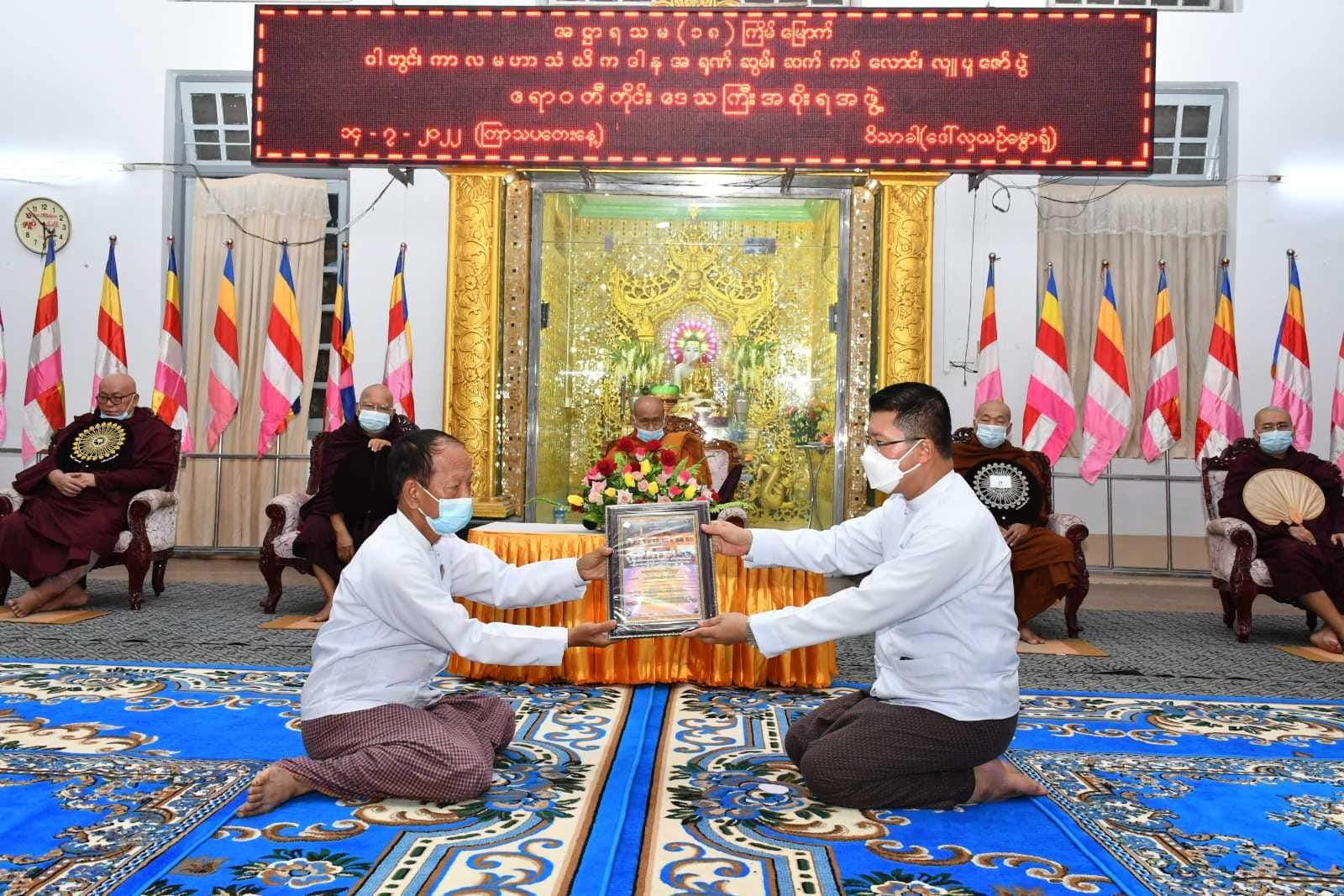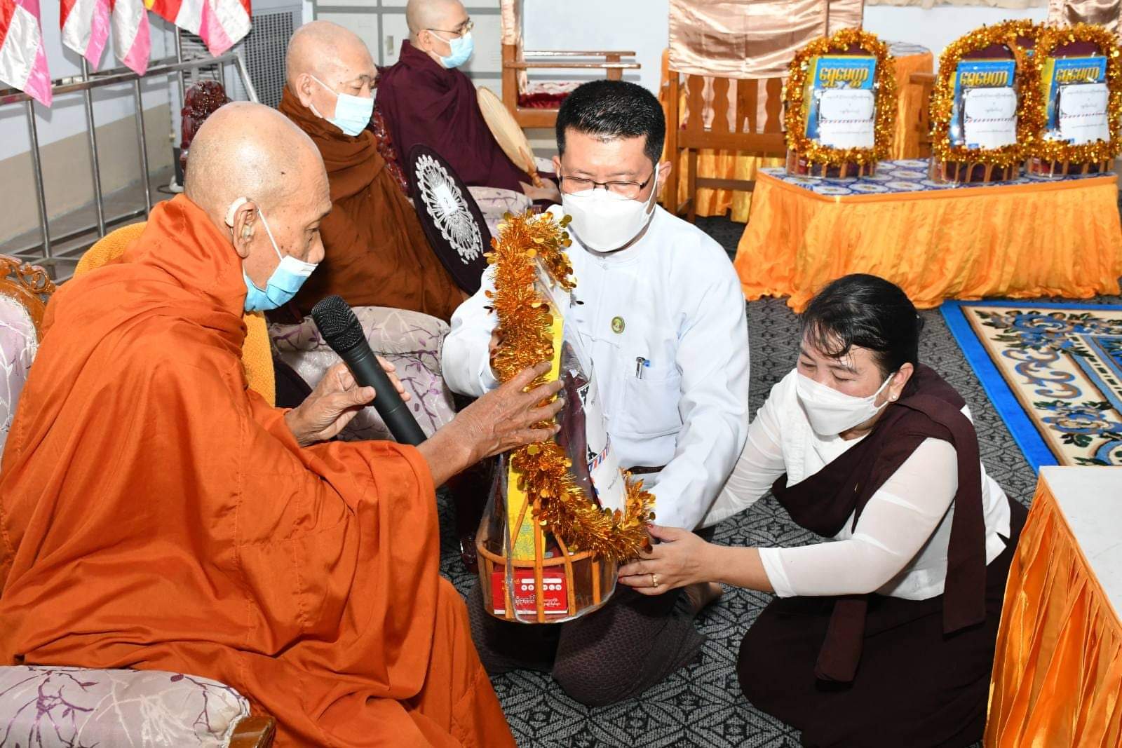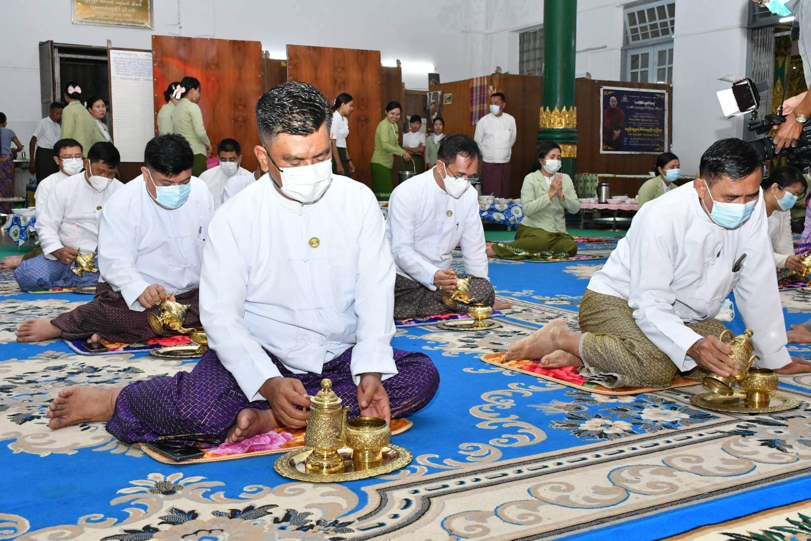 ဆက်လက်၍ အရုဏ်ဆွမ်းလောင်းလှူပူဇော်ပွဲအပြီးတွင် ပုသိမ်မြို့ရှိထေရ်ကြီးဝါကြီး သံဃာတော်အရှင်သူမြတ်ငါးပါးတို့ကို ဝါဆိုသင်္ကန်းနှင့် လှူဖွယ်ပစ္စည်းများဆက်ကပ်ခြင်းနှင့်ဝါတွင်းကာလ မဟာသံဃိကဒါန အရုဏ်ဆွမ်းလောင်းလှူပူဇော်ပွဲ ရေစက်ချမင်္ဂလာအခမ်းအနားကို “နမောတဿ” (၃)ကြိမ်ရွတ်ဆို ဘုရားကန်တော့၍ဖွင့်လှစ်ခဲ့ပြီး နိုင်ငံတော်ဩဝါဒစရိယ၊ ပုသိမ်မြို့၊ နိဂြောဓာရုံညောင်ပင်သာပရိယတ္တိစာသင်တိုက် ပဓာန နာယကဆရာတော် အဂ္ဂမဟာပဏ္ဍိတ၊အဂ္ဂမဟာသဒ္ဓမ္မဇောတိကဓဇ၊အဘိဓဇမဟာရဌဂုရု ဘဒ္ဒန္တဝိဿုတ မဟာထေရ် အရှင်သူမြတ်ထံမှ ဝန်ကြီးချုပ်နှင့်ဧည့်ပရိသတ်များက ငါးပါးသီလ ခံယူဆောက်တည်ကြကာ ဆရာတော်သံဃာတော်အရှင်သူမြတ်များ ရွတ်ပွားသရဇ္ဈာယ် ချီးမြှင့်တော်မူသော ပရိတ်တရားတော်များအားဆက်လက်နာယူ ကြည်ညိုကြသည်။ ယင်းနောက် အခမ်းအနားသို့ ကြွရောက်တော်မူလာကြသော ဆရာတော်သံဃာတော် အရှင်သူမြတ်များအား တိုင်းဒေသကြီး ဝန်ကြီးချုပ်နှင့်ဇနီး၊အစိုးရအဖွဲ့ဝင် ဝန်ကြီးများနှင့်ဇနီးများက ဝါဆိုသင်္ကန်းနှင့် လှူဖွယ်ဝတ္ထုပစ္စည်းများနှင့် အသီးသီးဆက်ကပ်လှူဒါန်းခဲ့ကြသည်။