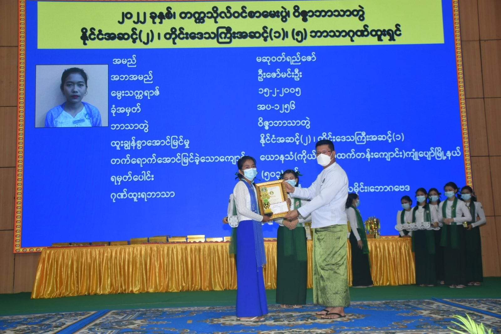 ဆက်လက်၍ ဆုချီးမြှင့်ပွဲ အခမ်းအနားအား ပြုလုပ်ရာ တိုင်းဒေသကြီးဝန်ကြီးချုပ်မှ တစ်နိုင်ငံလုံးတွင် တက္ကသိုလ်ဝင်စာမေးပွဲ အောင်ချက် (၅၂.၁၆)ရာခိုင်နှုန်းဖြင့် အောင်ချက်အကောင်းဆုံး ဒုတိယဆုအား တိုင်းဒေသကြီးပညာရေးမှူးအား ချီးမြှင့်ခဲ့ပြီး တိုင်းဒေသကြီး ဝန်ကြီးချုပ်နှင့်ဇနီးတို့က၂၀၂၂ခုနှစ်၊တက္ကသိုလ်ဝင်စာမေးပွဲတွင် အောင်ချက်အကောင်းဆုံးဆုရ (ပထမ၊ ဒုတိယ၊တတိယ)ဆုရရှိသည့် ခရိုင်၊မြို့နယ် နှင့်ကျောင်းများ၊ နိုင်ငံအဆင့် ထူးချွန်စွာ အောင်မြင်ခဲ့သည့် ကျောင်းသား၊ကျောင်းသူများအားလည်းကောင်း၊တိုင်းဒေသကြီးအဆင့် ထူးချွန်စွာအောင်မြင်ခဲ့သူများအား အနောက်တောင်တိုင်းစစ်ဌာနချုပ် တိုင်းမှူးကလည်းကောင်း၊ တက္ကသိုလ်ဝင် စာမေးပွဲတွင် (၆)ဘာသာ ဂုဏ်ထူးရရှိသူများအား တိုင်းဒေသကြီးအစိုးရအဖွဲ့လုံခြုံရေးနှင့်နယ်စပ်ရေးရာဝန်ကြီးကလည်းကောင်း၊ (၅)ဘာသာဂုဏ်ထူးရရှိသူများအား တိုင်းဒေသကြီးအစိုးရအဖွဲ့စီးပွားရေးရာဝန်ကြီး၊ သယံဇာတရေးရာဝန်ကြီး၊ လူမှုရေးရာဝန်ကြီး၊ လမ်းပန်းဆက်သွယ်ရေးဝန်ကြီး၊ တိုင်းရင်းသားရေးရာဝန်ကြီး၊ တိုင်းဒေသကြီးအစိုးရအဖွဲ့အတွင်းရေးမှူး၊တိုင်းဒေသကြီးတရားသူကြီးချုပ်၊ ပုသိမ်တက္ကသိုလ်ပါမောက္ခချုပ်နှင့် တိုင်းဒေသကြီးပညာရေးမှူးကလည်းကောင်း၊(၄)ဘာသာဂုဏ်ထူးရရှိသူများအား တိုင်းဒေသကြီးအစိုးရအဖွဲ့စီးပွားရေးရာဝန်ကြီး၏ဇနီး၊ သယံဇာတရေးရာဝန်ကြီး၏ဇနီး၊ လမ်းပန်းဆက်သွယ်ရေးဝန်ကြီး၏ဇနီး၊ အစိုးရအဖွဲ့အတွင်းရေးမှူး၏ဇနီးတို့က အသီးသီးပေးအပ်ချီးမြှင့်ခဲ့ကြသည်။