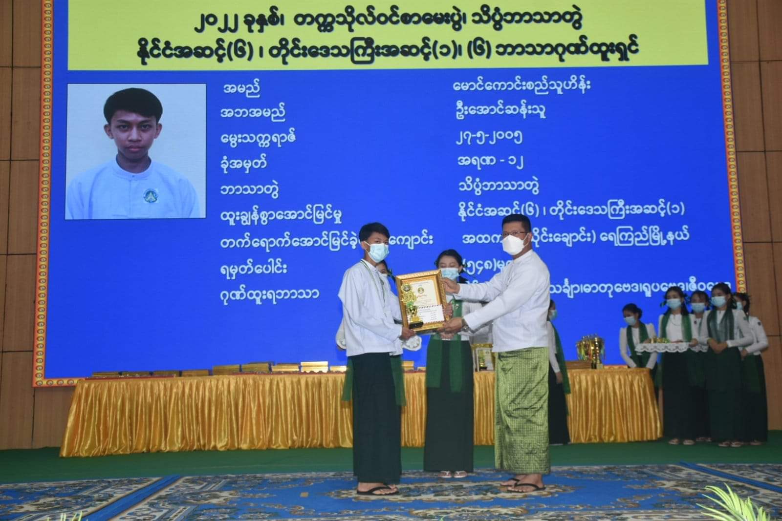 ဦးစွာ အခမ်းအနားအား အမှတ်(၇)အခြေခံပညာအထက်တန်းကျောင်းမှ ကျောင်းသား၊ ကျောင်းသူများက“ မြန်မာ့ကျောင်း”သီချင်းဖြင့် သီဆိုဖျော်ဖြေဖွင့်လှစ်ခဲ့ပြီး တိုင်းဒေသကြီး ဝန်ကြီးချုပ်က “ ၂၀၂၂ခုနှစ် တက္ကသိုလ်စာမေးပွဲတွင် ထူးချွန်သူများအား ဂုဏ်ပြုသော အခမ်းအနားဖြစ်သောကြောင့် ဂုဏ်ပြုထိုက်သူများဂုဏ်ပြုခြင်းဖြစ်ပါကြောင်း၊ ယနေ့လူငယ် နောင်ဝယ်လူကြီးဟုသည့် စကားအတိုင်း နိုင်ငံ့တာဝန်အား ပုခုံးပြောင်းထမ်းဆောင်မည့် ကျောင်းသားလူငယ်များသည် ငယ်စဉ်ကာလကပင်ထူးချွန်ထက်မြက်၍ ဗလငါးတန်နှင့်ပြည့်စုံပြီး ပညာပြည့်ဝ နှလုံးလှသူများဖြစ်ကြရမှာဖြစ်ပါကြောင်း၊ တက္ကသိုလ်စာမေးပွဲတွင် အောင်ချက်မြင့်မားတိုးတက်လာစေရန် တိုင်းဒေသကြီး၊ ခရိုင်၊မြို့နယ်၊ ပညာရေးမှူးများနှင့် အနီးကပ်ကြီးကြပ်ဆောင်ရွက်ပေးကြသော ကျောင်းအုပ်ကြီးများအပါအဝင် ဆရာ၊ဆရာမများ၏ သင်ကြားမှုအောက်တွင် ကျောင်းသား၊ကျောင်းသူများ၏ ကြိုးစားသင်ယူမှုများ၏ ရလာဒ်ပင်ဖြစ်ပါကြောင်း၊ပညာရေးသည် လူသားအရင်းအမြစ်ဖွံ့ဖြိုး တိုးတက်မှု၏ အခြေခံအုတ်မြစ်ဖြစ်သလို အကောင်းဆုံးသောရင်နှီးမြုပ်နှံလည်းဖြစ်ပါကြောင်း၊ နိုင်ငံတော်မှ အခြေခံပညာမူလတန်း၊အလယ်တန်းနှင့် အထက်တန်းအထိ အခမဲ့ပညာရေးစနစ်ဖော်ဆောင်ပေးနေသည့်အပြင် စနစ်သစ်ပညာရေးကို KG +12အထိ ဖော်ဆောင်လျက်ရှိပါကြောင်း၊ ကျောင်းအဆင့်တိုးမြှင့်ခြင်း၊ ကျောင်းဥပဓိရုပ်ကောင်းမွန်ရေးနှင့်သင်ကြားရေးအထောက်အကူပြုပစ္စည်းများ ပြည့်စုံစေရန်ဆောင်ရွက်ပေးလျက်ရှိပါကြောင်းပညာရေးကဏ္ဍဖွံ့ဖြိုးတိုးတက်ရန်အတွက် ဆရာ၊ဆရာများ၏စွမ်းရည်မြင့်မားလာမှသာ ကျောင်းသား၊ကျောင်းသူများ၏အရည်အသွေးတိုးတက်မြင့်မားလာမှာဖြစ်၍ ခေတ်စနစ်နှင့်အညီပြုပြင်ပြောင်းလဲနေသောပညာရေးစနစ်ကို မျက်ခြည်ပြတ်မခံဘဲ အစဉ်လေ့လာသင်ယူပြီး အမြဲကြိုးစားနေရမည့်ထာဝရ ကျောင်းသားကြီးများဖြစ်ပါကြောင်း၊ဆရာ၊ဆရာမများအနေဖြင့်စာပေ သင်ကြားပေးရုံသာမကလူကိုလည်းပြင်ပေးရမည်ဖြစ်ရာ ကျောင်းသား၊ကျောင်းသူများအား စာရိတ္တကောင်းမွန်ရေး၊ စည်းကမ်းလိုက်နာစေရေး၊ ပြည်ထောင်စုစိတ်ဓာတ်ရှင်သန်စေရေး၊ နိုင်ငံချစ်စိတ်၊ တိုင်းပြည်နှင့်လူမျိုးချစ်စိတ်များ တိုးပွားလာစေရေး၊ လေ့ကျင့်ပြုစုပျိုးထောင်ပေးရန်ဖြစ်ပါကြောင်း၊ ကျောင်းနေအရွယ် ကျောင်းသား၊ကျောင်းသူများ ရာနှုန်းပြည့်ကျောင်းတက်ရောက်စေရေး၊အတန်းစဉ်ကူးပြောင်းရေးတို့ကိုလည်း ကြိုးပမ်းဆောင်ရွက်သွားကြရန် လိုပါကြောင်းပြောကြားသည်။