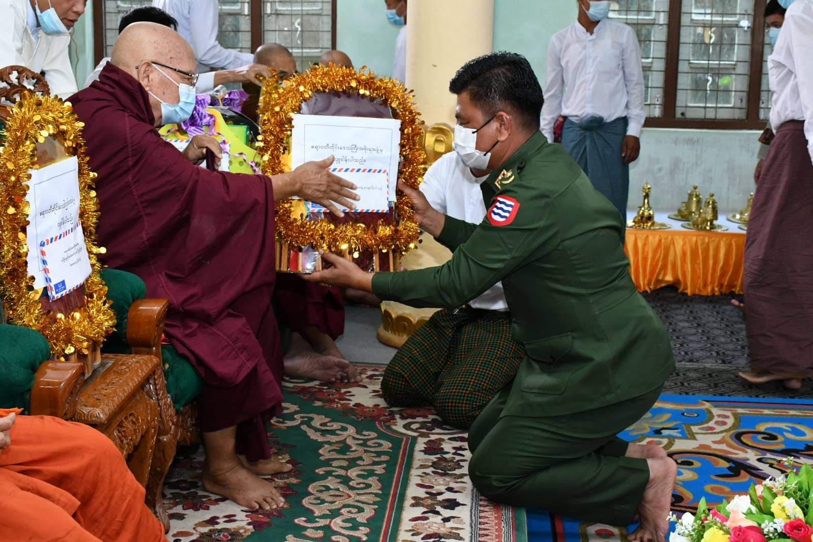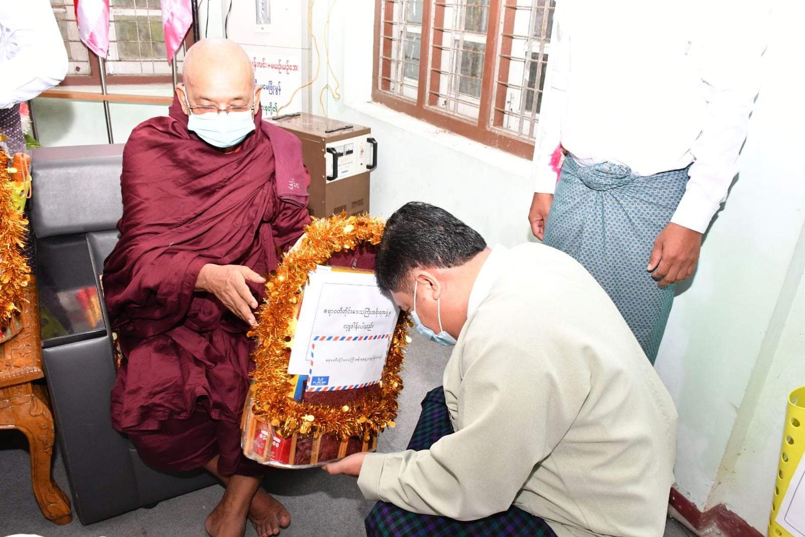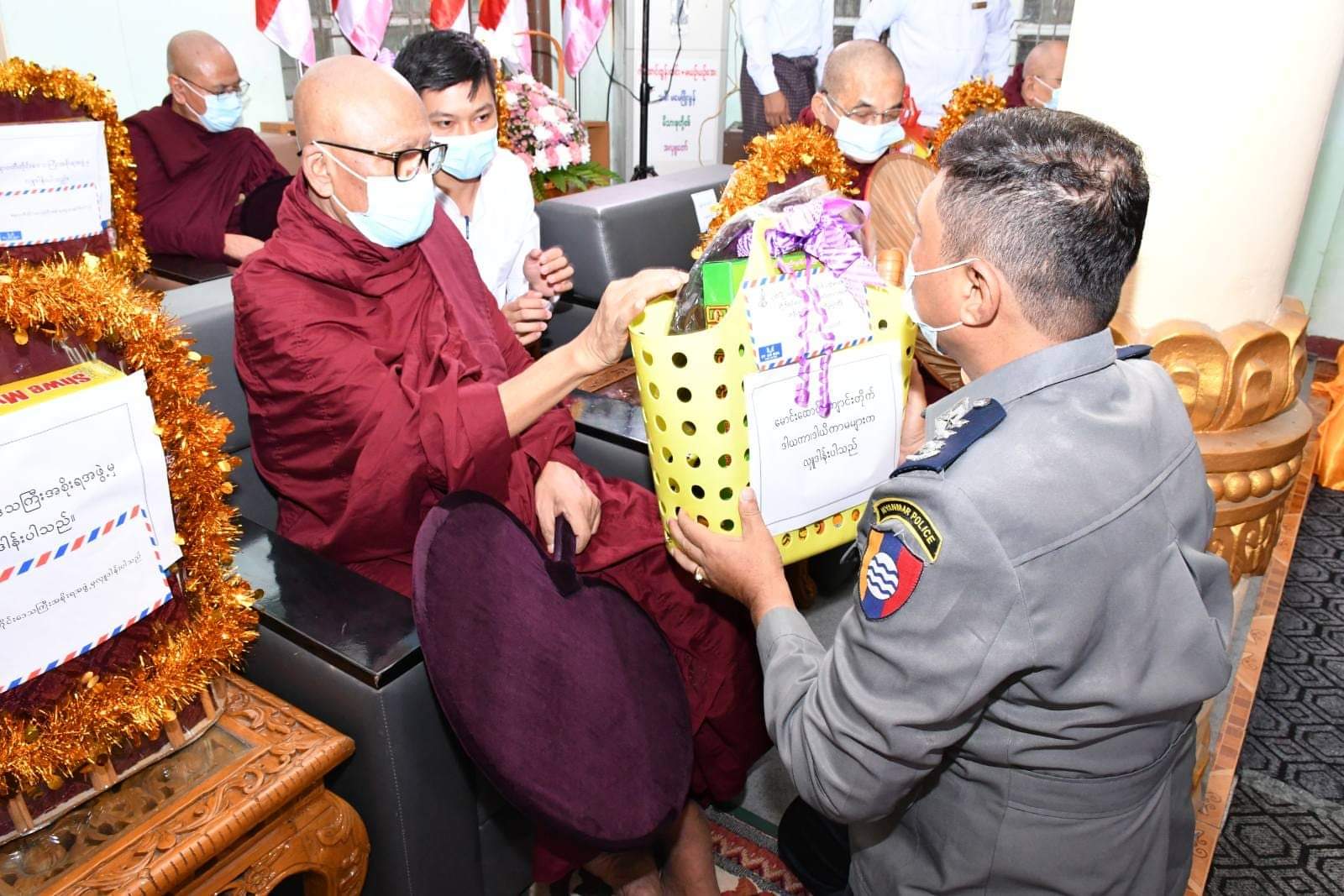 ပုသိမ်မြို့ အမှတ်(၂) ရပ်ကွက်၊နိဂြောဓာလမ်း၊မောင်းထောင်ပရိယတ္တိစာသင်တိုက်ကြီး၏ တိုက်အုပ်စာချ ကထိကဆရာတော် လဇ္ဇီပေသလ၊သိက္ခကာမ၊ဝိနယဂရုက ဖြစ်တော်မူသော တိုင်းဒေသကြီးသံဃာ့နာယကအဖွဲ့အကျိုးတော်ဆောင်(ရွှေကျင်) ဘဒ္ဒန္တမာနိတာလင်္ကာရ (သာသနဓဇဓမ္မာစရိယ၊မဟာဂန္ထဝါစကပဏ္ဍိတ၊အဂ္ဂမဟာဂန္ထဝါစကပဏ္ဍိတ၊ဒီဃဘာဏက)မဟာထေရ် ဆရာတော်ကြီး၊ သက်တော် (၇၁) နှစ်၊ သိက္ခာတော် (၅၁)ဝါ၏ အန္တိမအဂ္ဂိဈာပန သာဓုကီဠနပူဇာသဘင် အခမ်းအနားအစီအစဉ် ပထမပိုင်းကို ယနေ့နံနက်ပိုင်းက ပုသိမ်မြို့ အမှတ်(၂) ရပ်ကွက်၊ နိဂြောဓာလမ်း၊ မောင်းထောင်ပရိယတ္တိစာသင်တိုက်ကြီး၌ ကျင်းပပြုလုပ်ရာ တိုင်းဒေသကြီးအစိုးရအဖွဲ့ ဝန်ကြီးချုပ်ဦးတင်မောင်ဝင်း၊ အနောက်တောင်တိုင်းစစ်ဌာနချုပ်တိုင်းမှူး ဗိုလ်ချုပ်အောင်အောင်၊ တိုင်းဒေသကြီးအစိုးရအဖွဲ့ဝင်များ၊ ရဟန်းရှင်လူပရိတ်သတ်များတက်ရောက် ဖူးမြော်ကြည်ညိုကြပါသည်။