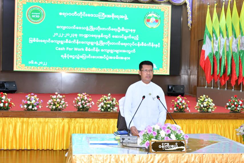 ဧရာဝတီတိုင်းဒေသကြီး ဝန်ကြီးချုပ်ဦးတင်မောင်ဝင်းသည် ယနေ့နေ့လည်ပိုင်းတွင် ပုသိမ်မြို့၊ ဧရာရွှေဝါခန်းမ၌ ကျင်းပပြုလုပ်သည့် သမဝါယမနှင့်ကျေးလက်ဖွံ့ဖြိုးရေးဝန်ကြီးဌာန၊ ကျေးလက်ဒေသဖွံ့ဖြိုးတိုးတက်ရေးဦးစီးမှ ၂၀၂၂- ၂၀၂၃ ဘဏ္ဍာနှစ်တွင် အကောင်အထည်ဖော်ဆောင်ရွက်သည့် မြစိမ်းရောင်ကျေးရွာစီမံကိန်း၊ ကျေးရွာဖွံ့ ဖြိုးတိုးတက်ရေးလုပ်ငန်းစီမံကိန်း (VDP)နှင့် Cash for work ကျေးရွာတို့အတွက် စီမံကိန်းရန်ပုံငွေပေးအပ်ပွဲအခမ်းအနားတက်ရောက်၍ အမှာစကားပြောကြားခဲ့ရာ တိုင်းဒေသကြီး၏ ဒေသဖွံ့ဖြိုးရေးလုပ်ငန်းများကို ဘဏ္ဍာစိုက်ပျိုးမွေးမြူရေးလုပ်ငန်းများပိုမိုဖြစ်ထွန်းအောင်မြင်နိုင်မည့်အလားအလင့်နှစ်စဉ်ချထားဆောင်ရွက်ပေးလျက်ရှိပါကြောင်း၊ မိမိတို့တိုင်းဒေသကြီးသည် ရေခံမြေခံကောင်းမွန်ပြီး စိုက်ပျိုးမွေးမြူရေးလုပ်ငန်းများပိုမိုဖြစ်ထွန်းအောင်မြင်နိုင်မည့်အလားအလာကောင်းများရှိနေပါကြောင်း၊ ဒေသခံပြည်သူများ၏ လူမှုစီးပွားဘဝဖွံ့ဖြိုးတိုးတက်စေရေးရည်ရွယ်၍ လမ်းပန်းဆက်သွယ်မှုကောင်းမွန်စေရေး၊ လျှပ်စစ်မီးရရှိစေရေး၊ ရေပေးဝေရေး၊ ကုန်ထုတ်လမ်းဖောက်လုပ်သွားလာအသုံးပြုနိုင်စေရေးစသည့် ဒေသဖွံ့ဖြိုးရေးလုပ်ငန်းများတွင် ဒေသခံပြည်သူများကိုယ်တိုင်အကောင်အထည်ဖော် ဆောင်ရွက်နိုင်ရေးထောက်ပံ့ပေးခြင်းဖြစ်ပါကြောင်း၊ ဒေသဖွံ့ဖြိုးရေးလုပ်ငန်းများဆောင်ရွက်မည့်ကော်မတီများအနေဖြင့် မိမိတို့ဒေသဖွံ့ဖြိုးတိုးတက်စေရေးစိတ်ရင်းစေတနာကောင်းများဖြင့်ဆောင်ရွက်ကြရန်၊ သက်ဆိုင်ရာလုပ်ငန်းများအလိုက် စာရင်းဇယားများစနစ်တကျထားရှိဆောင်ရွက်ကြရန်နှင့် သက်ဆိုင်ရာဌာနများမှ စီမံကိန်းများအောင်မြင်စေရေး စစ်ဆေးကြပ်မက်ဆောင်ရွက်ရန်လိုပါကြောင်း ပြောကြားခဲ့ပါသည်။