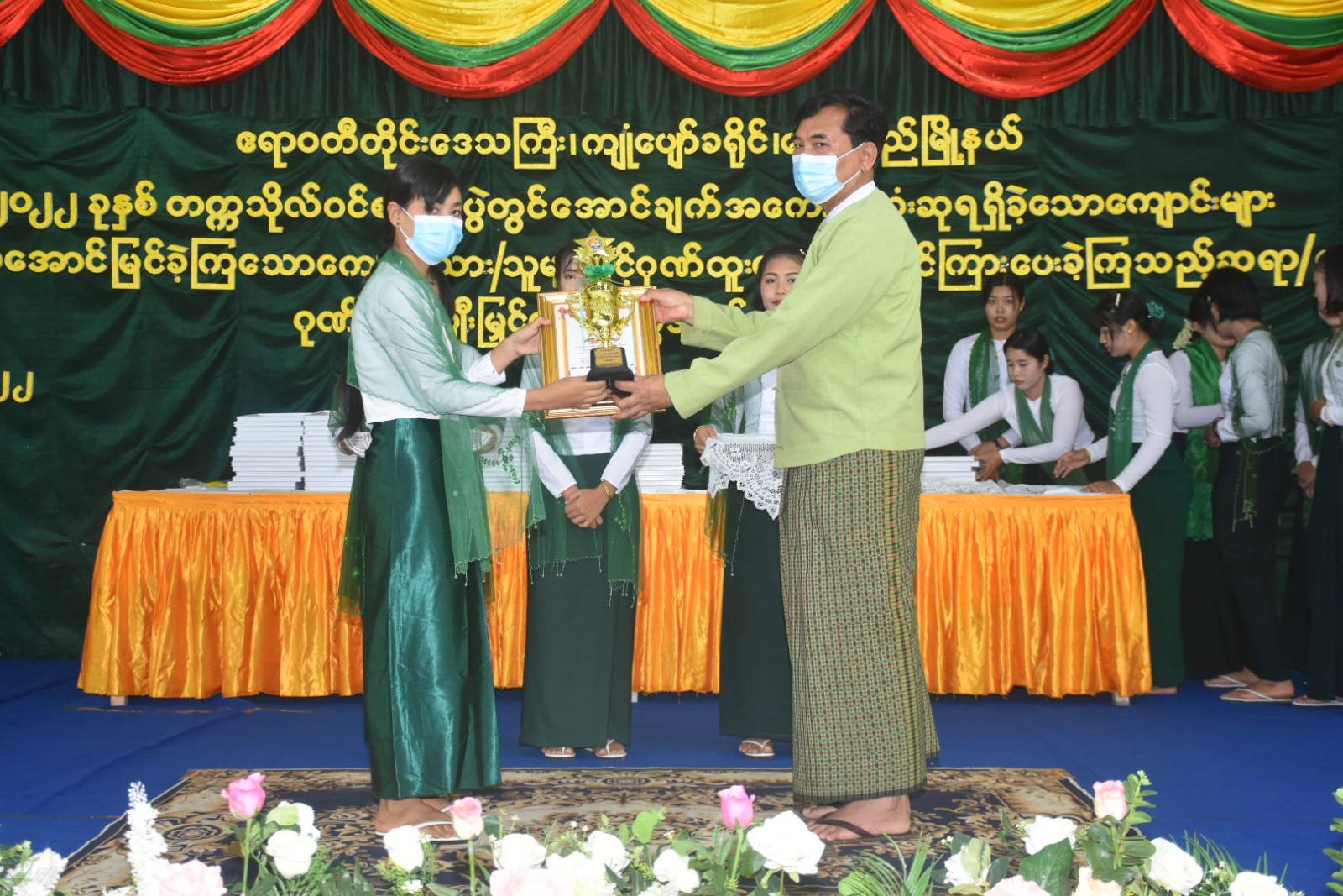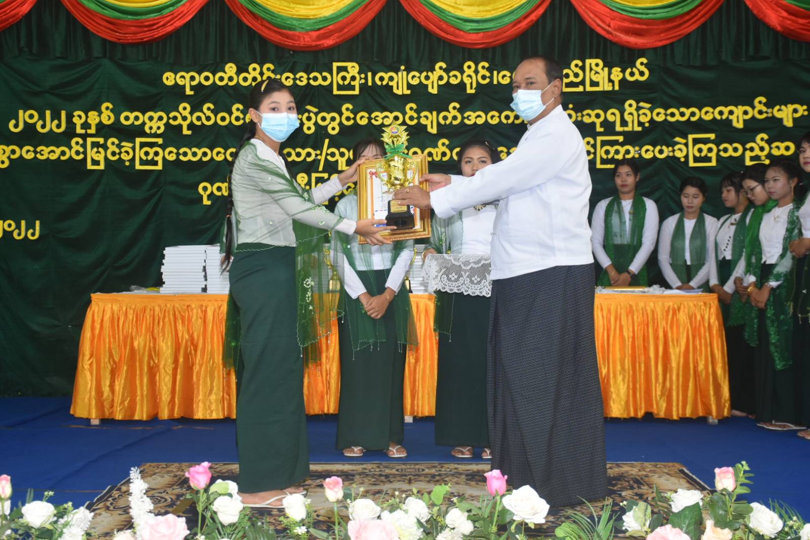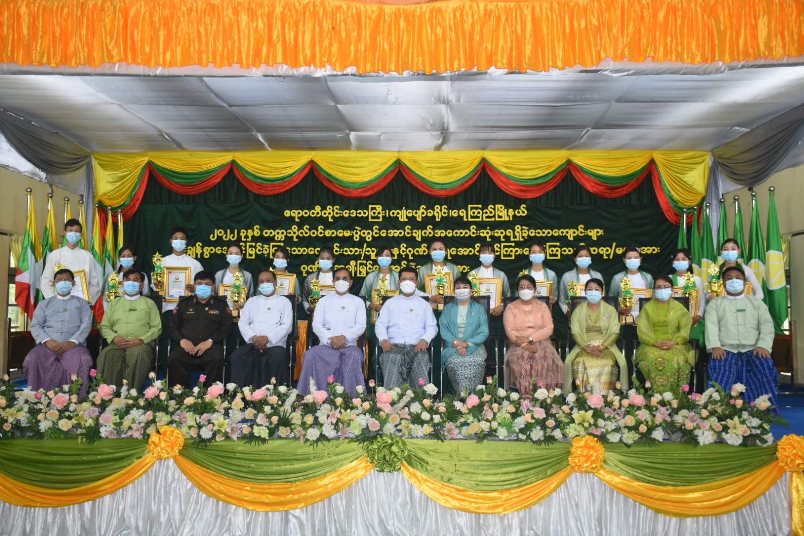 ဆက်လက်၍ ဆုချီးမြှင့်ပွဲအခမ်းအနားအား ပြုလုပ်ရာ တိုင်းဒေသကြီးဝန်ကြီးချုပ်မှ ရေကြည်မြို့နယ်ရှိ တက္ကသိုလ်ဝင်စာမေးပွဲတွင် အောင်ချက်အကောင်းဆုံး ကျောင်း(၃)ကျောင်း၊ သိပ္ပံဘာသာတွဲတွင် တစ်နိုင်ငံလုံးအဆင့်(၆)၊တိုင်းဒေသကြီးအတွင်း အဆင့်(၁)၊ (၆)ဘာသာဂုဏ်ထူးရှင်(၁)ဦးအပါအဝင် (၆)ဘာသာဂုဏ်ထူးရှင်(၄) ဦးတို့အား လည်းကောင်း၊ တိုင်းဒေသကြီးဝန်ကြီးချုပ်၏ ဇနီးမှ (၅)ဘာသာဂုဏ်ထူးရရှိသူ(၄)ဦးအားလည်းကောင်း၊ တိုင်းဒေသကြီးအစိုးရအဖွဲ့ စီးပွားရေးရာဝန်ကြီးမှ (၅)ဘာသာဂုဏ်ထူးရရှိသူ(၄)ဦးအားလည်းကောင်း၊ သယံဇာတရေးရာဝန်ကြီး၊လူမှုရေးရာဝန်ကြီး၊ တိုင်းဒေသကြီးအစိုးရအဖွဲ့ အတွင်းရေးမှူးတို့မှ (၄)ဘာသာဂုဏ်ထူးရရှိသူများအား လည်းကောင်း၊ တိုင်းဒေသကြီးအစိုးရအဖွဲ့ စီးပွားရေးရာဝန်ကြီး၏ဇနီး၊ သယံဇာတရေးရာဝန်ကြီး၏ဇနီး၊ အစိုးရအဖွဲ့ အတွင်းရေးမှူး၏ ဇနီး၊ တိုင်းဒေသကြီးပညာရေးမှူး၊ တိုင်းဒေသကြီးလမ်းဦးစီးဌာနမှူး၊ တိုင်းဒေသကြီး ကျန်းမာရေးဒုတိယတိုင်းဦးစီးမှူး၊ ကျုံပျော်ခရိုင်အုပ်ချုပ်ရေးမှူး၊ ရေကြည်မြို့နယ်စီမံအုပ်ချုပ်ရေးအဖွဲ့ဥက္ကဋ္ဌနှင့် မြို့နယ်ပညာရေးမှူးတို့က ဂုဏ်ထူးဖြင့်အောင်မြင်အောင်သင်ကြားပေးခဲ့သည့် ဆရာ၊ဆရာမများအားလည်းကောင်း ဂုဏ်ပြုဆုများအသီးသီးပေးအပ်ချီးမြှင့်ခဲ့ကြသည်။