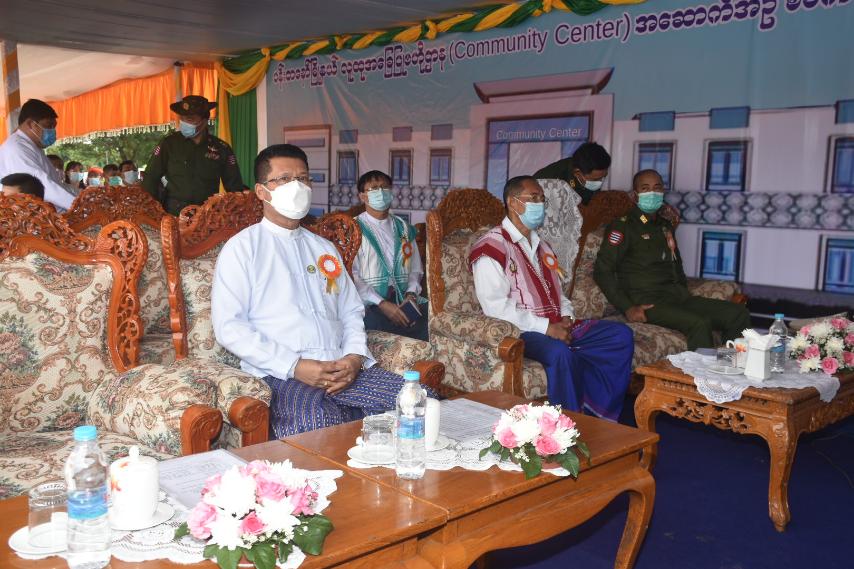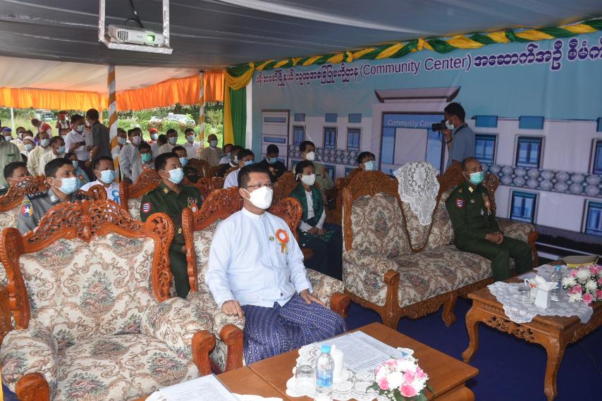 ဆက်လက်၍ တိုင်းဒေသကြီးဝန်ကြီးချုပ်မှ မိမိတို့တိုင်းဒေသကြီးသည် ကျေးလက်ဒေသကိုအခြေခံပြီး စိုက်ပျိုးမွေးမြူရေးလုပ်ငန်းများဖြင့်နိုင်ငံတော်တာဝန်များသယ်ပိုးဆောင်ရွက်ပေးနေသည့်တိုင်းဒေသကြီးဖြစ်ပါကြောင်း၊ ယနေ့ပြုလုပ်သည့် လူထုအခြေပြုဗဟိုဌာန(Community Centre) တည်ဆောက်ပြီးစီးပါက ဒေသအတွက် စိုက်ပျိုးမွေးမြူရေး၊ ပညာရေး၊ကျန်းမာရေးစသည့် အသိပညာဗဟုသုတများကို ရှာဖွေလေ့လာနိုင်ပြီး အတွေ့အကြုံဗဟုသုများကိုဆွေးနွေးဖလှယ်နိုင်မှာဖြစ်ပါကြောင်း၊ ထိုမှတစ်ဆင့် ဒေသခံပြည်သူများ၏ လူမှုစီးပွားဘဝဖွံ့ဖြိုးတိုးတက်ရေး နည်းလမ်းကောင်းများအဖြေရှာဆောင်ရွက်နိုင်ကြမှာဖြစ်ပါကြောင်း၊ လူ့စွမ်းအားအရင်းအမြစ်များမွေးထုတ်ပေးနိုင်ရေးနှင့် ဒေသအတွက်အမှန်တကယ်အကျိုးရှိသည်ဖြစ်၍ အရည်အသွးပြည့်မီကောင်းမွန်သည့် အဆောက်အဦဖြစ်စေရေး၊လုပ်ငန်းများမြန်ဆန်စွာအကောင်အထည်ဖော်လည်ပတ်နိုင်စေရေးနှင့် မြို့နယ်၊ ခရိုင်၊ တိုင်းဒေသကြီး၏ ကျက်သရေဆောင် လူထု အခြေပြုဗဟိုဌာန(Community Centre)ဖြစ်စေရေးအားလုံးကြိုးစားဆောင်ရွက်ကြရန်ပြောကြားခဲ့ပြီး ဖျော်ဖြေရေးအဖွဲ့များ၏ ကပြမှုများကိုကြည့်ရှုအားပေးခဲ့ကြကာ ဂုဏ်ပြုငွေများချီးမြှင့်ခဲ့ပါသည်။