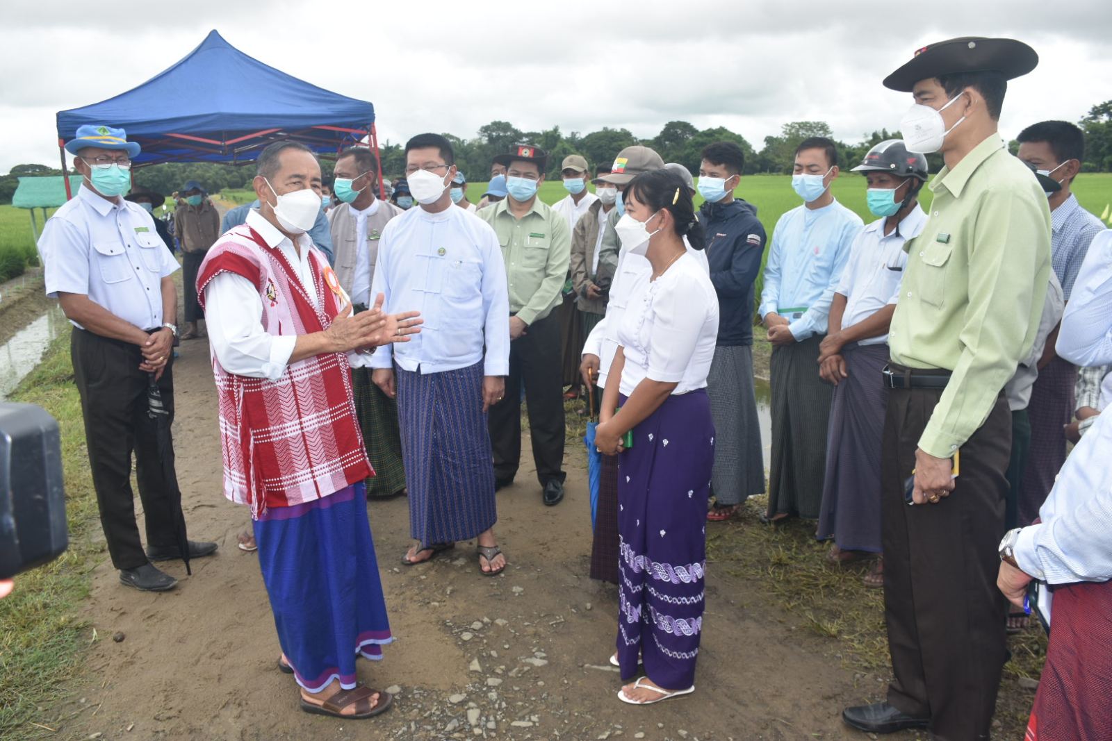 ဆက်လက်၍ နိုင်ငံတော်စီမံအုပ်ချုပ်ရေးကောင်စီအဖွဲ့ဝင် ဖဒိုမန်းငြိမ်းမောင်၊တိုင်းဒေသကြီးဝန်ကြီးချုပ်ဉီးတင်မောင်ဝင်းတို့သည် ဓနုဖြူမြို့နယ်၊နန်းတော်ကုန်းကျေးရွာ၊ ဘက်စုံအဆင်မြင့် နည်းပညာသုံးစံပြကျေးရွာ၊ ဧက၁၀၀စံပြကွက်သို့သွားရောက်၍ စိုက်ပျိိုးရေးဦးစီးဌာနမှ အဆင်မြင့် နည်းပညာသုံးစံပြကျေးရွာ၊ ဧက၁၀၀စံပြကွက်အကောင်အထည်ဖော်ဆောင်ရွက်နေမှုများကို ကြည့်ရှုအားပေးခဲ့ပြီး တိုင်းဒေသကြီးစိုက်ပျိုးရေးဦးစီးဌာနတိုင်းဦးစီးမှူးနှင့် ဗဟိုဒေသသုတေသနဗဟို(မြောင်းမြ)တာဝန်ခံတို့မှ မျိုးသန့်မျိုးစပါးထုတ်လုပ်မှု၊ စိုက်ပျိုးရေးနည်းစနစ်များ အသုံးပြု၍ စမ်းသပ်ယှဉ်ပြိုင်ကွက်များဆောင်ရွက်ထားရှိမှုနှင့် သုတေသနပြုလုပ်ငန်းများဆောင်ရွက်ထားရှိမှုများရှင်းလင်းတင်ပြခဲ့ရာ မျိုး၊မြေ၊ရေ၊နည်း မှန်ကန်စွာအသုံးပြုစေရေး၊ သစ်စိမ်းမြေသြဇာ(ပိုက်ဆံလျှော်)ထည့်သွင်းအသုံးပြုမှုများ ပိုမိုဆောင်ရွက်စေရေး၊ တောင်သူအသိပညာပေးလုပ်ငန်းများကျယ်ကျယ်ပြန့်ပြန့်ဆောင်ရွက်စေရေးနှင့် သုတေသနပြုလုပ်ငန်းများပိုမိုကောင်းမွန်အောင်ဆောင်ရွက်၍ တောင်သူများထံချပြဆွေးနွေးစေရေးမှာကြားခဲ့ကာ တောင်သူများနှင့်ရင်းရင်းတွေ့ဆုံခဲ့ပါသည်။