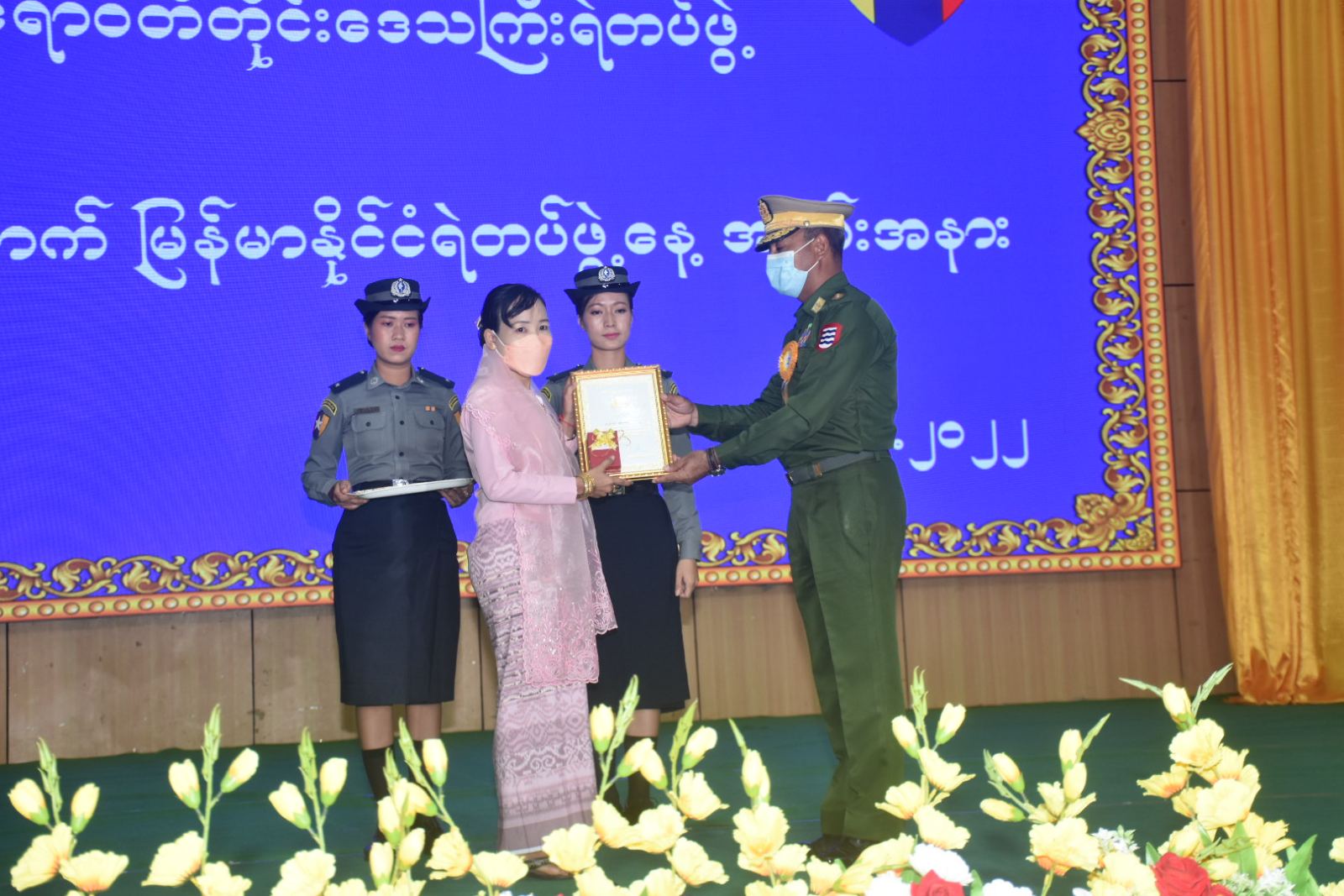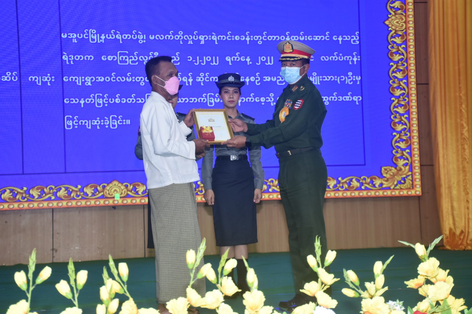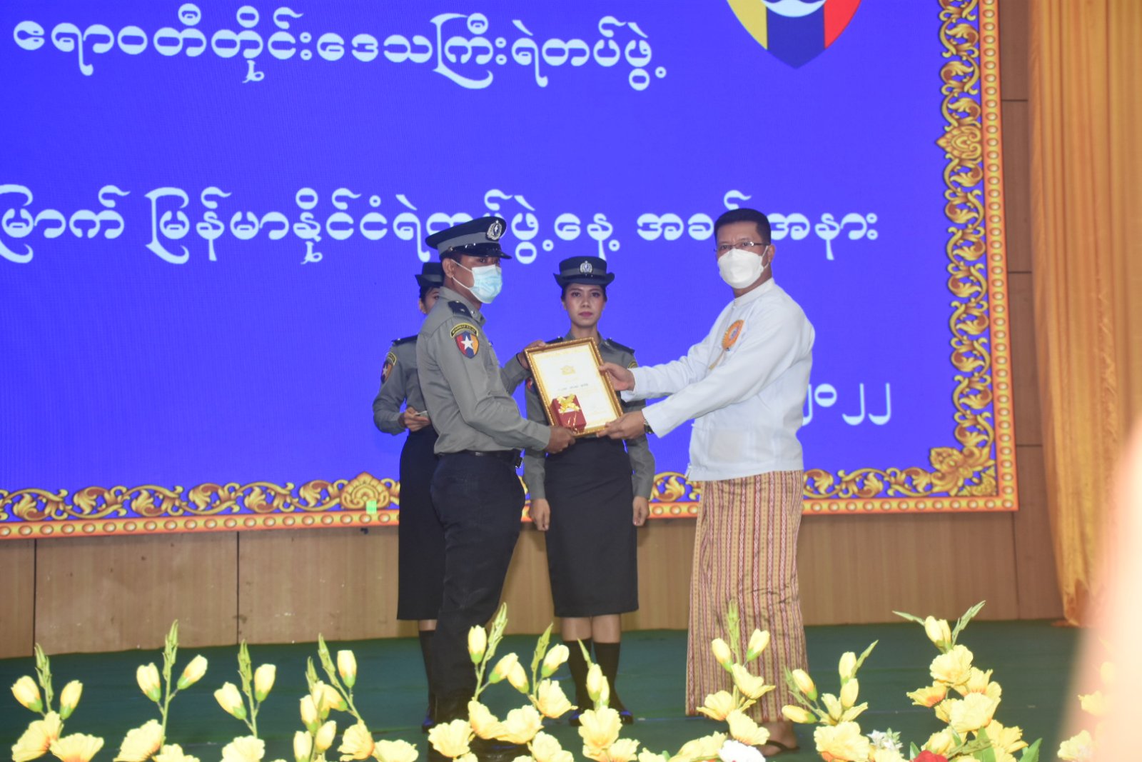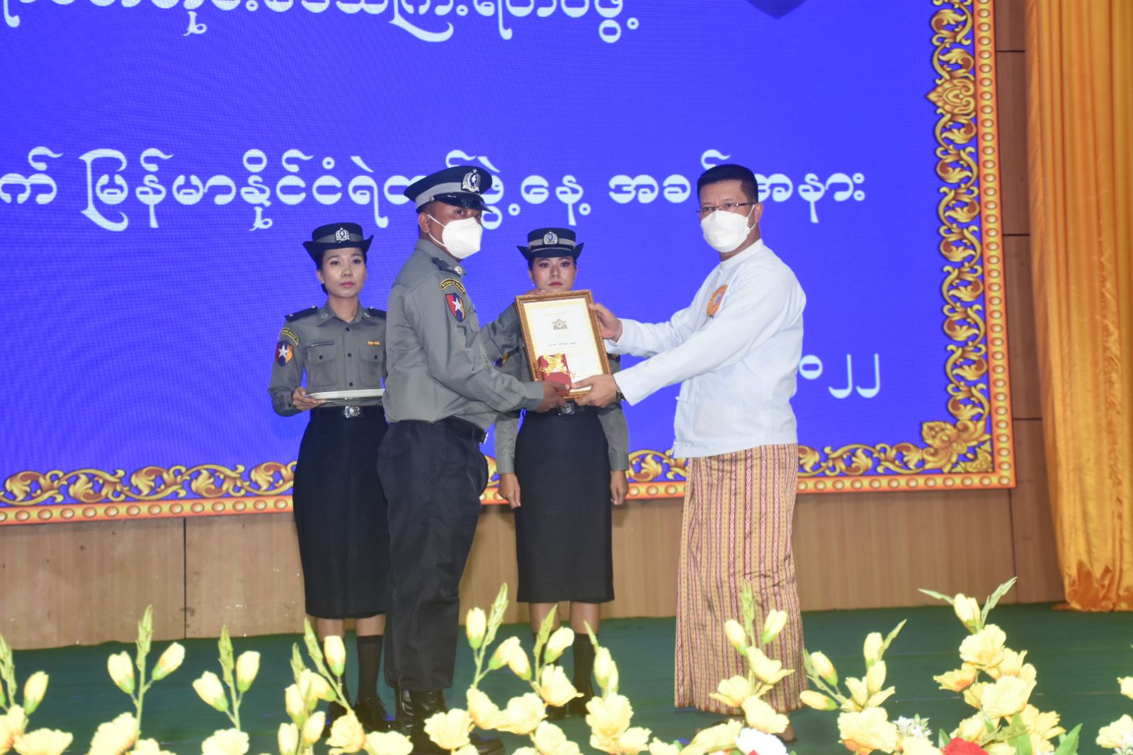 ဆက်လက်၍ ဆုရတပ်ဖွဲ့ဝင်များအားဆုချီးမြှင့်ခဲ့ရာ တိုင်းဒေသကြီးဝန်ကြီးချုပ်မှ စီမံထူးချွန်တံဆိပ်၊ ရဲသူရတံဆိပ်၊ ရဲဗလတံဆိပ်ရရှိသူများအားလည်းကောင်း၊ အနောက်တောင်တိုင်းစစ်ဌာနချုပ်တိုင်းမှူး၊ ပုသိမ်လေတပ်စခန်းဌာနချုပ်မှူးနှင့် လုံခြုံရေးနှင့်နယ်စပ်ရေးရာဝန်ကြီးတို့မှ ရဲဗလတံဆိပ်ရရှိသူများနှင့် ရဲချုပ်၏ အမှုထမ်းကောင်းလက်မှတ်ရရှိသူအားလည်းကောင်း၊ တိုင်းဒေသကြီးရဲတပ်ဖွဲ့မှူးမှ အကြမ်းဖတ်မှုတားဆီးကာကွယ်ရေးနှင့်တိုက်ဖျက်ရေးအဖွဲ့၏ဆုချီးမြှင့်ခြင်းခံရသူ နှင့်တိုင်းဒေသကြီး ရဲတပ်ဖွဲ့မှူး၏အမှုထမ်းကောင်းလတ်မှတ်ရရှိသူများအားလည်းကောင်း ဂုဏ်ပြုဆုတံဆိပ်များ အသီးသီးပေးအပ်ချီးမြှင့်ခဲ့ကြပါတယ်။ အဲဒီနောက် ရဲတပ်ဖွဲ့နေ့အထိမ်းအမှတ် Video Clip ပြသမှုအားကြည့်ရှုအားပေးခဲ့ကာအခမ်းအနားတက်ရောက်လာကြသူများနှင့်အတူ စုပေါင်းမှတ်တမ်းတင်ဓာတ်ပုံများရိုက်ကူးခဲ့ကြပြီး ရဲတပ်ဖွဲ့နေ့အထိမ်းအမှတ် ပြခန်များအား လှည့်လည်ကြည့်ရှုအားပေးခဲ့ကြပါသည်။