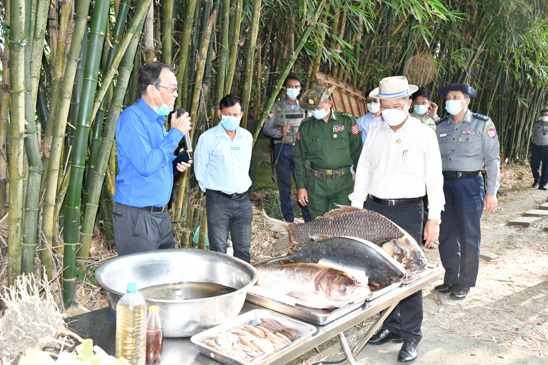 ဆက်လက်၍ မလက်တိုကျေးရွာအုပ်စု၊ တမလိုကျေးရွာရှိ ORCHARD စိုက်ပျိုးမွေးမြူရေး စီမံကိန်းသို့ရောက်ရှိခဲ့ပြီး မွေးမြူရေးကန်များအတွင်း နှစ်ချို့ ငါးကြင်း၊ ငါးခေါင်းပွ၊ မြတ်စားငါးကြင်း၊ ငါးကြင်းဖြူငါးများမွေးမြူထားရှိမှု ဝါးစိုက်ပျိုးထားရှိမှုနှင့်ဈေးကွက်ရရှိမှု၊ငါးအမိုင်နို အခြေခံသဘာဝအားဆေး အသုံးပြု၍ သီးပင်စားပင်များ စိုက်ပျိုးဖြစ်ထွန်းမှု၊ ငှက်ပျောလျှော်ဖြင့် လက်မှုပစ္စည်းများ ကုန်ချောထုတ်လုပ်ထားရှိမှု၊ EMနှင့် ဖွဲနုအသုံးပြု၍ငါးအစာ (မြက်ချဉ်ဖက်နှင့် မြက်ပဲပင်ပေါက်) ပြုလုပ်ထားရှိမှုနှင့် ဝါးမှတစ်ဆင့် ဝါးတူထုတ်လုပ်ပုံအဆင့်ဆင့်အား Orchard co.ltd မှ Dr မြင့်စိန်က ရှင်းလင်းပြသခဲ့ရာ တိုင်းဒေသကြီး ဝန်ကြီးချုပ်မှ လုပ်ငန်းများပိုမိုတိုးတက်အောင်မြင်စေရေးဆောင်ရွက်ရန်မှာကြားခဲ့ပါသည်။
