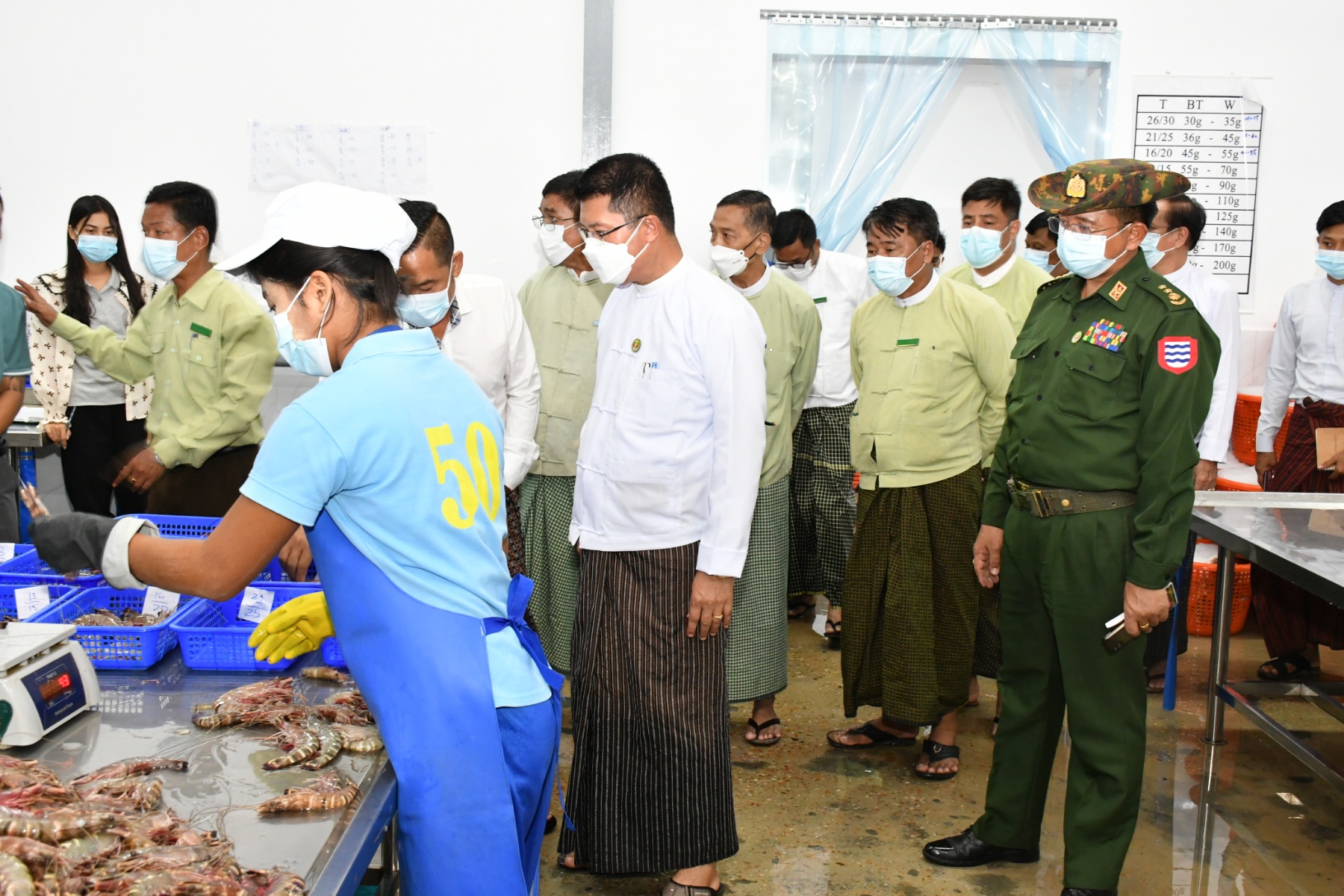 ထို့နောက် ရွှေဟိုင်းကြီး ငါး၊ပုဇွန်အအေးခန်းစက်ရုံ ကုမ္ပဏီလီမိတက်၏ အအေးခန်း စက်ရုံလည်ပတ်နေမှုအားလည်းကောင်း၊ စက်ရုံမှ ဝယ်ယူလျက်ရှိသည့် ငါးပုစွန် အမျိုး အစားများ၊ ရေခဲစက်မှ ရေခဲထုတ်လုပ်မှုနှင့် အေးခဲ ငါး၊ပုဇွန် ထုပ်ပိုးနေမှုများအား လည်းကောင်း ကြည့်ရှုစစ်ဆေးခဲ့ရာ စက်ရုံတာဝန်ရှိသူများမှ ရှင်းလင်းတင်ပြခဲ့ကြပြီး အဆိုပါစက်ရုံ၌ ဒေသခံ(၁၀၀)ကျော် အလုပ်အကိုင် အခွင့်အလမ်းများ ရရှိလျက်ရှိကြောင်း သိရှိရပါသည်။