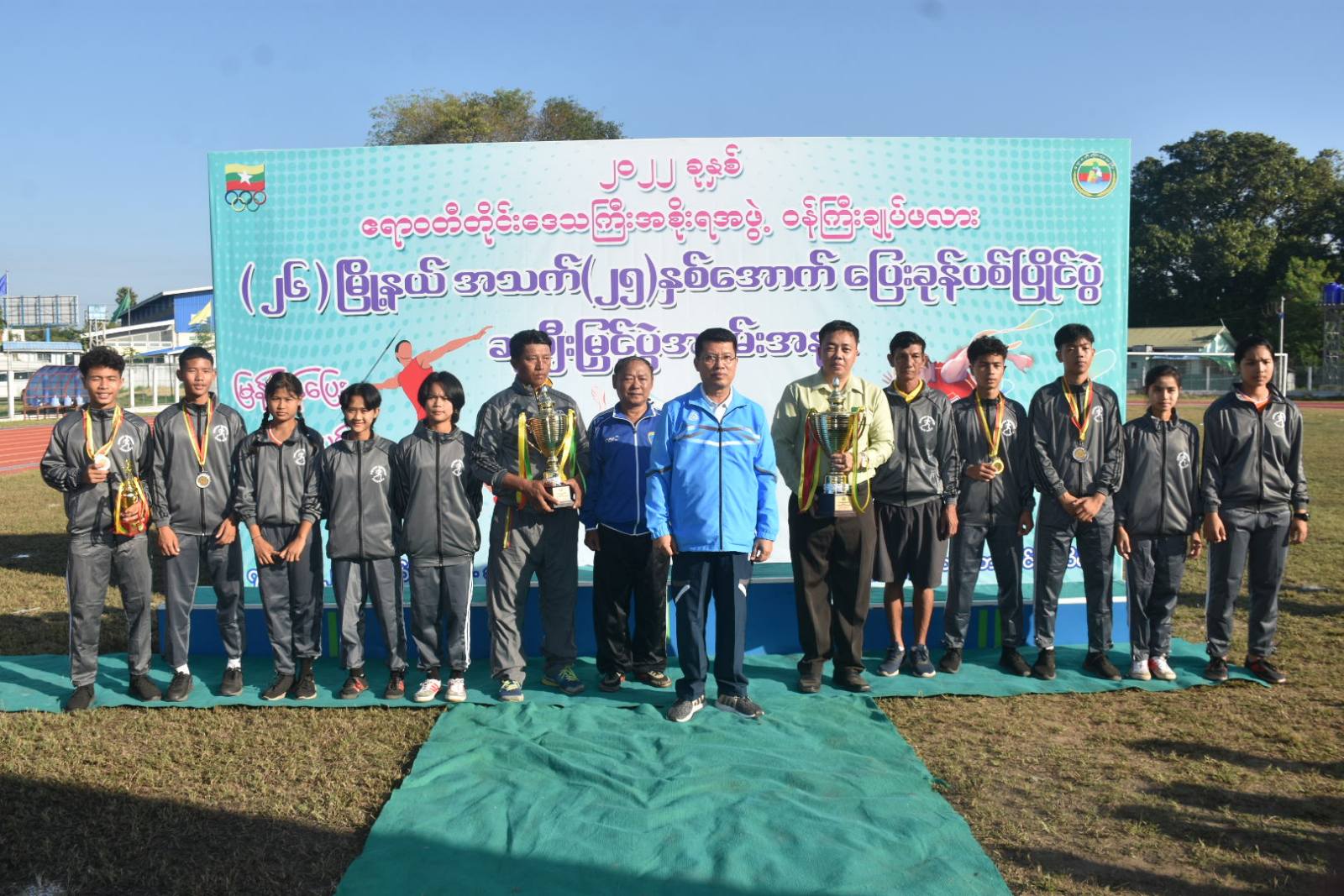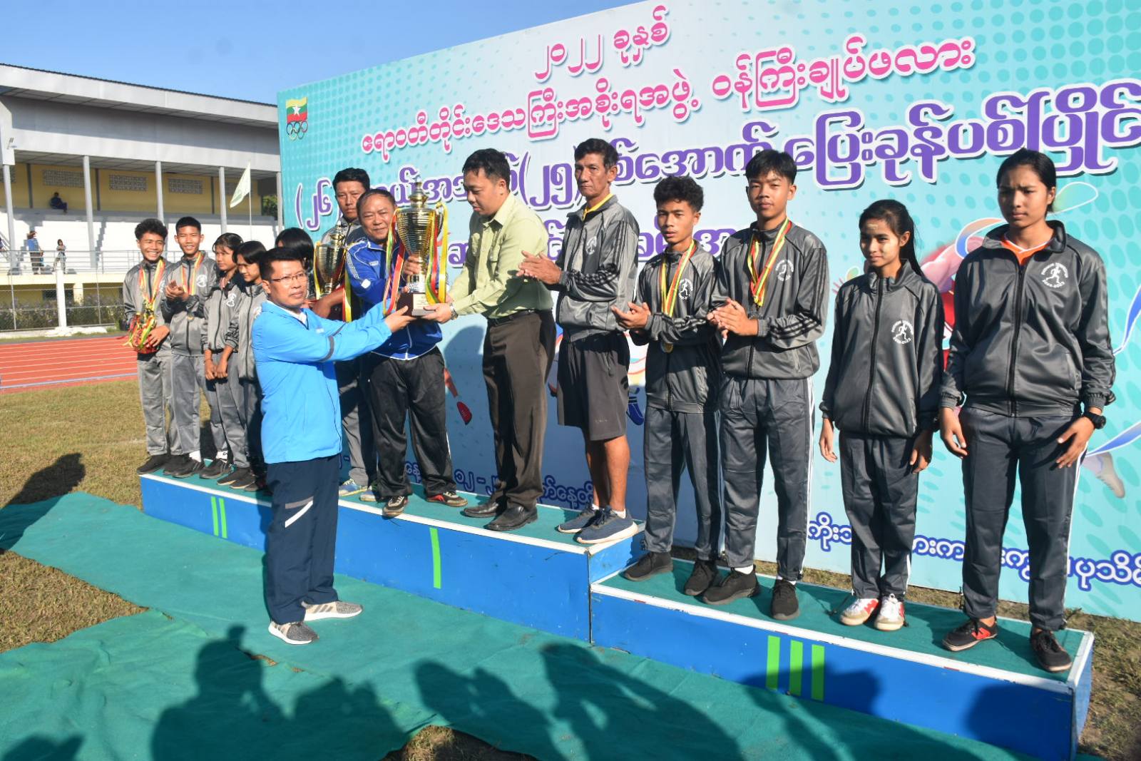 ယင်းနောက် ဆုချီးမြှင့်ပွဲအခမ်းအနားအား ဆက်လက်ပြုလုပ်ရာ အမျိုးသား၊ အမျိုးသမီးလှံတံပစ်ပြိုင်ပွဲ၊သုံးဆင့်ခုန်ပြိုင်ပွဲ၊ ပထမ၊ဒုတိယ၊တတိယဆုရရှိသူများအား တစ်ဦးချင်းဆုတံဆိပ်နှင့် ငွေသားဆုများကို ဌာဆိုင်ရာ တာဝန်ရှိသူများကလည်းကောင်း၊ မီတာ၈၀၀အပြေးပြိုင်ပွဲ၊ မီတာ ၁၀၀ အပြေးပြိုင်ပွဲများတွင် ပထမ၊ဒုတိယ၊တတိယဆုရရှိသူများအား တစ်ဦးချင်းဆုတံဆိပ်နှင့် ငွေသားဆုများကို တိုင်းဒေသကြီးတရားသူကြီးချုပ်နှင့် တိုင်းရင်းသားရေးရာဝန်ကြီးတို့ကလည်းကောင်း၊ အမျိုးသား၊ အမျိုးသမီးမီတာ (၄၀၀×၄)လက်ဆင့်ကမ်းပြိုင်ပွဲတွင် ပထမ၊ဒုတိယ၊တတိယဆုရရှိသူများအား တစ်ဦးချင်းဆုတံဆိပ်နှင့် ငွေသားဆုများကိုလမ်းပန်းဆက်သွယ်ရေးဝန်ကြီးနှင့် လူမှုရေးရာဝန်ကြီးတို့ကလည်းကောင်း၊ပွဲစဉ်တစ်လျှောက်အကောင်းဆုံးအားကစားသမား ဆုရရှိသူများအား တစ်ဦးချင်းဆုတံဆိပ်နှင့် ငွေသားဆုများအား သယံဇာတရေးရာ ဝန်ကြီးကလည်းကောင်း၊အမျိုးသမီး တံခွန်စိုက်ဆုဖလားရရှိသော ကျောင်းကုန်းမြို့နယ်အသင်းအား ဆုဖလားကို ဝန်ကြီးချုပ်၏ ဇနီးက လည်းကောင်းဆုများအသီးသီးချီးမြှင့်ခဲ့ကြပြီး တိုင်းဒေသကြီး ဝန်ကြီးချုပ်က အမျိုးသား တံခွန်စိုက်ဆုနှင့် အမျိုးသား၊အမျိုးသမီး စုပေါင်းတံခွန်စိုက်ဆုရရှိသော ပုသိမ်မြို့နယ်အသင်းအား တံခွန်စိုက်ဆုဖလားကို ပေးအပ်ချီးမြှင့်ခဲ့ကာ စုပေါင်းမှတ်တမ်းတင်ဓာတ်ပုံများ ရိုက်ကူးခဲ့ကြကြောင်းသိရသည်။