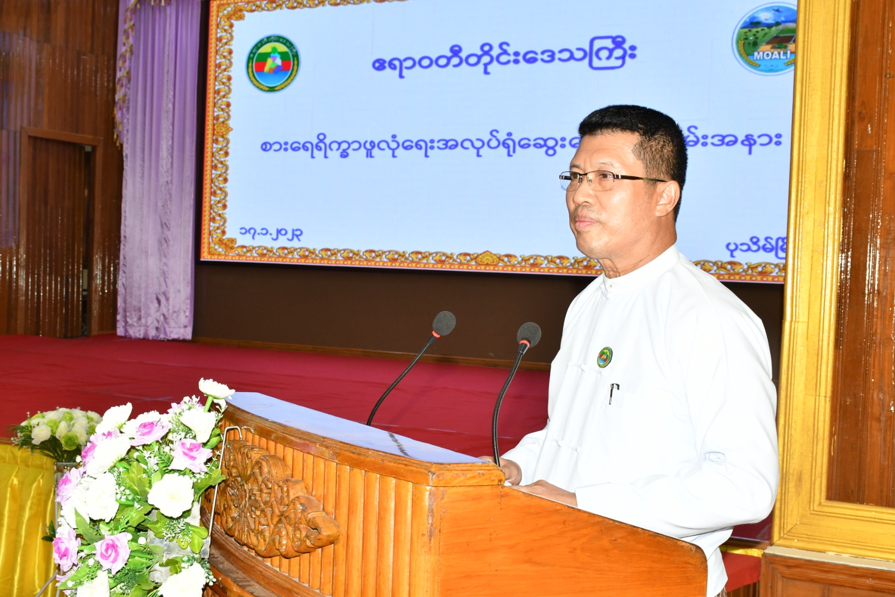 ဦးစွာ တိုင်းဒေသကြီးအစိုးရအဖွဲ့ဝန်ကြီးချုပ် ဦးတင်မောင်ဝင်းမှ အဖွင့်အမှာစကားပြောကြားရာတွင် တိုင်းဒေသကြီးသည် ရေခံမြေခံကောင်းမွန်ပြီး စိုက်ပျိုးမွေးမြူရေးကိုအခြေခံသည့်တိုင်းဒေသကြီးဖြစ်သည်နှင့်အညီ နိုင်ငံတော်၏ အမျိုးသားရေးရည်မှန်းချက်ဖြစ်သည့် တိုင်းပြည်သာယာဝပြောရေးနှင့်စားရေရိက္ခါဖူလုံရေးကို အင်တိုက်အားတိုက်ဆောင်ရွက်လျက်ရှိပါကြောင်း၊ မိုးစပါး၊ နွေစပါး စိုက်ဧကပြည့်မီရေးနှင့် ပန်းတိုင်အထွက်နှုန်းရရှိရေး၊ ရိုးပြက်ကျန်ဧကများတွင် နွေစပါးအပါအဝင် အခြားသီးနှံများစိုက်ပျိုးလျက်ရှိပါကြောင်း၊မြေဆီ၊ မြေသြဇာများပြန်လည်ကောင်းမွန်လာစေရေးအတွက် ၂၀၂၃ခုနှစ်တွင် ရေတော်မိုးတော်မိုးစပါးစိုက်ဧက (၁)သိန်း အား သစ်စိမ်းမြေသြဇာ (ပိုက်ဆံလျှော်)များထည့်သွင်း စိုက်ပျိုးမည် ဖြစ်ပြီး လာမည့် ၂၀၂၄ခုနှစ်တွင် ရေတော်မိုးတော်မိုးစပါးစိုက်ဧက(၂၇)သိန်းအား အပြည့်အဝထည့်သွင်း စိုက်ပျိုးရန် ဆောင်ရွက်လျက်ရှိပါကြောင်း၊ သဘာဝမြေသြဇာ၊ ဇီဝမြေသြဇာများအသုံးပြု၍ ဓာတ်မြေသြဇာသုံးစွဲမှုလျော့ချနိုင်ရေးဆောင်ရွက်ကြရမှာဖြစ်ပါကြောင်း၊ ဆီဖူလုံစေရေးအတွက်လည်း ဆီထွက်သီးနှံများဖြစ်သည့် မြေပဲ၊ နှမ်း၊ နေကြာသီးနှံများအား တိုးချဲ့စိုက်ပျိုးလျက်ရှိပါကြောင်း၊ စိုက်ပျိုးရေလုံလောက်စွာရရှိစေရေးအတွက် ချောင်းပိတ်၊မြောင်းပိတ်လုပ်ငန်းများ၊ မြောင်းတူးဖော်ခြင်းလုပ်ငန်းများကို စိုက်ပျိုးချိန်အမီ သက်ဆိုင်ရာဌာနများနှင့်ပေါင်းစပ်ဆောင်ရွက်ပေးလျက်ရှိသည့်အပြင် မြစ်ရေတင်လုပ်ငန်းများ၊ ဆည်ရေသောက်လုပ်ငန်းများဖြင့် စိုက်ပျိုးရေပေးဝေနိုင်ရေးဆောင်ရွက်ပေးလျက်ရှိပါကြောင်း၊ သား/ငါး ကဏ္ဍတွင် အင်းလုပ်ငန်း၊ ကမ်းနီးကမ်းဝေးငါးဖမ်းလုပ်ငန်းများ၊ မွေးမြူရေးကန်များဖြင့် ငါး၊ ပုဇွန်၊ ဂဏန်းစနစ်တကျမွေးမြူခြင်း၊ အသားတိုးကြက်၊ဝက်၊ နွား၊ ဆိတ်မွေးမြူခြင်း၊ ဥစား(ကြက်/ဘဲ)မွေးမြူခြင်းစသည့်လုပ်ငန်းများဖြင့် စားရေရိက္ခာဖူလုံရေးနှင့်ပြည်ပသို့တင်ပို့နိုင်ရေးဆောင်ရွက်လျက်ရှိပါကြောင်းနှင့် အလုပ်ရုံဆွေးနွေးပွဲသို့တက်ရောက်လာကြသူများမှ စားရေရိက္ခါဖူလုံရေး အပြန်အလှန်ဆွေးနွေးပေးကြရန်နှင့် ရလဒ်ကောင်းများထွက်ပေါ်လာစေရေး ဆောင်ရွက်ပေးရန် ပြောကြားခဲ့သည်။
