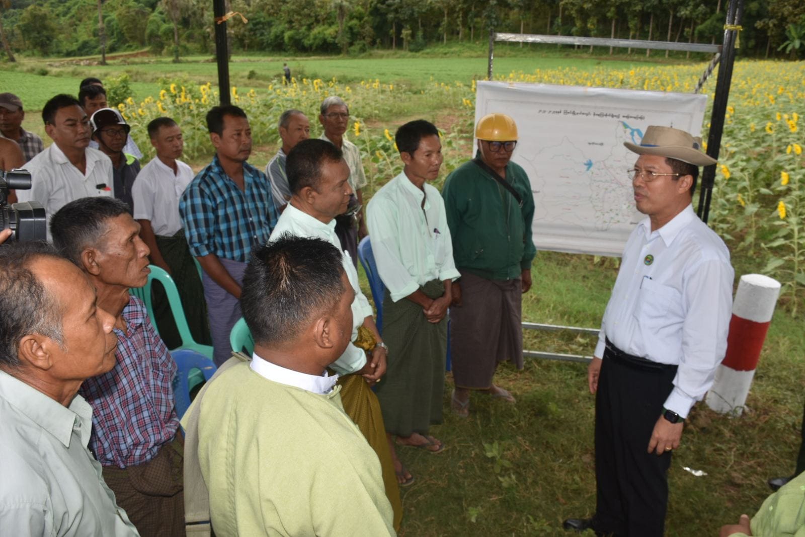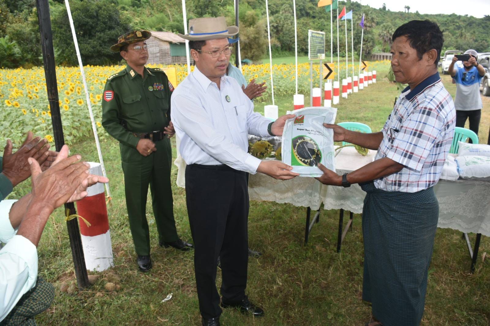 ဦးစွာ တိုင်းဒေသကြီးဝန်ကြီးချုပ်နှင့်အဖွဲ့သည် သောကြာဒူးကျေးရွာ တောင်သူဦးကြည်ညွန့်၏ ဆင်းရွှေကြာ(၂)နေကြာ (၁.၅၀)ဧကစိုက်ပျိုးဖြစ်ထွန်း အောင်မြင်နေမှုများကို ကြည့်ရှုအားပေးပြီး တောင်သူများနှင့်တွေ့ဆုံ၍ တိုင်းဒေသကြီး ဆီဖူလုံရေးအတွက်နေကြာ၊ မြေပဲ၊ နှမ်းစသည့် ဆီထွက်သီးနှံများ တိုးချဲ့စိုက်ပျိုးလျက် ရှိပါကြောင်း၊ ဒေသနှင့်ကိုက်ညီသည့်အထွက်တိုးနေကြာမျိုးများစိုက်ပျိုးကြရန်လိုပါ ကြောင်း၊ ပိုးမွှားများ မကျရောက်စေရေးနှင့် အောင်မြင်စေရေးအလေးထားဆောင်ရွက်ရန် မှာကြားခဲ့ကာ တောင်သူများအား နေကြာမျိုးစေ့များနှင့် ပိုက်ဆံလျှော်မျိုးစေ့များ ထောက်ပံ့ပေးအပ်ခဲ့သည်။