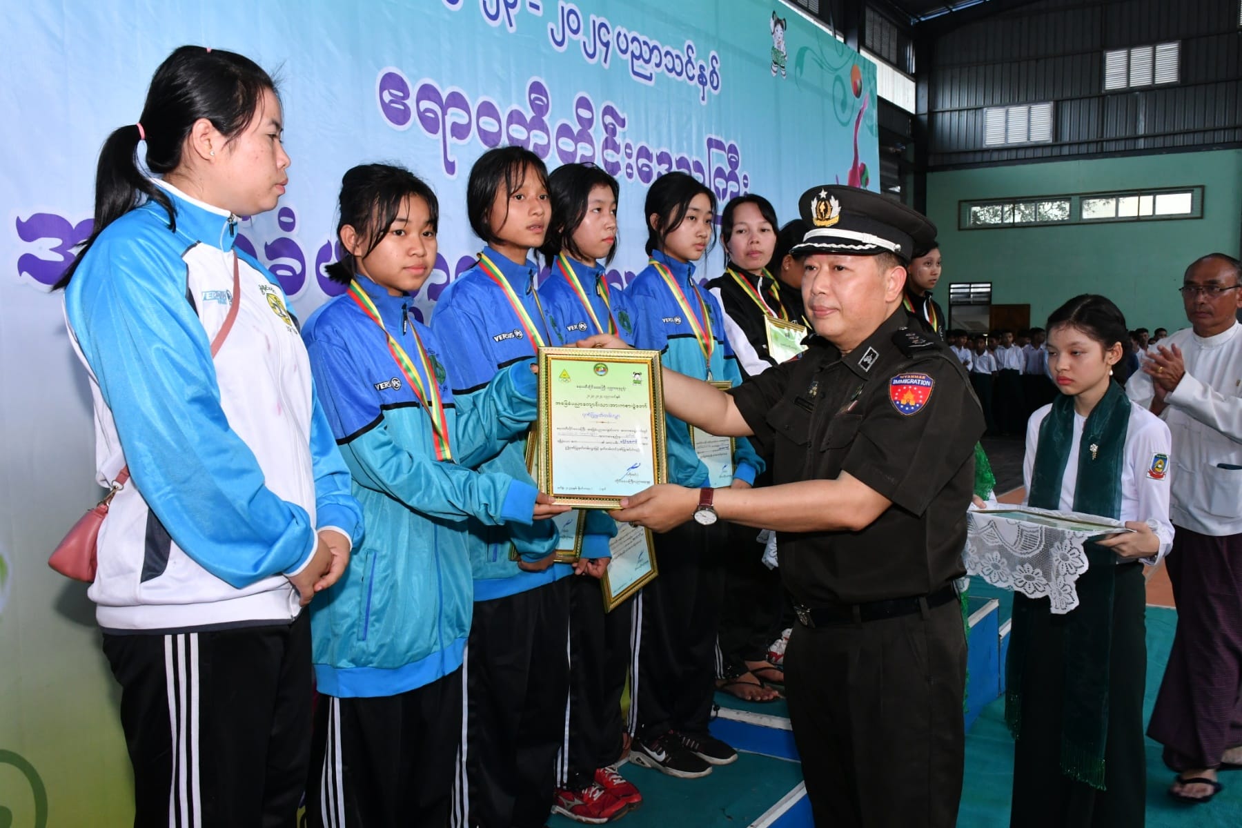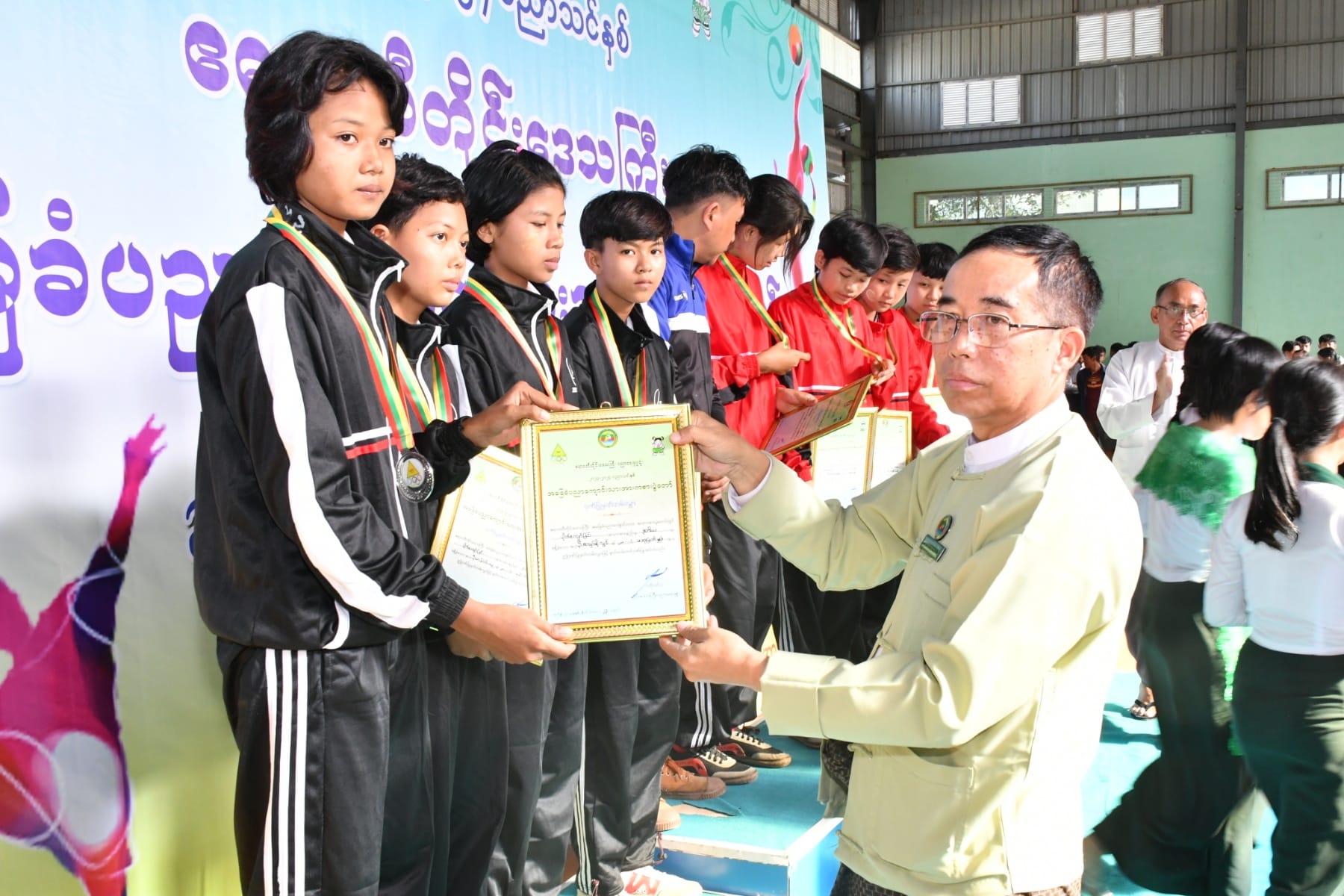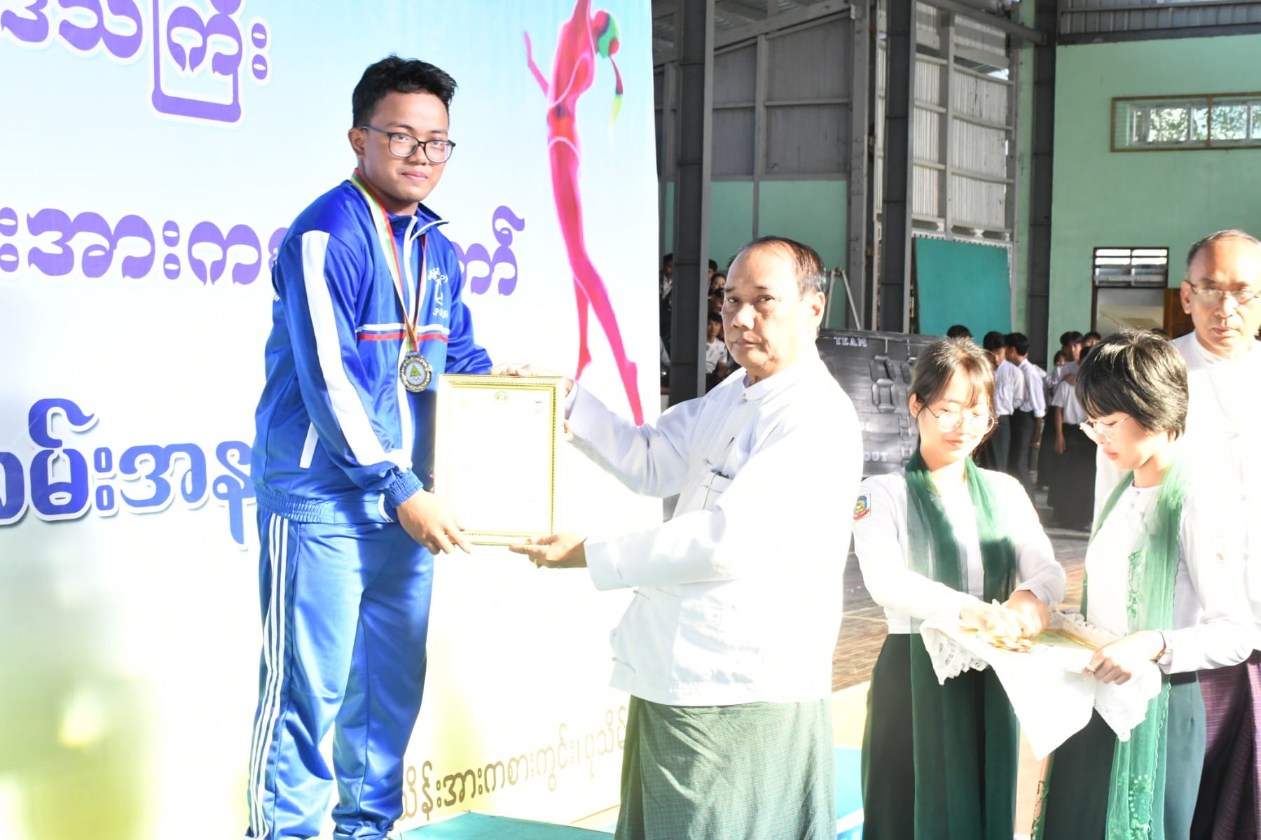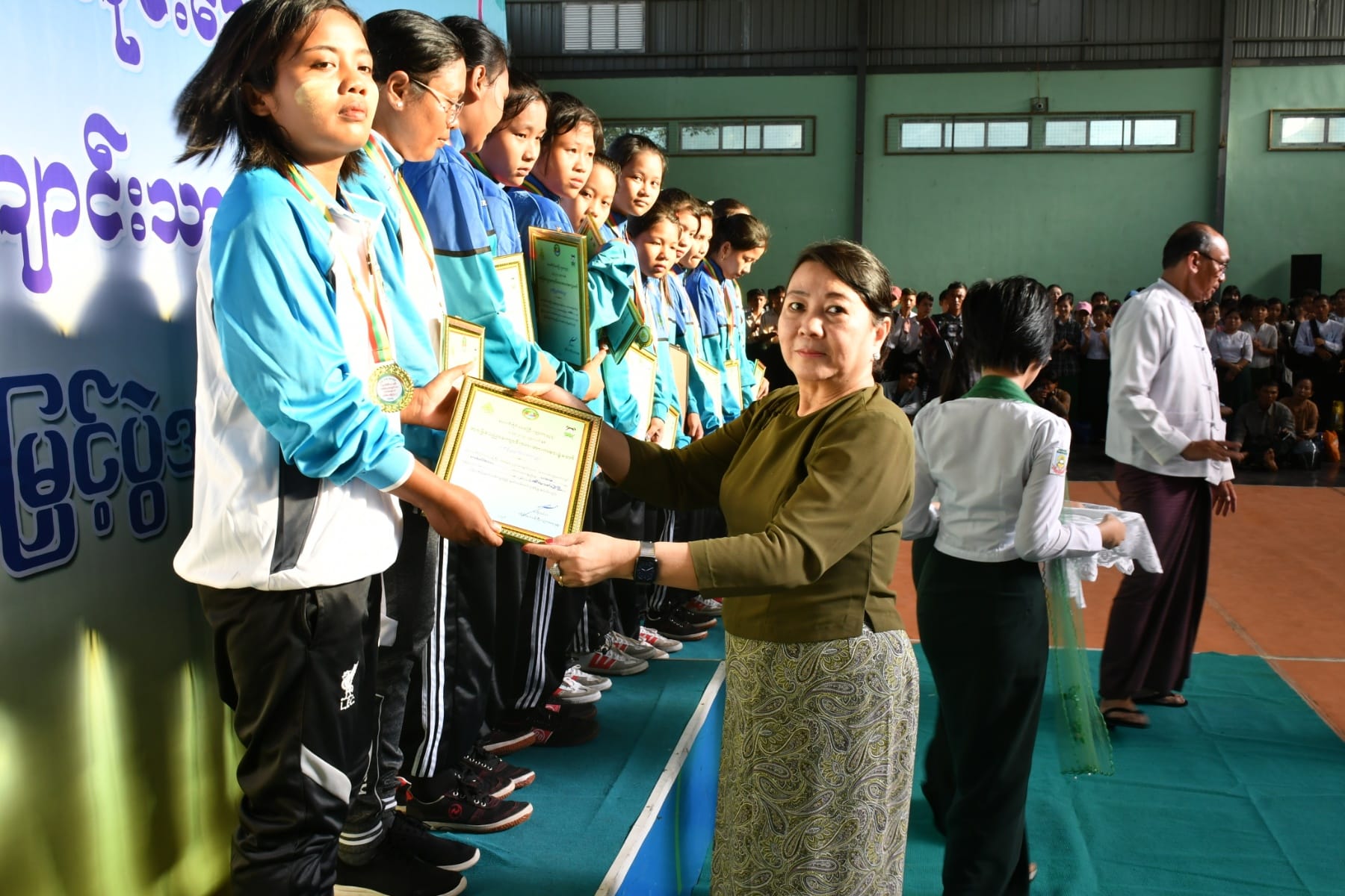 ဆက်လက်၍ ဆုချီးမြှင့်ပွဲအခမ်းအနားကိုပြုလုပ်ရာ အမျိုးသမီးဘတ်စကတ်ဘောပြိုင်ပွဲတွင် ပထမဆုရရှိသည့် ခရိုင်အုပ်စု(၄)နှင့် ဒုတိယဆုရရှိသည့် ခရိုင်အုပ်စု(၅)အား အားကစားနှင့်ကာယပညာဦးစီးဌာန၊ တိုင်းဦးမှူးကလည်းကောင်း၊ အမျိုးသားဘတ်စကတ်ဘော ပြိုင်ပွဲတွင် ပထမဆုရရှိသည့် ခရိုင်အုပ်စု(၅)နှင့် ဒုတိယဆုရရှိသည့် ခရိုင်အုပ်စု(၁)အား တိုင်းဒေသကြီးပညာရေးမှူးကလည်းကောင်း၊ အမျိုးသမီးပိုက်ကျော်ခြင်းပြိုင်ပွဲတွင် ပထမဆု ရရှိသည့် ခရိုင်အုပ်စု(၅)နှင့် ဒုတိယဆုရရှိသည့် ခရိုင်အုပ်စု(၆)အား တိုင်းဒေသကြီးအစိုးရအဖွဲ့၊ အတွင်းရေးမှူးကလည်းကောင်း၊ အမျိုးသားပိုက်ကျော်ခြင်းပြိုင်ပွဲတွင် ပထမဆုရရှိသည့် ခရိုင် အုပ်စု(၁)နှင့် ဒုတိယဆုရရှိသည့် ခရိုင်အုပ်စု(၃)အား တိုင်းရင်းသားရေးရာဝန်ကြီး၏ ဇနီးကလည်းကောင်း၊ အမျိုးသမီးတစ်ဦးချင်းစားပွဲတင်တင်းနစ်ပြိုင်ပွဲတွင် ပထမဆုနှင့် ဒုတိယဆုရရှိသူများအား တိုင်းရင်းသားရေးရာ ဝန်ကြီးကလည်းကောင်း၊ အမျိုးသားတစ်ဦးချင်း စားပွဲတင်တင်းနစ်ပြိုင်ပွဲတွင် ပထမဆုနှင့် ဒုတိယဆုရရှိသူများအား လမ်းပန်းဆက်သွယ်ရေး ဝန်ကြီးကလည်းကောင်း၊ အမျိုးသမီးအသင်းလိုက် စားပွဲတင်တင်းနစ်ပြိုင်ပွဲတွင် ပထမဆု ရရှိသည့် ခရိုင်အုပ်စု(၆)နှင့် ဒုတိယဆုရရှိသည့် ခရိုင်အုပ်စု(၃)အား လူမှုရေးရာဝန်ကြီး ကလည်းကောင်း၊ အမျိုးသားအသင်းလိုက် စားပွဲတင် တင်းနစ်ပြိုင်ပွဲတွင် ပထမဆုရရှိသည့် ခရိုင်အုပ်စု(၃)နှင့် ဒုတိယဆုရရှိသည့် ခရိုင်အုပ်စု(၆)အား သယံဇာတရေးရာဝန်ကြီး၏ ဇနီးကလည်းကောင်း၊ အမျိုးသမီးတစ်ဦးချင်း ကြက်တောင်ရိုက်ပြိုင်ပွဲတွင် ပထမနှင့် ဒုတိယဆုရရှိသူများကို သယံဇာတရေးရာဝန်ကြီးကလည်းကောင်း၊ အမျိုးသားတစ်ဦးချင်း ကြက်တောင်ရိုက်ပြိုင်ပွဲတွင် ပထမနှင့် ဒုတိယဆုရရှိသူများကို တိုင်းဒေသကြီး ဥပဒေချုပ်က လည်းကောင်း၊ အမျိုးသမီးအသင်းလိုက် ကြက်တောင်ရိုက်ပြိုင်ပွဲတွင် ပထမဆုရရှိသည့် ခရိုင်အုပ်စု(၁)နှင့် ဒုတိယဆုရရှိသည့် ခရိုင်အုပ်စု (၃)အား စီးပွားရေးရာဝန်ကြီးကလည်းကောင်း၊ အမျိုးသားအသင်းလိုက် ကြက်တောင်ရိုက် ပြိုင်ပွဲတွင် ပထမဆုရရှိသည့် ခရိုင်အုပ်စု(၃)နှင့် ဒုတိယဆုရရှိသည့် ခရိုင်အုပ်စု(၁)အား လုံခြုံရေးနှင့်နယ်စပ်ရေးရာဝန်ကြီး၏ဇနီးက လည်းကောင်း၊ အမျိုးသမီးဘော်လီဘောပြိုင်ပွဲတွင် ဒုတိယဆုရရှိသည့် ခရိုင်အုပ်စု(၁)နှင့် အမျိုးသားဘော်လီဘောပြိုင်ပွဲတွင် ဒုတိယဆုရရှိသည့် ခရိုင်အုပ်စု(၃)အား လူမှုရေးရာဝန်ကြီး ကလည်းကောင်း၊ အမျိုးသမီးဘော်လီဘောပြိုင်ပွဲတွင် ပထမဆုရရှိသည့် ခရိုင်အုပ်စု(၃)အား တိုင်းဒေသကြီးဝန်ကြီးချုပ်၏ ဇနီးကလည်းကောင်း၊ အမျိုးသားဘော်လီဘောပြိုင်ပွဲတွင် ပထမဆုရရှိသည့် ခရိုင်အုပ်စု(၁