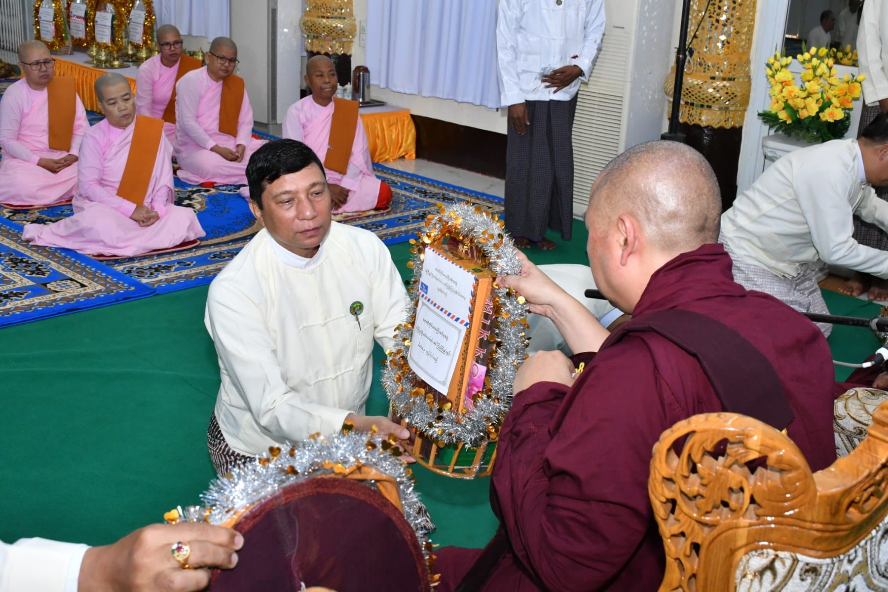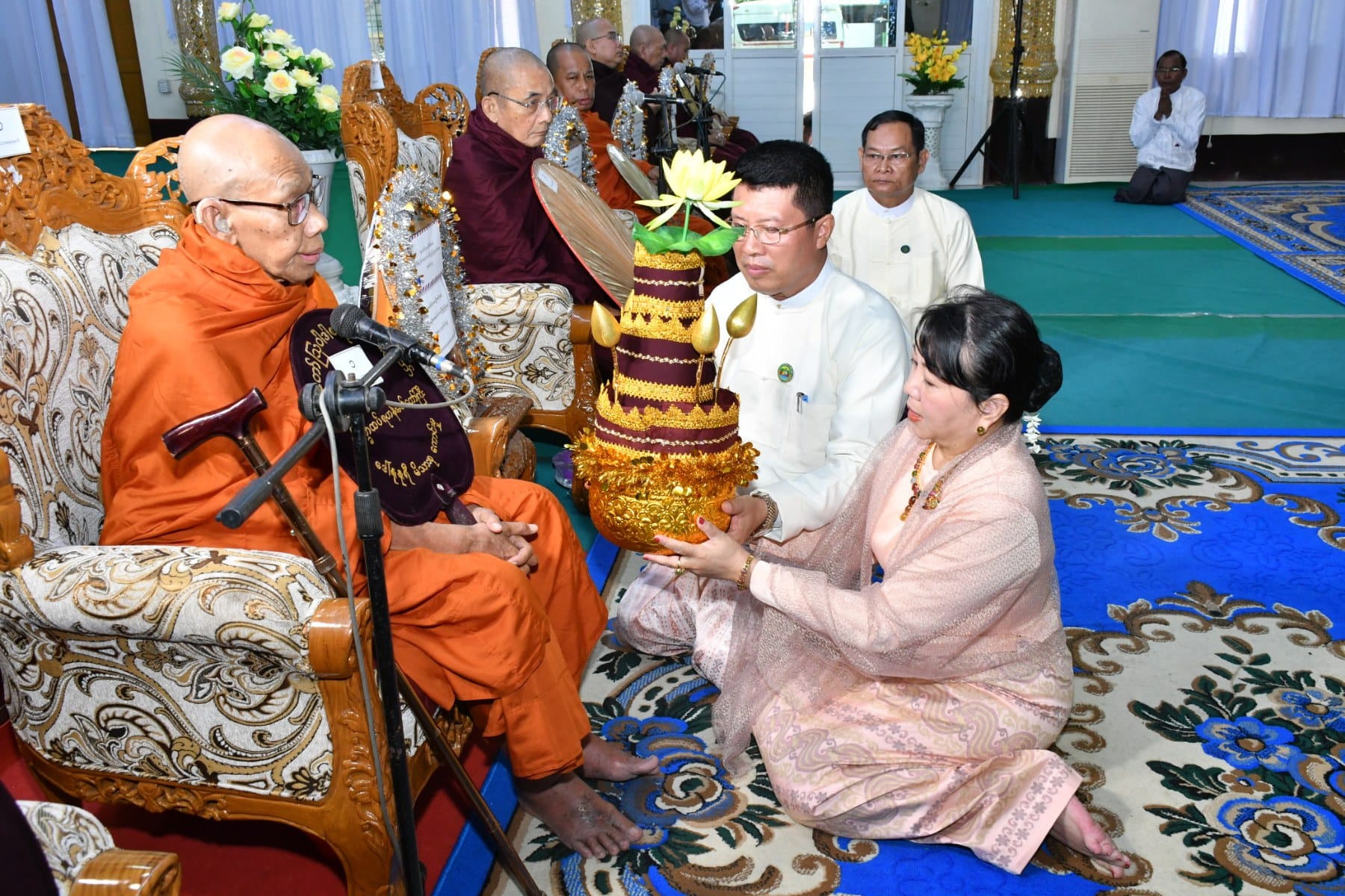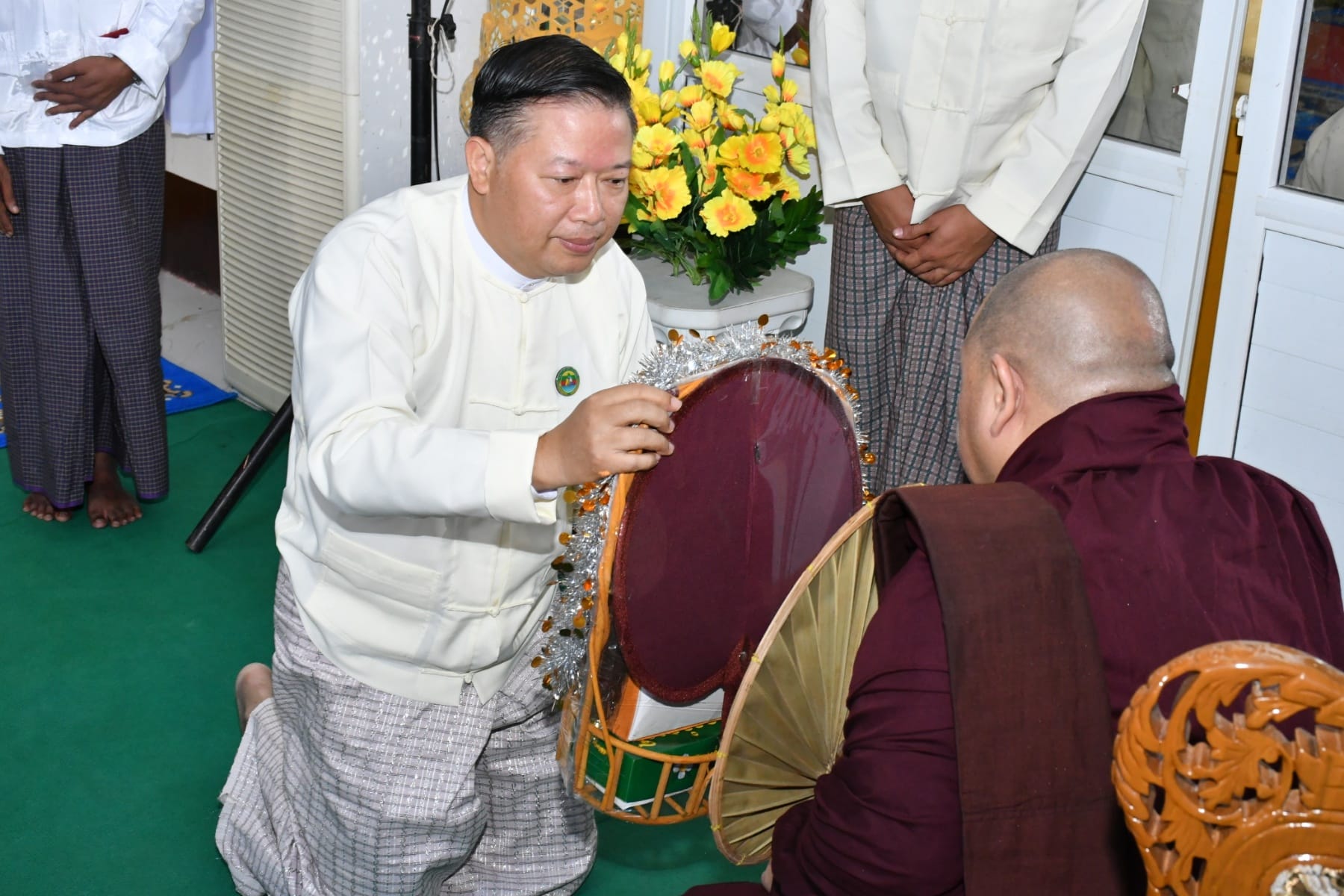 ဆက်လက်၍ တိုင်းဒေသကြီး ဝန်ကြီးချုပ်နှင့်ဇနီးတို့က ကျောင်းထိုင်ဘုန်းကြီးသင်တန်း ကျောင်းတွင် ပုရိမဝါဆိုဝါကပ်၍ ပုရိမဝါမှထတော်မူကြသည့် သံဃာတော်များကိုယ်စား ညောင်ပင်သာကျောင်းတိုက် ဆရာတော် ဘဒ္ဒန္တဝိဿုတ မဟာထေရ်မြတ်ထံ ကထိန်လျာ ဉတ်သင်္ကန်းနှင့် အခြံအရံလှူဖွယ်ပစ္စည်းများအားလည်းကောင်း၊ အနောက်တောင်တိုင်း စစ်ဌာနချုပ်တိုင်းမှူးနှင့်ဇနီး၊ ပုသိမ်လေတပ်စခန်းဌာနချုပ်မှူးနှင့် ဇနီး၊ အစိုးရအဖွဲ့ဝန်ကြီးများက ပင့်သံဃာတော်အရှင်သူမြတ်များအား လှူဖွယ်ဝတ္ထုပစ္စည်းများကိုလည်းကောင်း၊ တိုင်းဒေသကြီး ဝန်ကြီးချုပ်၏ဇနီးနှင့် အနောက်တောင်တိုင်းစစ်ဌာနချုပ်တိုင်းမှူး၏ဇနီးတို့က သီလရှင်ဆရာကြီးများအား လှူဖွယ်ဝတ္ထုပစ္စည်းများကိုလည်းကောင်း အသီးသီးဆက်ကပ်လှူဒါန်း ခဲ့ကြပြီးနောက် တိုင်းဒေသကြီးသံဃနာယကအဖွဲ့ ဥက္ကဋ္ဌ၊ ရွှေမစိုးရိမ်ကျောင်းတိုက်ဆရာတော် ဘဒ္ဒန္တဝိဇယ အရှင်သူမြတ်ထံမှ တိုင်းဒေသကြီးဝန်ကြီးချုပ်နှင့်ဧည့်ပရိသတ်များက အနုမောဒနာ တရားနာကြား၍ လှူဒါန်းမှုအစုစုတို့အတွက် ရေစက်သွန်းချ အမျှပေးဝေခဲ့သည်။