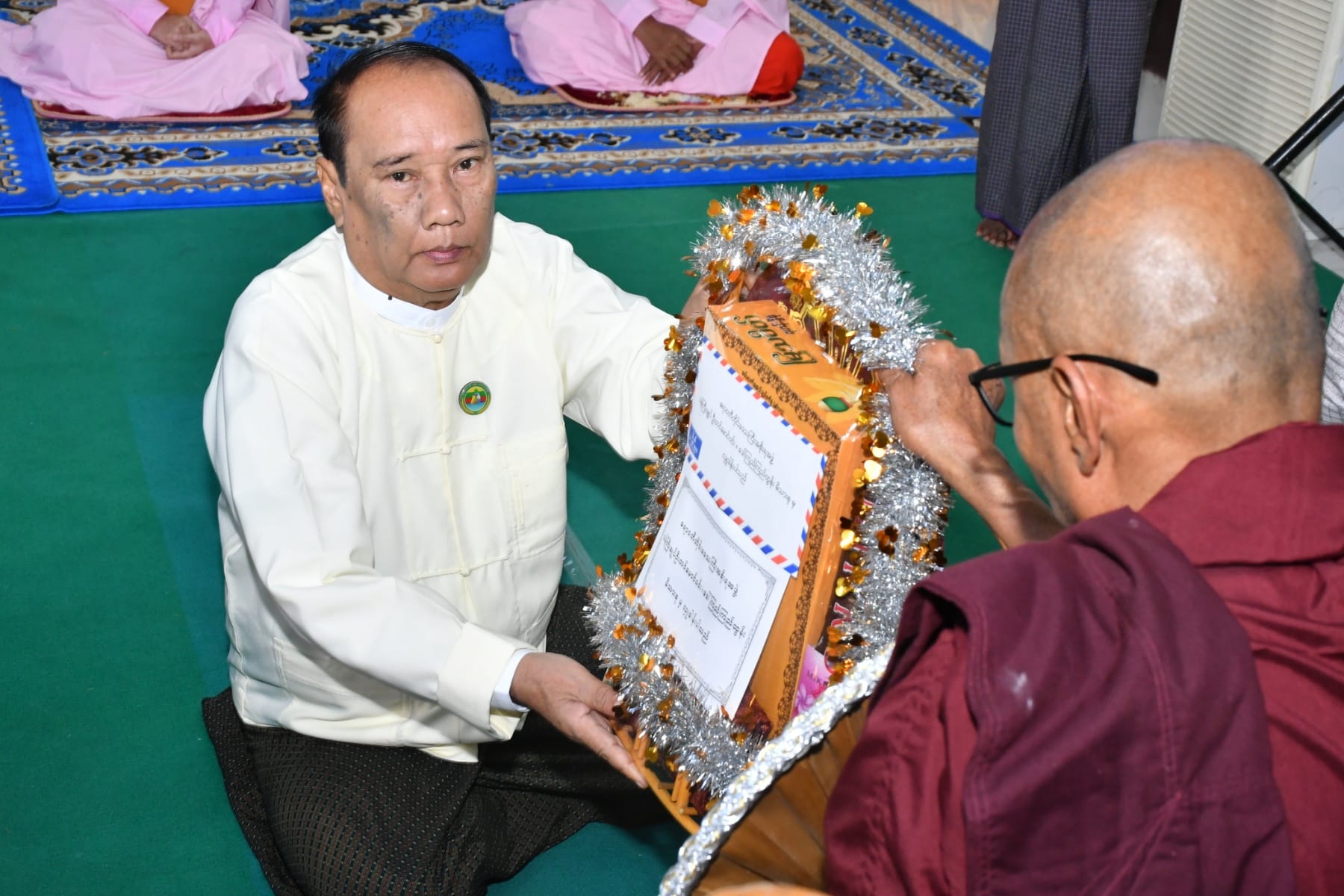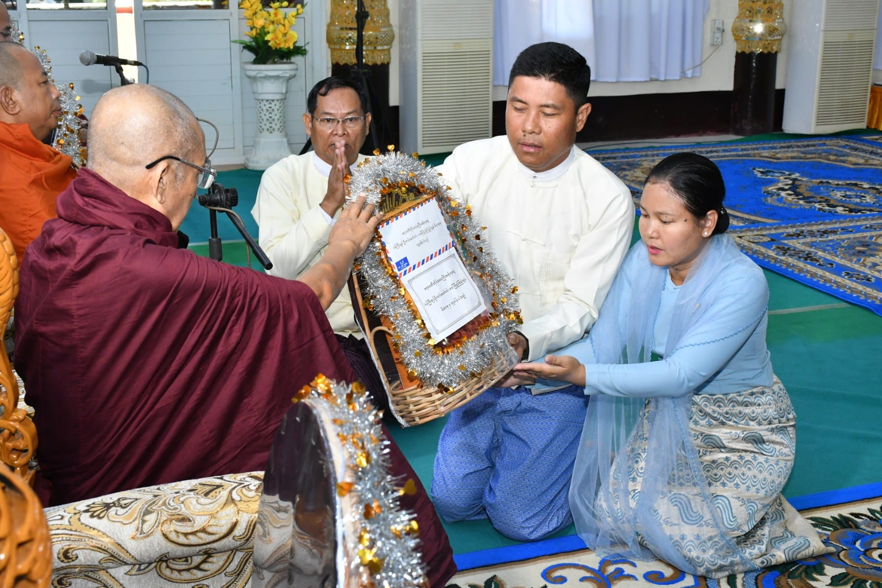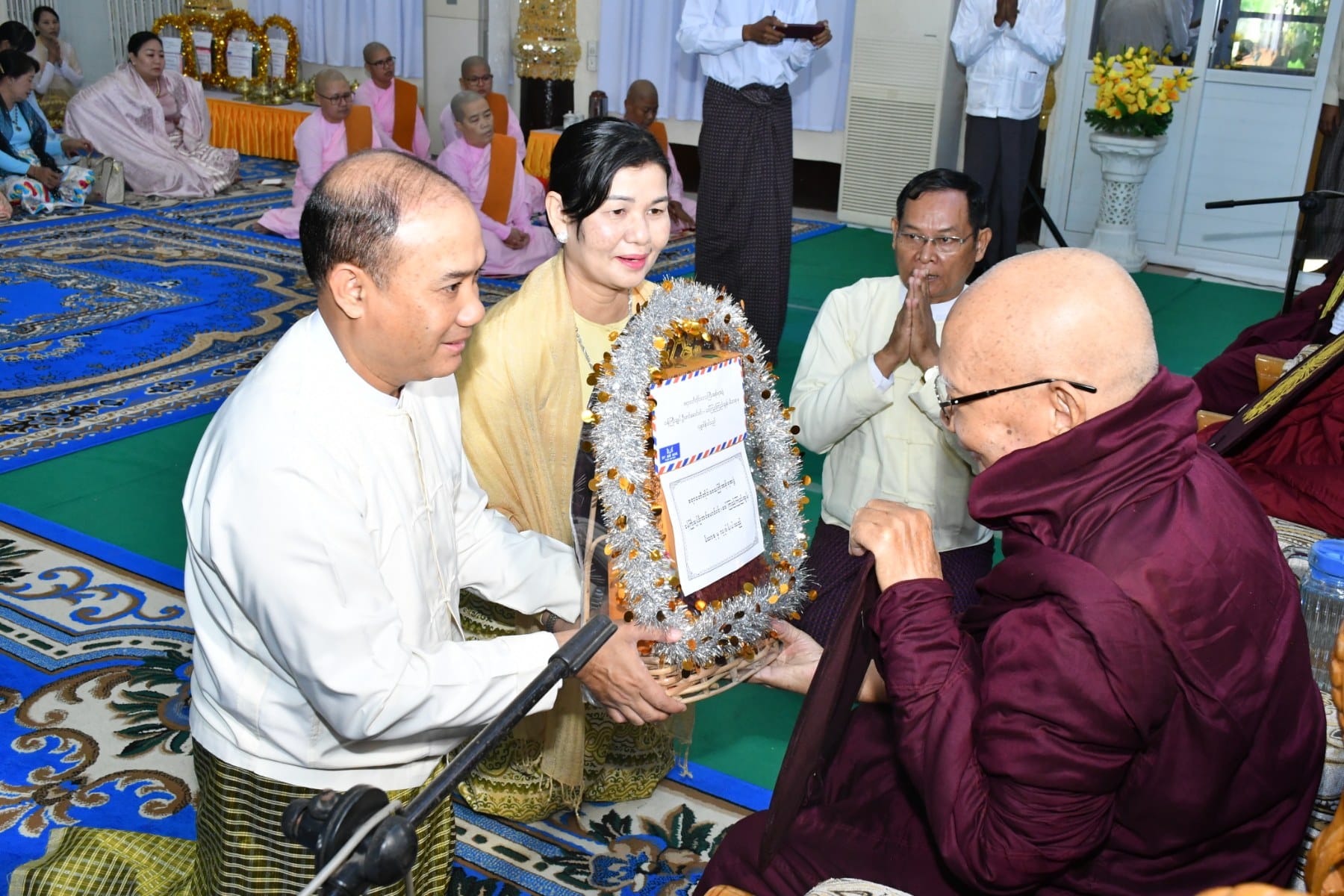 ဆက်လက်၍ တိုင်းဒေသကြီး ဝန်ကြီးချုပ်နှင့်ဇနီးတို့က ကျောင်းထိုင်ဘုန်းကြီးသင်တန်း ကျောင်းတွင် ပုရိမဝါဆိုဝါကပ်၍ ပုရိမဝါမှထတော်မူကြသည့် သံဃာတော်များကိုယ်စား ညောင်ပင်သာကျောင်းတိုက် ဆရာတော် ဘဒ္ဒန္တဝိဿုတ မဟာထေရ်မြတ်ထံ ကထိန်လျာ ဉတ်သင်္ကန်းနှင့် အခြံအရံလှူဖွယ်ပစ္စည်းများအားလည်းကောင်း၊ အနောက်တောင်တိုင်း စစ်ဌာနချုပ်တိုင်းမှူးနှင့်ဇနီး၊ ပုသိမ်လေတပ်စခန်းဌာနချုပ်မှူးနှင့် ဇနီး၊ အစိုးရအဖွဲ့ဝန်ကြီးများက ပင့်သံဃာတော်အရှင်သူမြတ်များအား လှူဖွယ်ဝတ္ထုပစ္စည်းများကိုလည်းကောင်း၊ တိုင်းဒေသကြီး ဝန်ကြီးချုပ်၏ဇနီးနှင့် အနောက်တောင်တိုင်းစစ်ဌာနချုပ်တိုင်းမှူး၏ဇနီးတို့က သီလရှင်ဆရာကြီးများအား လှူဖွယ်ဝတ္ထုပစ္စည်းများကိုလည်းကောင်း အသီးသီးဆက်ကပ်လှူဒါန်း ခဲ့ကြပြီးနောက် တိုင်းဒေသကြီးသံဃနာယကအဖွဲ့ ဥက္ကဋ္ဌ၊ ရွှေမစိုးရိမ်ကျောင်းတိုက်ဆရာတော် ဘဒ္ဒန္တဝိဇယ အရှင်သူမြတ်ထံမှ တိုင်းဒေသကြီးဝန်ကြီးချုပ်နှင့်ဧည့်ပရိသတ်များက အနုမောဒနာ တရားနာကြား၍ လှူဒါန်းမှုအစုစုတို့အတွက် ရေစက်သွန်းချ အမျှပေးဝေခဲ့သည်။