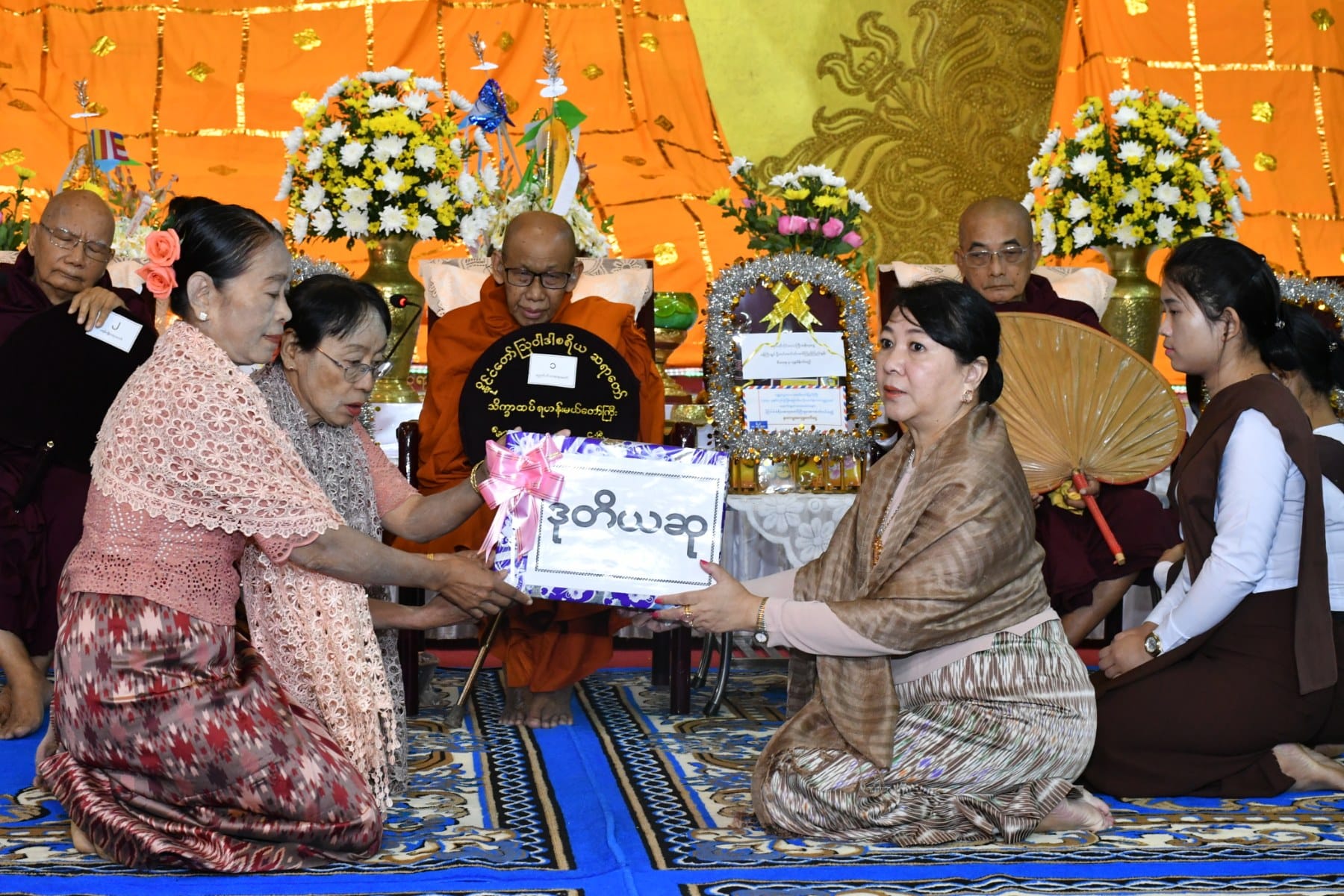 ထို့နောက် တိုင်းဒေသကြီးသံဃနာယကအဖွဲ့၊ ဩဝါဒါစရိယ ပုသိမ်မြို့၊ မရမ်းချို ကျောင်းတိုက်၏ ပဓာနနာယကဆရာတော် ဘဒ္ဒန္တသောဘိတ (အဂ္ဂမဟာဂန္ထဝါစကပဏ္ဍိတ၊ အဂ္ဂမဟာသဒ္ဓမ္မဇောတိကဓဇ) ဘဒ္ဒန္တသောဘိတ မဟာထေရ်မြတ်ထံမှ အနုမောဒနာတရားနာကြား၍ လှူဒါန်းမှုအစုစုတို့အတွက် ရေစက်သွန်းချအမျှပေးဝေခဲ့ကြသည်။
