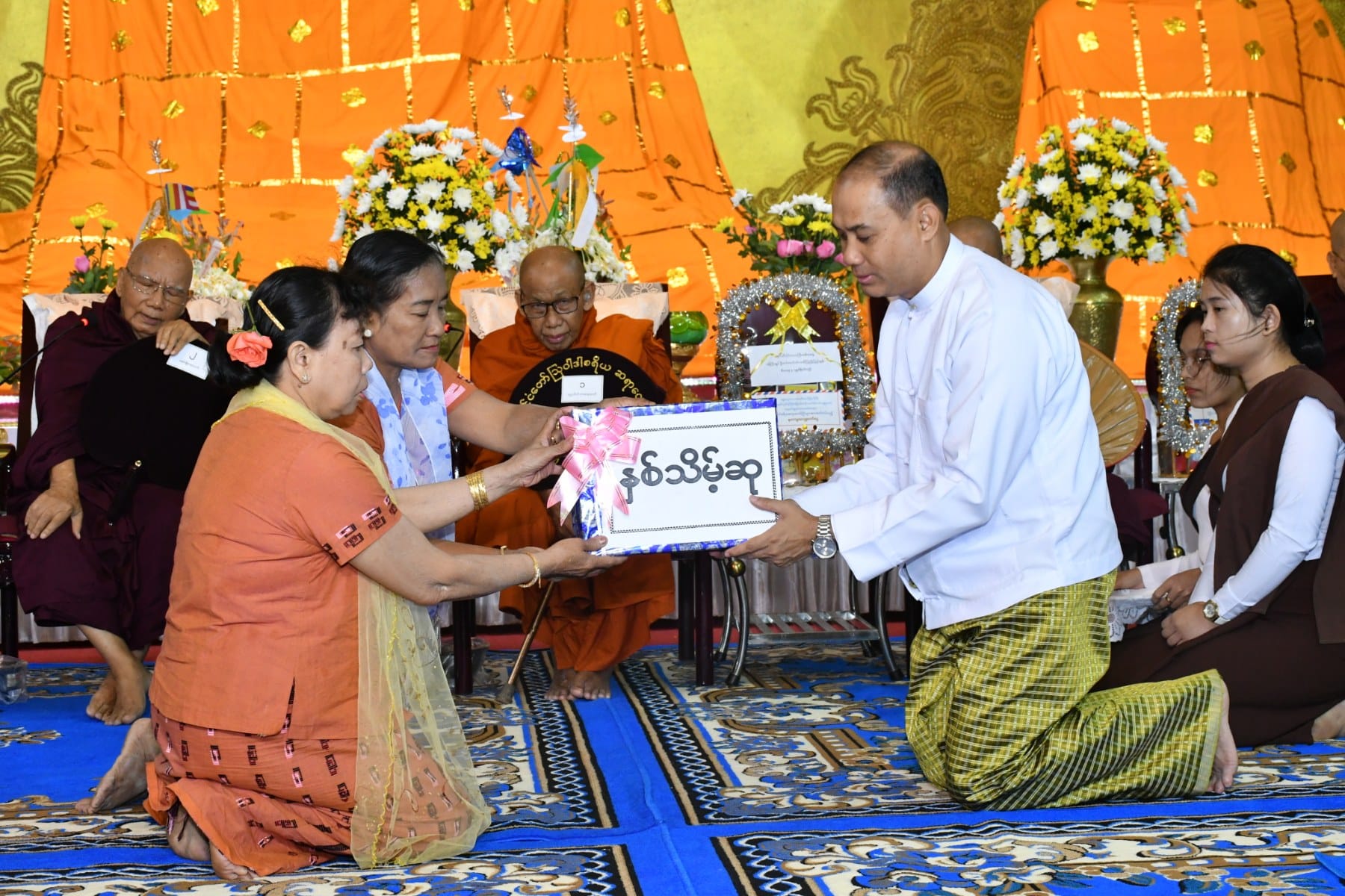 ဆက်လက်၍ ဝန်ကြီးချုပ်နှင့် ဧည့်ပရိသတ်များက နိုင်ငံတော်ဩဝါဒါ စရိယ၊ ပုသိမ်မြို့၊ နိဂြောဓာရုံ ညောင်ပင်သာပရိယတ္တိ စာသင်တိုက်၏ ပဓာနနာယဆရာတော် ဘဒ္ဒန္တဝိဿုတ (အဘိဓဇမဟာရဋ္ဌဂုရု၊ အဂ္ဂမဟာပဏ္ဍိတ၊ အဂ္ဂမဟာသဒ္ဓမ္မဇောတိကဓဇ) မဟာထေရ်မြတ်ထံမှ နဝင်္ဂသီလခံယူဆောက်တည်ကြပြီးနောက် ဆရာတော်ကြီးများထံမှ ပရိတ်တရားတော်များ ဆက်လက်နာယူကြည်ညိုကြကာ တိုင်းဒေသကြီးဝန်ကြီးချုပ်နှင့်ဇနီး၊ အနောက်တောင်တိုင်းစစ်ဌာနချုပ်တိုင်းမှူးနှင့်ဇနီး၊ ပုသိမ်လေတပ်စခန်းဌာနချုပ်မှူးနှင့် ဇနီး၊ အစိုးရအဖွဲ့ဝင် ဝန်ကြီးများနှင့်ဇနီးများက လှူဖွယ်ပစ္စည်းများနှင့် နဝကမ္မအလှူတော်ငွေများ ဆက်ကပ်လှူဒါန်းခဲ့သည်။