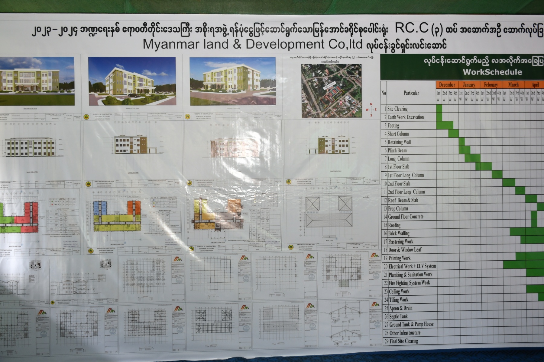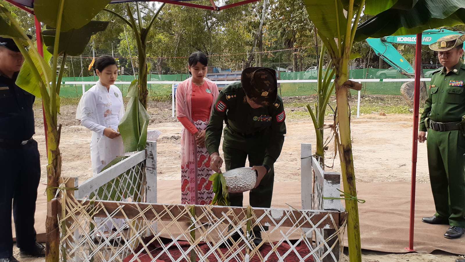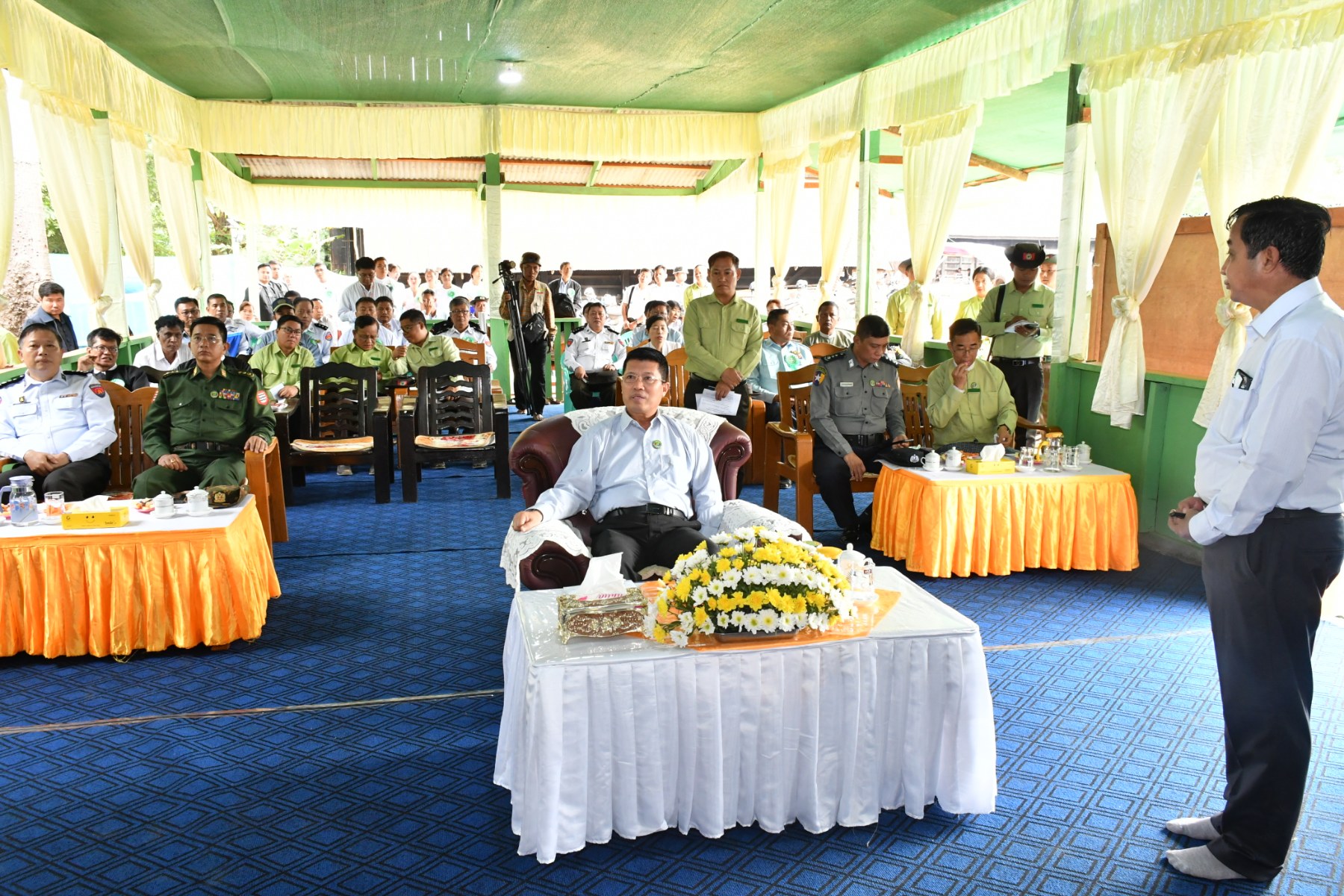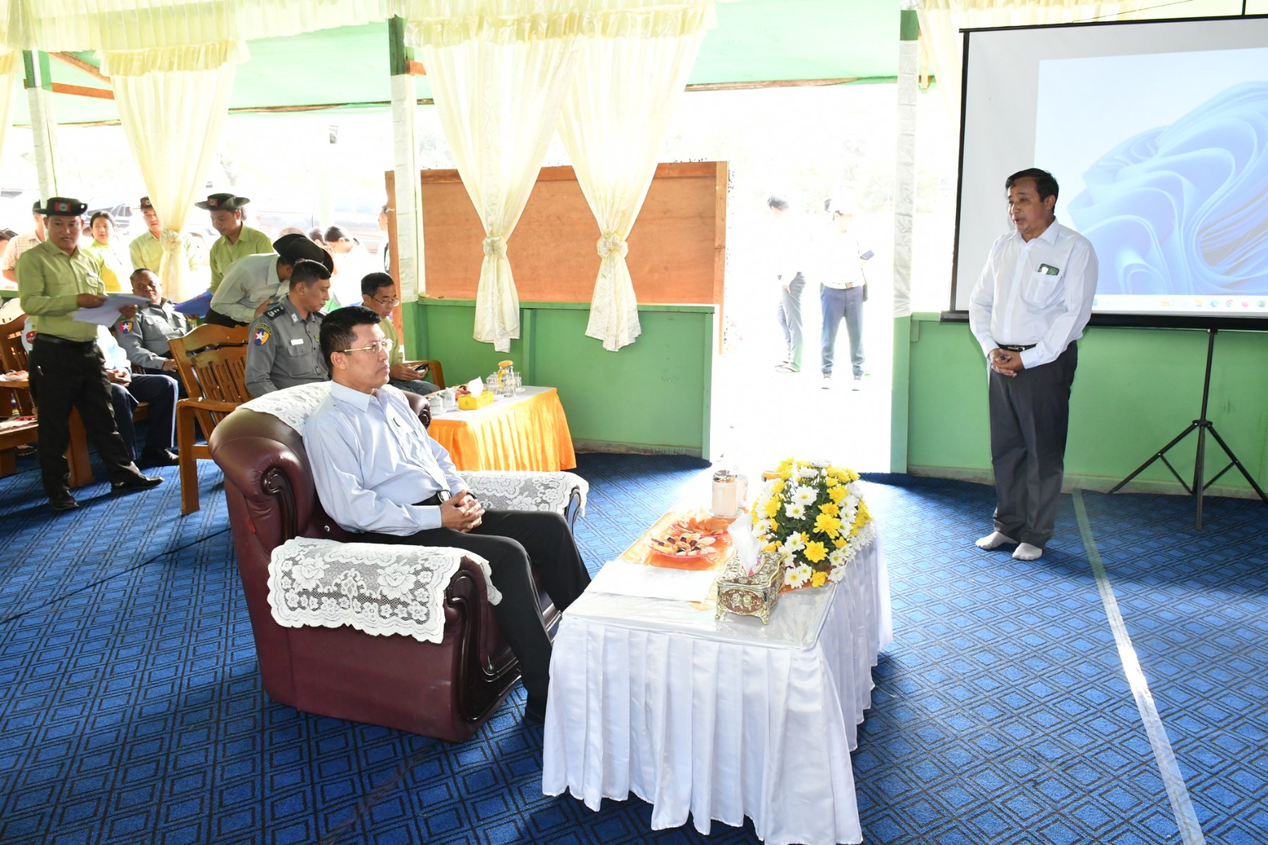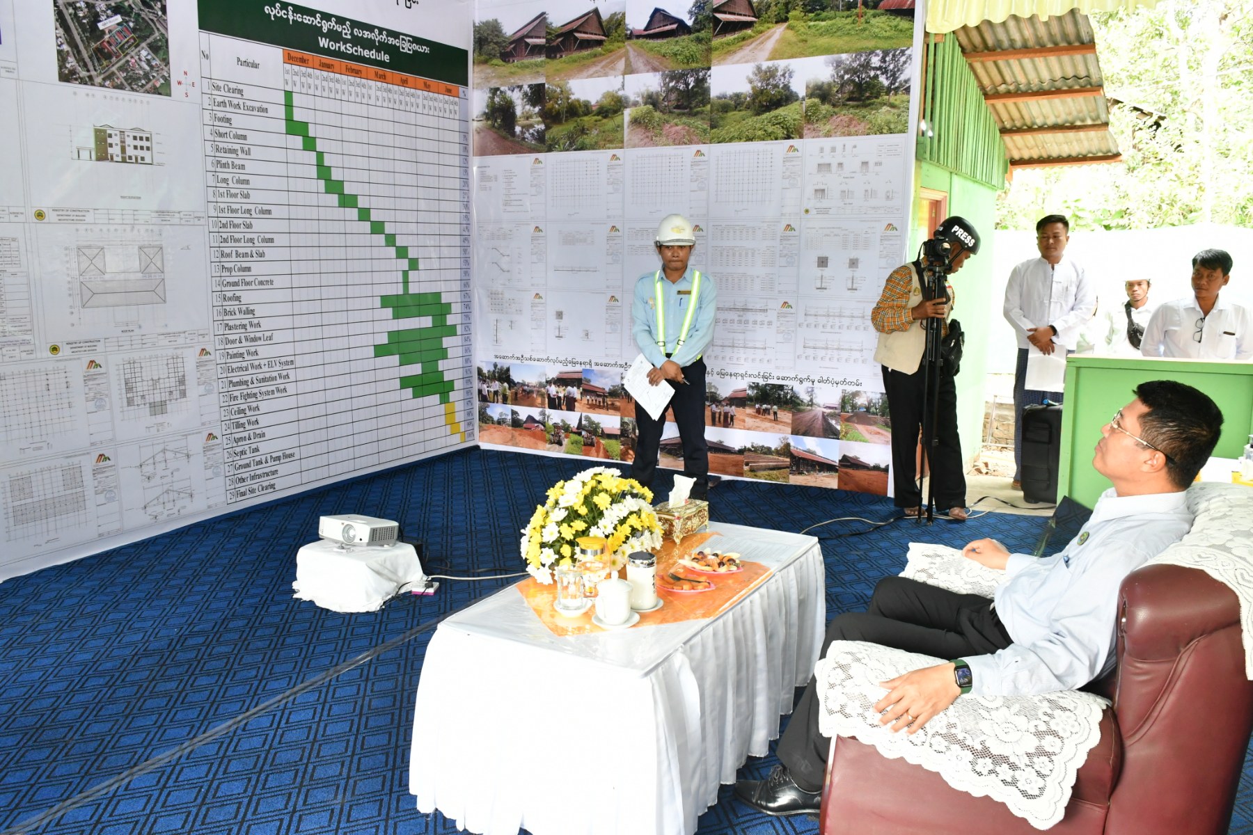 ဦးစွာ တိုင်းဒေသကြီးဝန်ကြီးချုပ်နှင့်အဖွဲ့သည် ပန္နက်တင်မင်္ဂလာပြုလုပ်ရန်နေရာယူပြီး မင်္ဂလာအချိန်တွင် ပန္နက်တိုင်များအား စိုက်ထူကာ အောင်သပြေ၊ အမွှေးနံ့သာရည်များဖြင့် ပက်ဖြန်းပေးခဲ့ကြသည်။ ထို့နောက် ရှင်းလင်းဆောင်၌ ကုမ္ပဏီတာဝန်ရှိသူများက ခရိုင်စုပေါင်းရုံး သုံးထပ်အဆောက်အဦ ဆောက်လုပ်မည့်အခြေအနေ၊ ခြံစည်းရိုးကာရံခြင်းနှင့် ခရိုင်အုပ်ချုပ်ရေးမှူးနေအိမ် RC နှစ်ထပ်ဆောက်လုပ်မည့် လုပ်ငန်းများအားတိုင်းဒေသကြီးဝန်ကြီးချုပ်ထံ အသီးသီးရှင်းလင်းတင်ပြခဲ့ကြရာ တိုင်းဒေသကြီးဝန်ကြီးချုပ်က ဘဏ္ဍာရေးနှစ်အတွင်း လုပ်ငန်းများပြီးစီးအောင်ဆောင်ရွက်ရန်၊ အရည်အသွေးပြည့်မီအောင်ဆောင်ရွက်ရန်နှင့် လုပ်ငန်းခွင်အန္တရာယ်ကင်းရှင်းရေး စနစ်တကျကြပ်မတ်ဆောင်ရွက်ရန် တာဝန်ရှိသူများအားမှာကြားခဲ့ပါသည်။