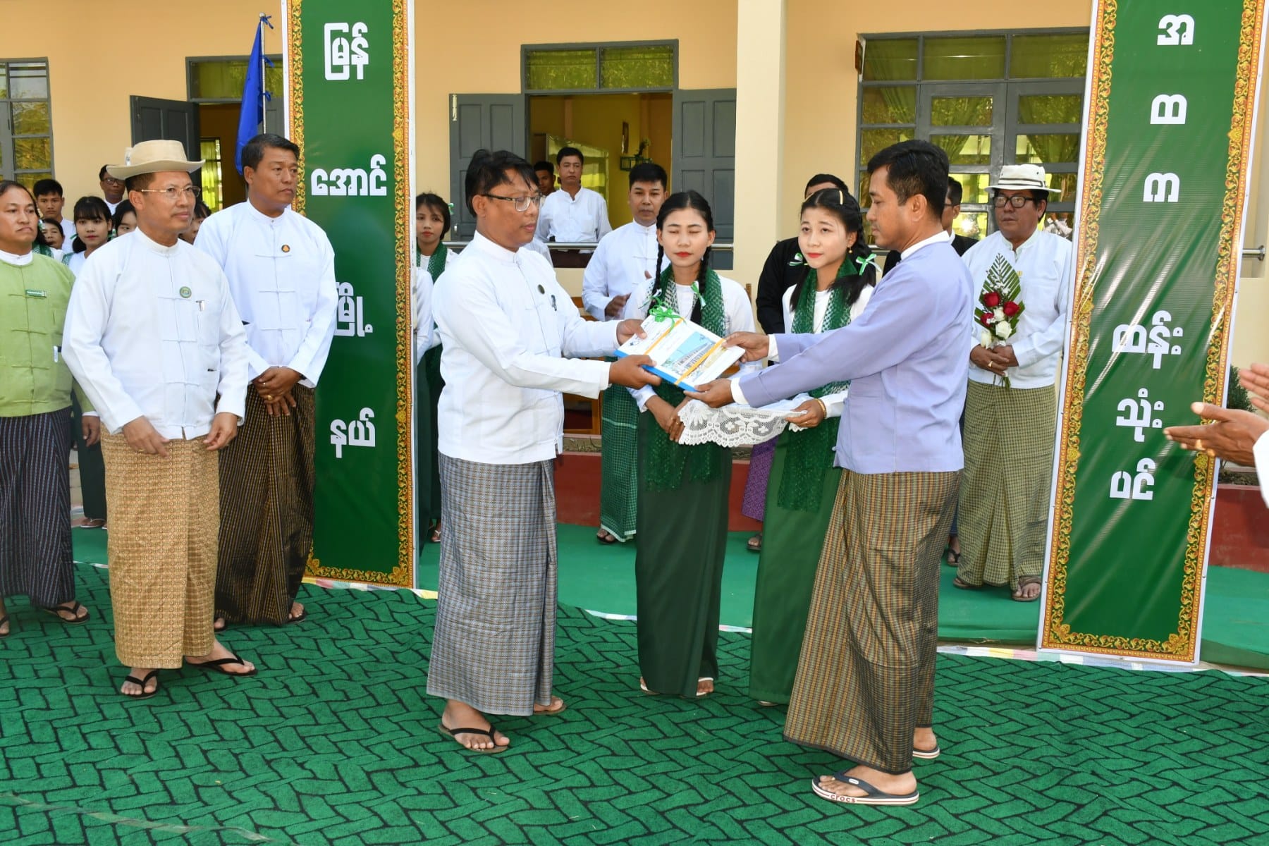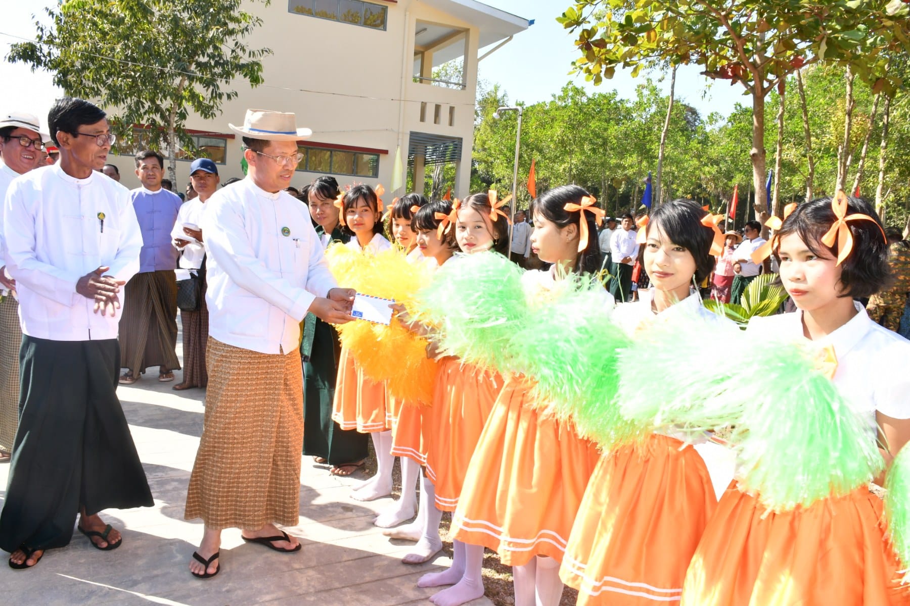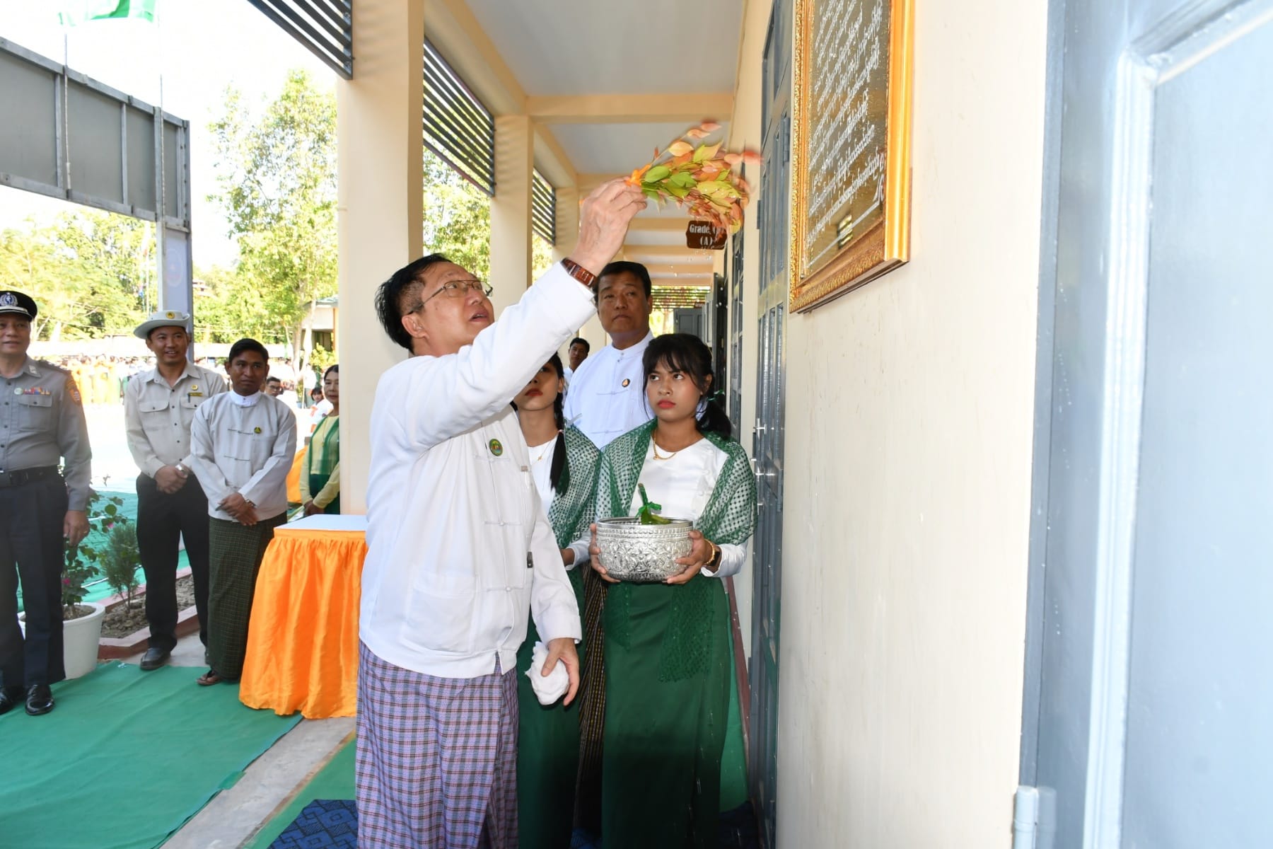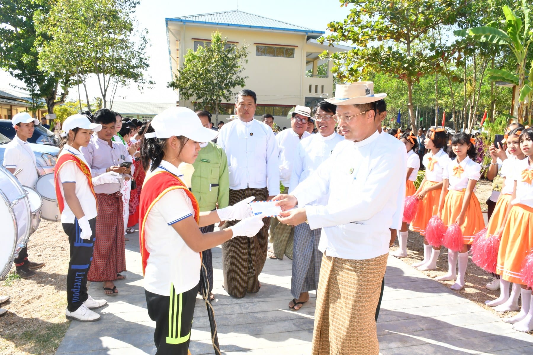 ဦးစွာ တိုင်းဒေသကြီး ဝန်ကြီးချုပ်သည် (၇၆)နှစ်မြောက် လွတ်လပ်ရေးနေ့ကို ကြိုဆိုဂုဏ်ပြုသောအားဖြင့် ဖွင့်လှစ်သည့် မြန်အောင်မြို့နယ်၊ ထန်းသုံးပင်အခြေခံပညာအထက်တန်းကျောင်းအား တာဝန်ရှိသူများနှင့်အတူ ဖဲကြိုးဖြတ်ဖွင့်လှစ်ပေးပြီး ကျောင်းအတွက် ဆိုလာမီးအား ပေးအပ်လှူဒါန်းရာ ကျောင်းအုပ်ကြီးနှင့် ကျောင်းအကျိုးတော်ဆောင် တစ်ဦးက လက်ခံရယူခဲ့သည်။ ထို့နောက် ကျောင်းဆောင်ဆောက်လုပ်သည့် ကုမ္ပဏီက ကျောင်းဆောင်သစ်နှင့် ပတ်သက်သည့် မှတ်တမ်းများအား ပညာရေးဌာနသို့ လွှဲပြောင်းပေးအပ်ရာ တိုင်းဒေသကြီး ပညာရေးမှူးကလက်ခံရယူခဲ့ပြီးနောက် တိုင်းဒေသကြီး ဝန်ကြီးချုပ်နှင့်ဧည့်သည်တော်များက စုပေါင်းမှတ်တမ်းတင် ဓာတ်ပုံများရိုက်ကူးခဲ့သည်။