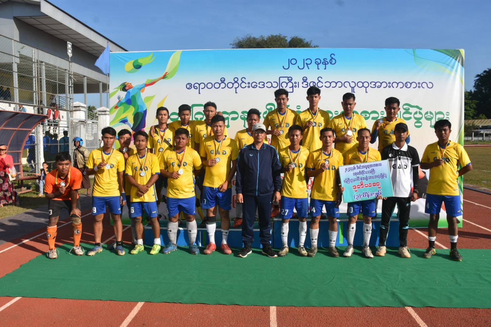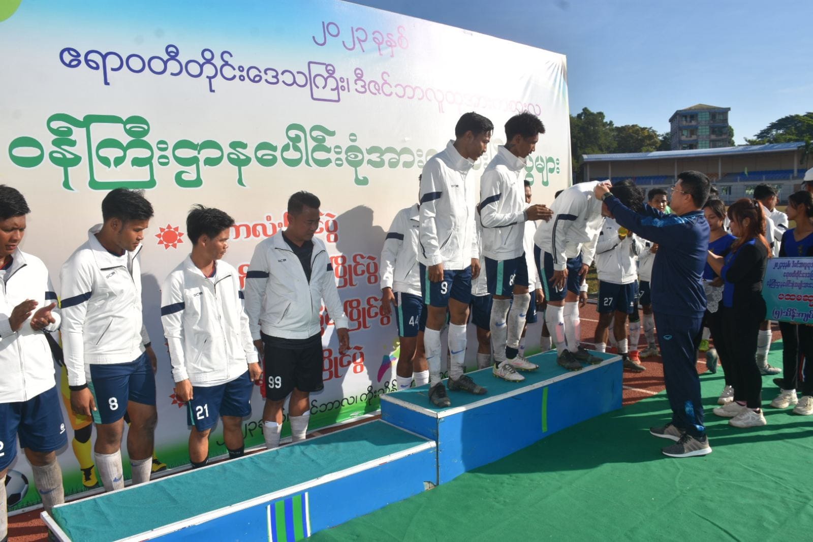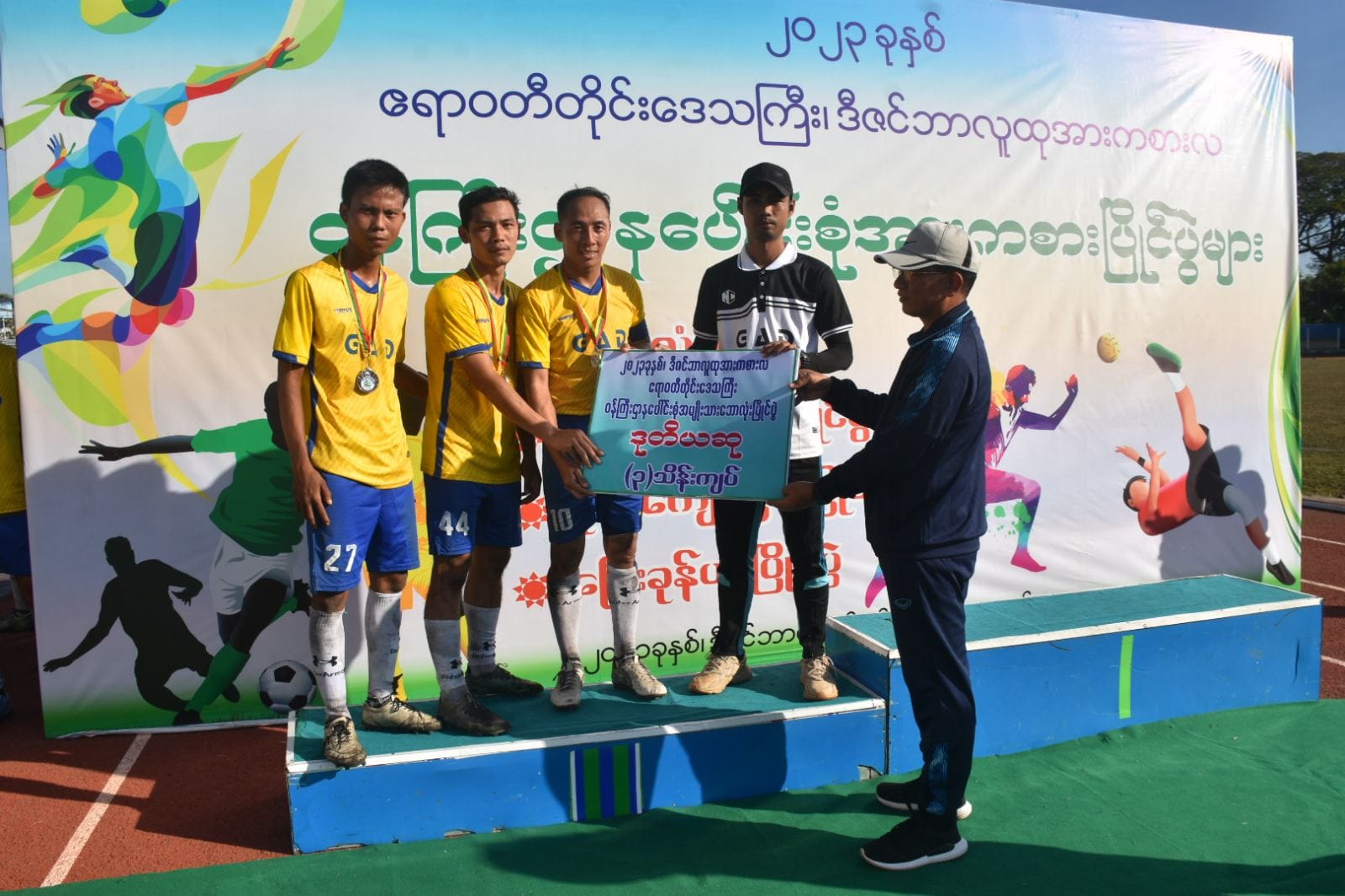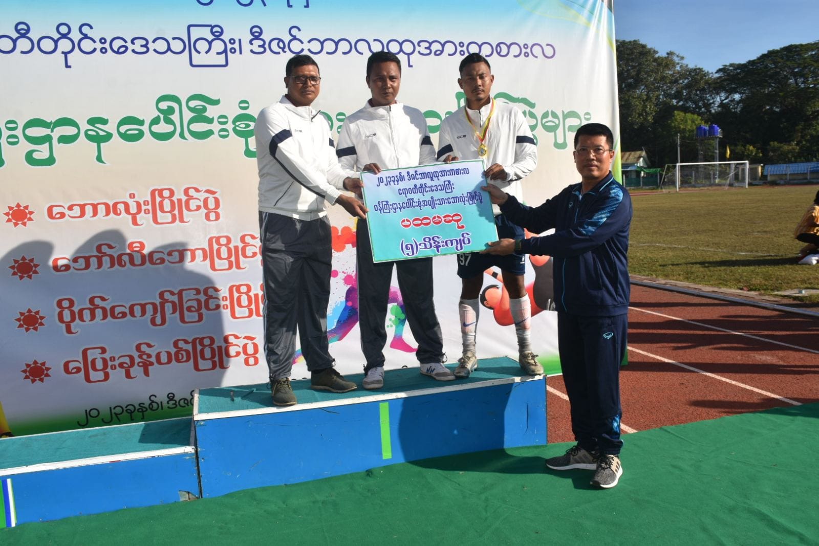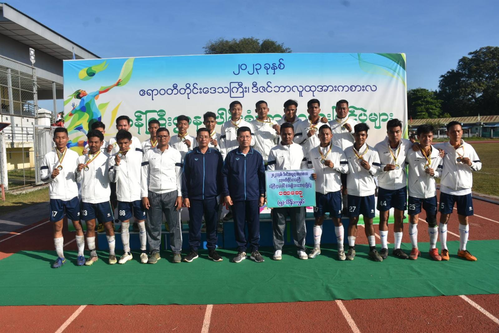 ထို့နောက် ဆုချီးမြှင့်ပွဲအခမ်းအနားကို ဆက်လက်ပြုလုပ်ရာ ဒုတိယဆုရရှိသည့် ဧရာဝတီတိုင်းဒေသကြီးအထွေထွေအုပ်ချုပ်ရေးဦးစီးဌာန အသင်းအား တစ်ဦးချင်းဆုတံဆိပ်နှင့်ငွေသားဆုကို လုံခြုံရေးနှင့်နယ်စပ်ရေးရာဝန်ကြီးကလည်းကောင်း၊ ပထမဆုရရှိသည့် လုံခြုံရေးနှင့် နယ်စပ်ရေးရာဝန်ကြီးဌာနအသင်းအား တစ်ဦးချင်းဆုတံဆိပ်နှင့် ငွေသားဆုကို တိုင်းဒေသကြီးဝန်ကြီးချုပ်ကလည်းကောင်း ဆုများချီးမြှင့်ခဲ့ကြပြီးအမှတ်တရဓါတ်ပုံများရိုက်ကူးခဲ့ကြပါသည်။