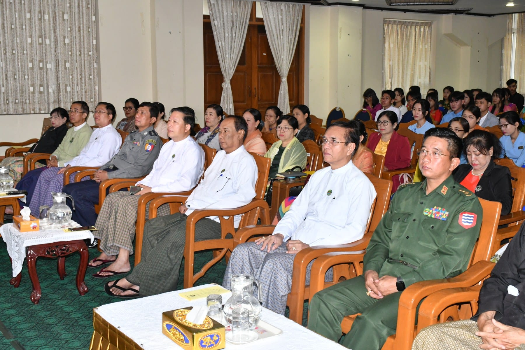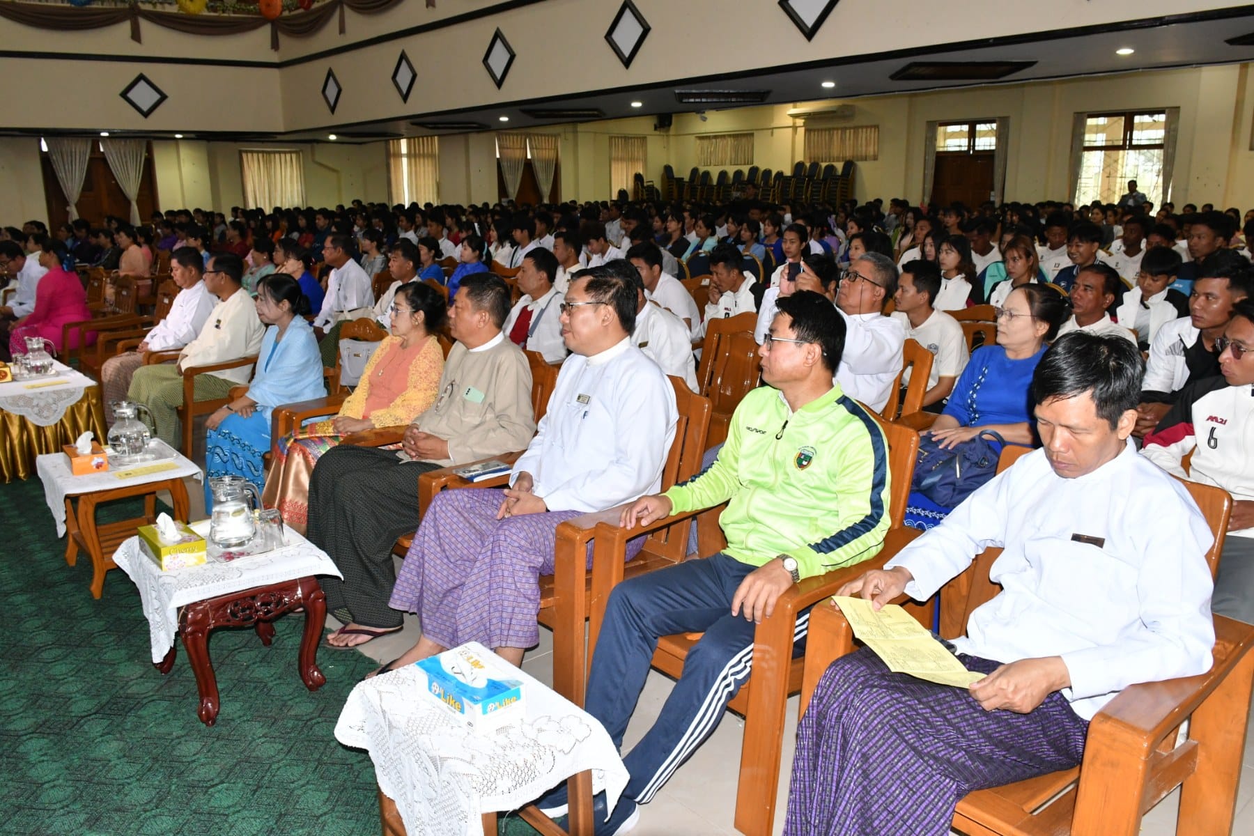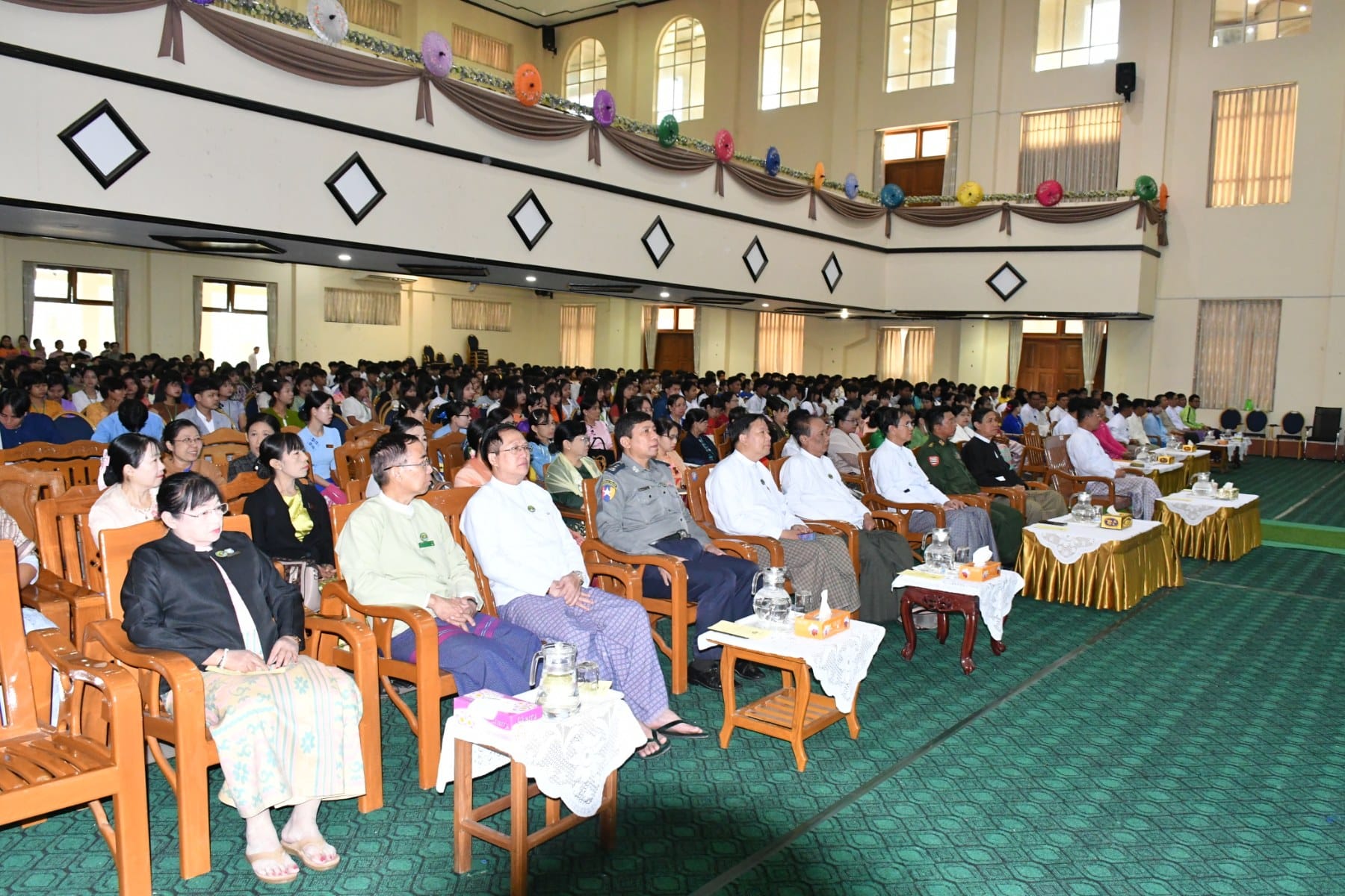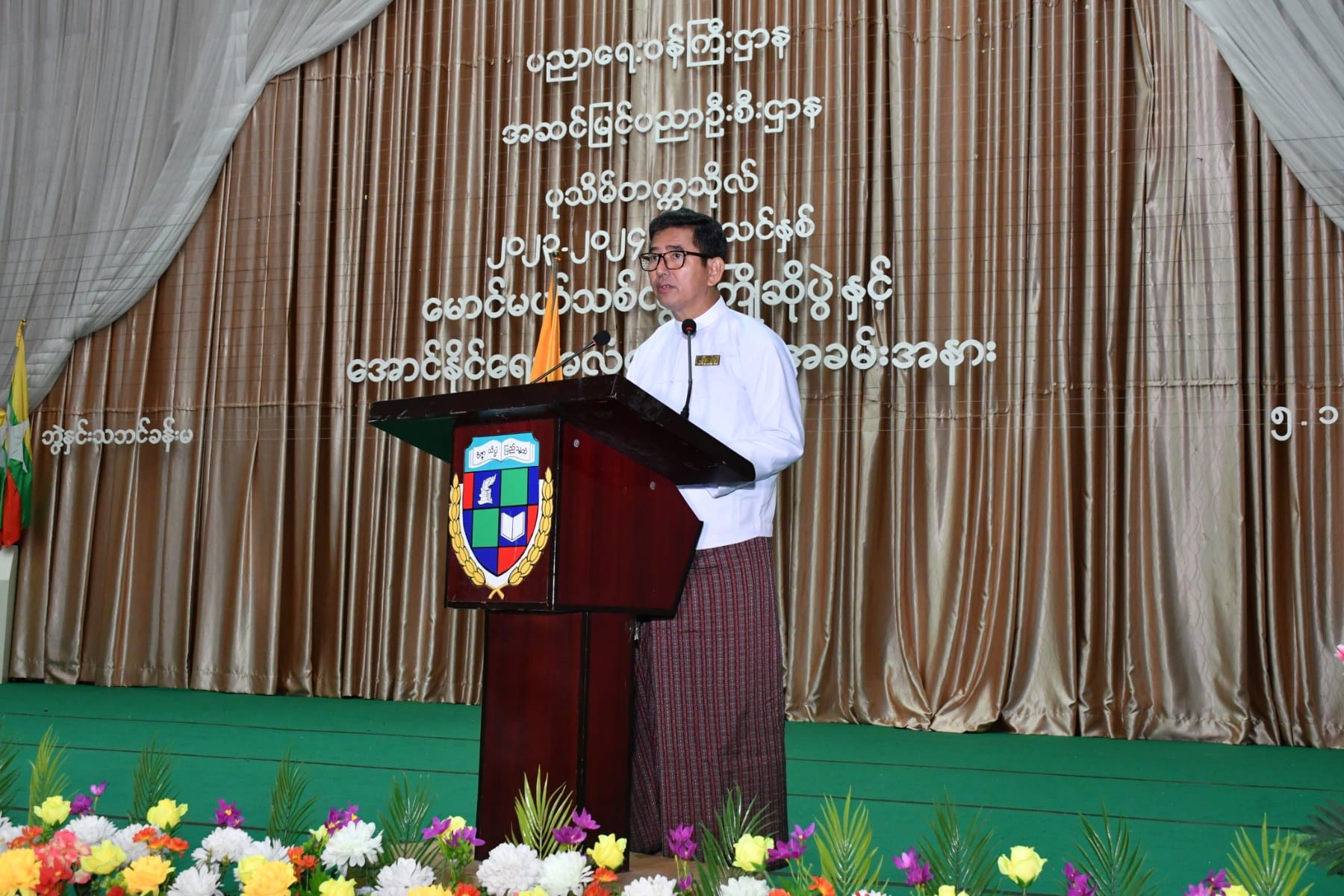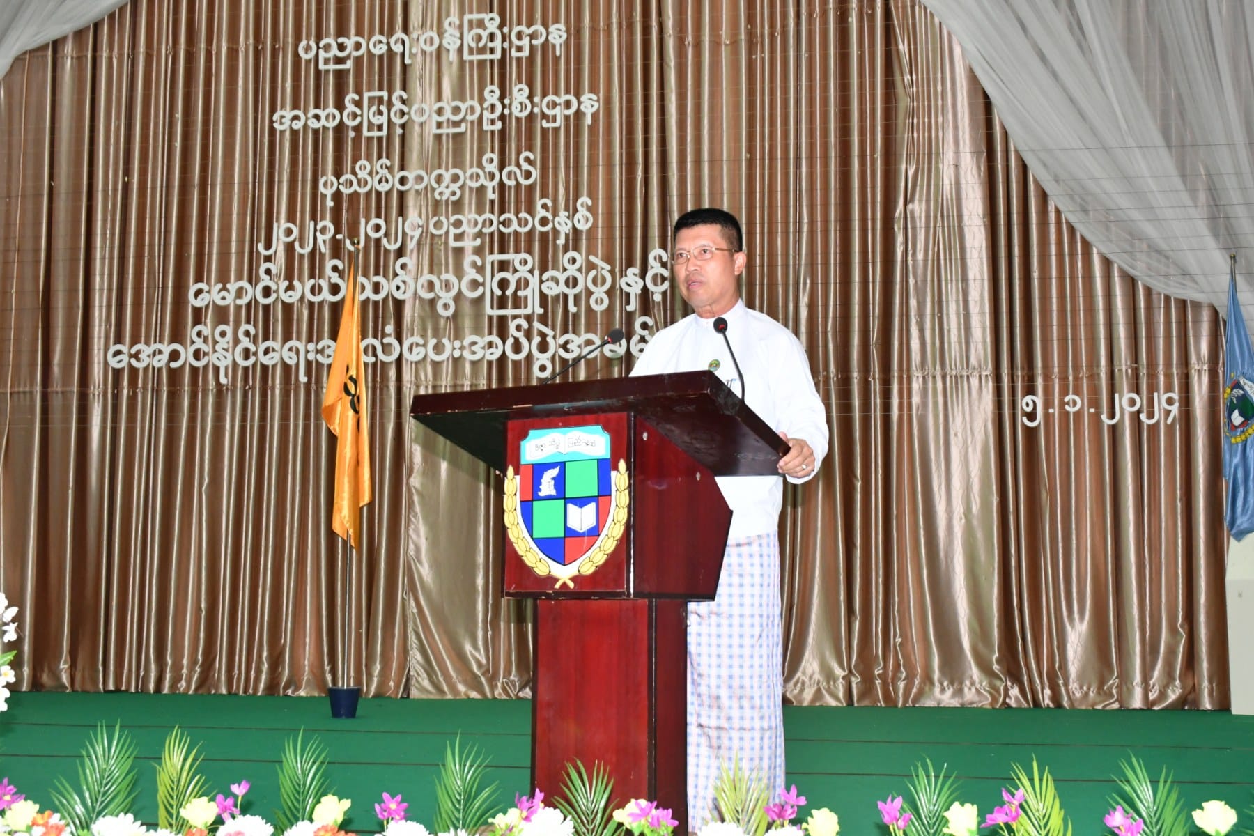 ဦးစွာ တိုင်းဒေသကြီးဝန်ကြီးချုပ်က“ တက္ကသိုလ်ကြီးတွင် စတင်ပညာဆည်းပူးမည့် မောင်တို့မယ်တို့အား တက္ကသိုလ်ရှိ ပါမောက္ခချုပ်၊ ဒုတိယပါမောက္ခချုပ်နှင့် ပါမောက္ခများက နွေးထွေးစွာကြိုဆိုကြခြင်းဖြစ်ပါကြောင်း၊ မောင်တို့မယ်တို့အနေဖြင့် တက္ကသိုလ်ဝင်စာမေးပွဲ အောင်မြင်ခဲ့ကြပြီး ဘာသာရပ်များအလိုက် အဆင့်မြင့်ပညာများကို ဆက်လက်လေ့လာသင်ယူ ကြရမှာဖြစ်ပါကြောင်း၊ တက္ကသိုလ်ဆိုသည်မှာ တွေးတောကြံဆခြင်း အလေ့အကျင့်ကောင်း များကို ပြုစုပျိုးထောင်ပေးရာ နေရာဖြစ်ပါကြောင်း၊ ထို့အပြင် တက္ကသိုလ် ကျောင်းတော်ကြီးတွင် မိမိတို့ဝါသနာပါသည့် အားကစား၊ စာပေ ၊ ဂီတ၊ အနုပညာဆိုင်ရာများကိုလည်း စနစ်တကျလေ့လာသင်ယူခွင့်ရကြမှာဖြစ်ပါကြောင်း၊ ပုသိမ်တက္ကသိုလ်အား တက္ကသိုလ်အင်္ဂါရပ်များနှင့်အညီဖြစ်စေရေး အဆောက်အဦသစ်များတိုးချဲ့ဆောက်လုပ်ပေးခြင်း၊ လမ်းများတို့ချဲ့ဆောင်ရွက်ပေးခြင်း၊ အားကစားနှင့်သက်ဆိုင်သည့် အဆောက်အဦများနှင့် အားကစားပစ္စည်းများဖြည့်ဆည်းဆောင်ရွက်ပေး လျက်ရှိပါကြောင်း၊ အားကစားကဏ္ဍအနေဖြင့် ပုသိမ်၊ ဟင်္သာတ၊ မအူပင် တက္ကသိုလ်တို့စုပေါင်း၍ ပုသိမ်ဇုန်အဖြစ် အားကစားပြိုင်ပွဲများကို ဝင်ရောက်ယှဉ်ပြိုင် ရမည်ဖြစ်ပါကြောင်း၊ ယခင်နှစ်ထက်အောင်မြင်မှုများရရှိလာမည်ဟု မိမိအနေဖြင့်ယုံကြည်ပါကြောင်း၊ မောင်မယ်သစ်လွင်တို့အနေဖြင့် အဆင့်မြင့်ပညာများကိုလေ့လာဆည်းပူးပြီး သုတေသနပြုမှု၊ တီထွင်ဖန်တီးမှုတွေကိုတိုးတက်အောင်မြင်အောင်ကြိုးစားရင်းဖြင့် ဒေသနှင့် နိုင်ငံအကျိုး ကိုယ်စွမ်းဉာဏ်စွမ်းရှိသမျှ ကြိုးစားဖော်ဆောင်ပေးနိုင်သူများ ဖြစ်ပါစေကြောင်းနှင့် အားကစားကဏ္ဍတွင်လည်း ပုသိမ်ဇုန်ဂုဏ်ဆောင်နိုင်သည့် အားကစားသမားလည်း ဖြစ်ကြ ပါစေကြောင်း” မောင်မယ်သစ်လွင်များအား ကြိုဆိုနှုတ်ခွန်းဆက်စကားနှင့် ပြိုင်ပွဲဝင် အားကစားသမားများအား အမှာစကားများပြောကြားသည်။