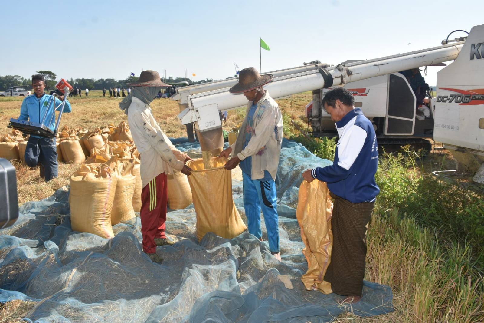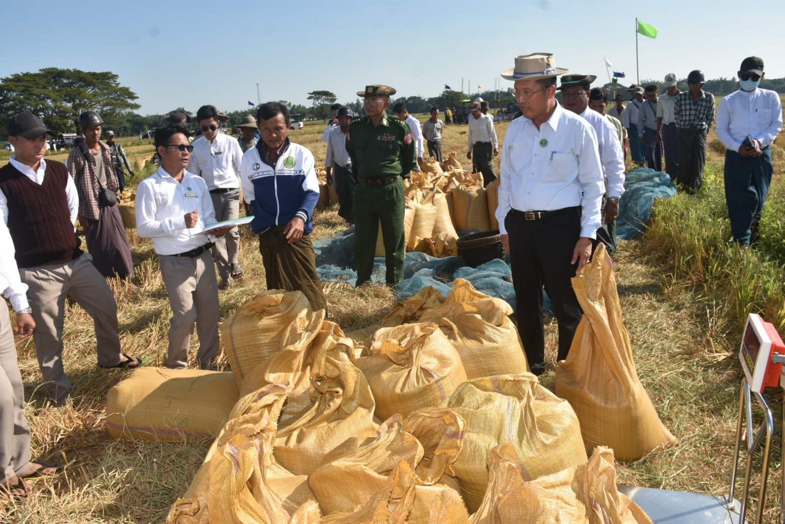 ဧရာဝတီတိုင်းဒေသကြီး၊ ပုသိမ်ခရိုင်၊ သာပေါင်းမြို့နယ်၊ ရုံးပင်ကျေးရွာအုပ်စု ၌ မိုးစပါး(ရေကျနောက်စိုက်)စံကွက်ရိတ်သိမ်းအခမ်းအနားကို ယနေ့မွန်းလွဲပိုင်းက ပြုလုပ်ခဲ့ရာ အခမ်းအနားသို့ တိုင်းဒေသကြီးဝန်ကြီးချုပ် ဦးတင်မောင်ဝင်းသည် တာဝန်ရှိသူများနှင့်အတူ တက်ရောက်ကြည့်ရှုအားပေးခဲ့သည်။