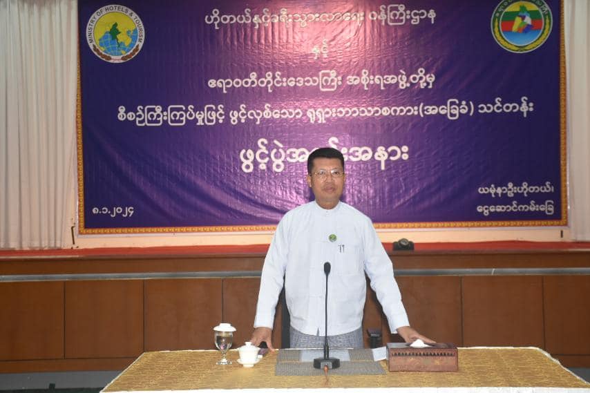 ဆက်လက်၍ ဟိုတယ်နှင့်ခရီးသွားလာရေးဝန်ကြီးဌာန၊ ပြည်ထောင်စု ဒုတိယဝန်ကြီးက ဟိုတယ်နှင့်ခရီးသွားလာရေးဝန်ကြီးဌာနအနေဖြင့် မြန်မာနိုင်ငံခရီးသွား လုပ်ငန်းကဏ္ဍတွင် ရုရှားခရီးသွားဈေးကွက်ကို ပိုမိုကျယ်ပြန့်ထိရောက်စွာ ရရှိနိုင်ရန်နှင့် ရုရှားခရီးသွားများကို ပိုမိုကောင်းမွန်သည့် ဝန်ဆောင်မှုများပေးနိုင်ရေးရည်ရွယ်၍ ယခုလို သင်တန်းဖွင့်လှစ်ပေးခြင်း ဖြစ်ပါကြောင်း၊ ထို့အပြင် ဟိုတယ်နှင့်ခရီးသွားကဏ္ဍ လူ့စွမ်းအားအရင်းအမြစ်များဖွံ့ဖြိုးတိုးတက် ရေး၊ အလုပ်အကိုင်သင်တန်းများပိုမိုရရှိစေရေး၊ ကျွမ်းကျင် ဝန်ထမ်းများမွေးထုတ်ပေးနိုင်ရေး၊ ဝန်ဆောင်မှုကောင်းမွန်ရေးနှင့် ဝန်ထမ်းများ၏ ဘာသာစကားစွမ်းရည်တိုတက်မြင့်မားလာ စေရေးအတွက် ဧည့်လမ်းညွှန်သင်တန်းများ၊ ဟိုတယ်ဆိုင်ရာ ဝန်ဆောင်မှုသင်တန်းများ၊ ဘာသာစကားသင်တန်းများ၊ အသိပညာပေးဆွေးနွေးပွဲများ၊ အလုပ်ရုံ ဆွေးနွေးပွဲများကို စဉ်ဆက်မပြက် ဖွင့်လှစ်ဆောင်ရွက်ပေးလျက်ရှိပါကြောင်းနှင့် ရုရှားဘာသာစကား (အခြေခံ) သင်တန်းကိုသင်ကြားတတ်မြောက်ခြင်းမှတစ်ဆင့် ရုရှားလူမျိုးများ၏ ယဉ်ကျေးမှု ဓလေ့စရိုက် လက္ခဏာများကို သိရှိလေ့လာနိုင်ဖြစ်ပြီး ခရီးသွားလုပ်ငန်းများကို ပိုမိုအကျိုးပြုပေးနိုင်မှာ ဖြစ်ကြောင်း ပြောကြားခဲ့သည်။ ထို့နောက် တိုင်းဒေသကြီးဝန်ကြီးချုပ်ဦးတင်မောင်ဝင်း၊ ဟိုတယ်နှင့်ခရီးသွားလာရေးဝန်ကြီးဌာန၊ ဒုတိယဝန်ကြီးတို့သည် တက်ရောက်လာကြသူများ သင်တန်းသားသင်တန်းသူများနှင့်အတူ မှတ်တမ်းတင်ဓါတ်ပုံများ ရိုက်ကူးခဲ့ ကြကာ အခမ်းအနားရုပ်သိမ်းခဲ့ပါသည်။