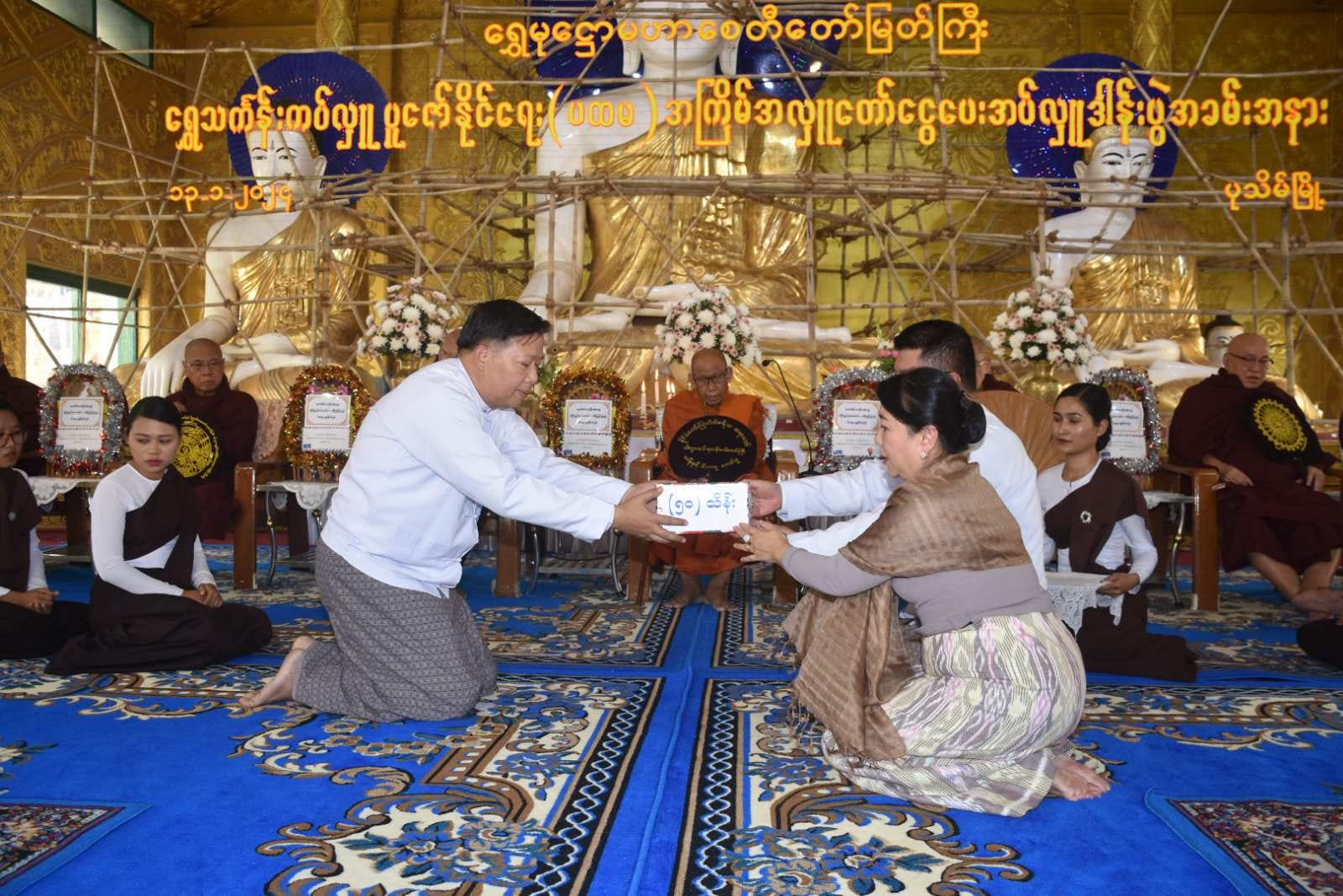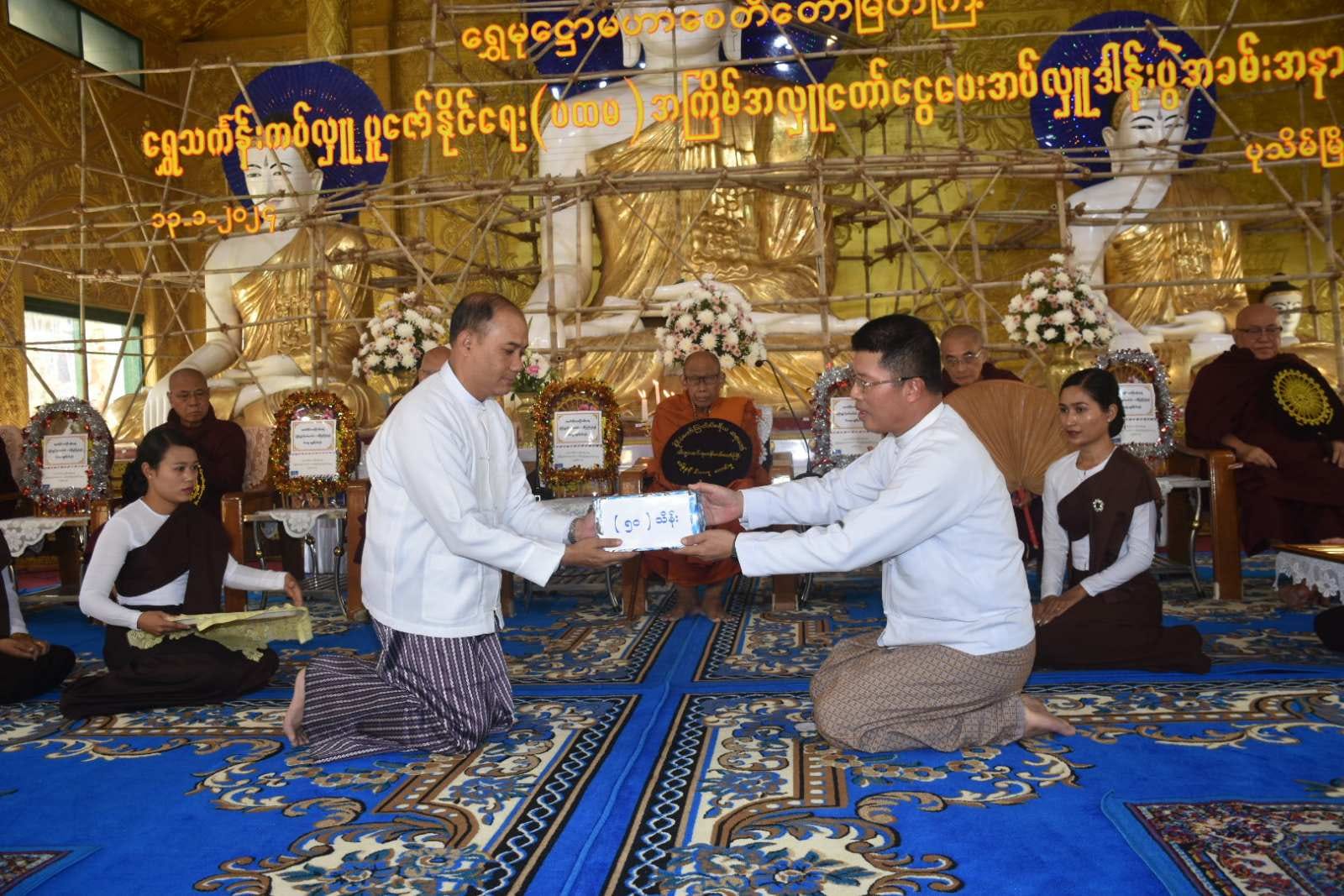 ဆက်လက်၍ အလှူရှင်များက အလှူတော်ငွေများကို ပေးအပ်လှူဒါန်းရာ တိုင်းဒေသကြီးဝန်ကြီးချုပ်နှင့် တာဝန်ရှိသူအသီးသီးက လက်ခံခဲ့ပြီး အလှူရှင်များအား ဂုဏ်ပြုမှတ်တမ်းလွှာများပြန်လည်ပေးအပ်ခဲ့သည်။ ထို့နောက် တိုင်းဒေသကြီးသံဃနာယကအဖွဲ့၊ ဩဝါဒါစရိယ၊ ပုသိမ်မြို့၊ မရမ်းချို ကျောင်းတိုက်၏ ပဓာနနာယကဆရာတော် (အဂ္ဂမဟာဂန္ထဝါစကပဏ္ဍိတ၊ အဂ္ဂမဟာသဒ္ဓမ္မဇောတိကဓဇ) ဘဒ္ဒန္တသောဘိတ မဟာထေရ်မြတ်ထံမှ လှူဒါန်းမှုအစုစုတို့အတွက် အနုမောဒနာတရား နာကြား၍ ရေစက်သွန်းချအမျှပေးဝေခဲ့ပြီး အခမ်းအနားအား "ဗုဒ္ဓသာသနံ စိရံတိဋ္ဌတု" သုံးကြိမ်ရွတ်ဆိုဆုတောင်း၍ ရုပ်သိမ်းခဲ့ကြောင်းသိရသည်။