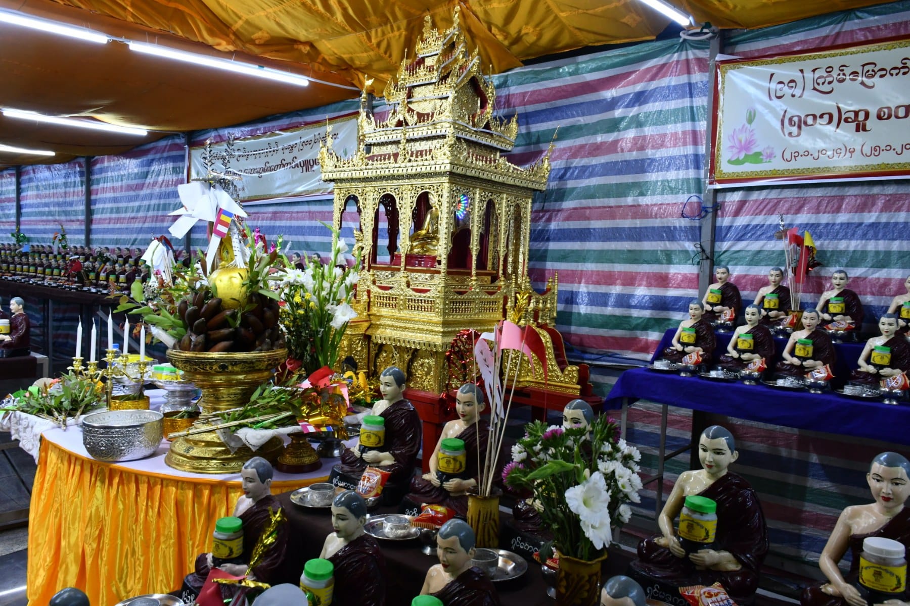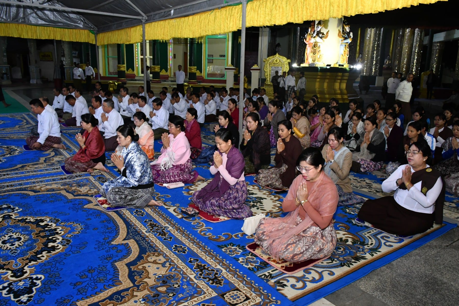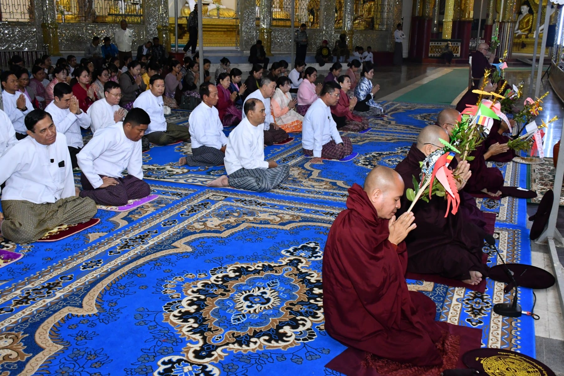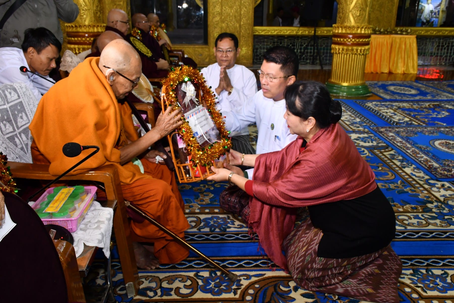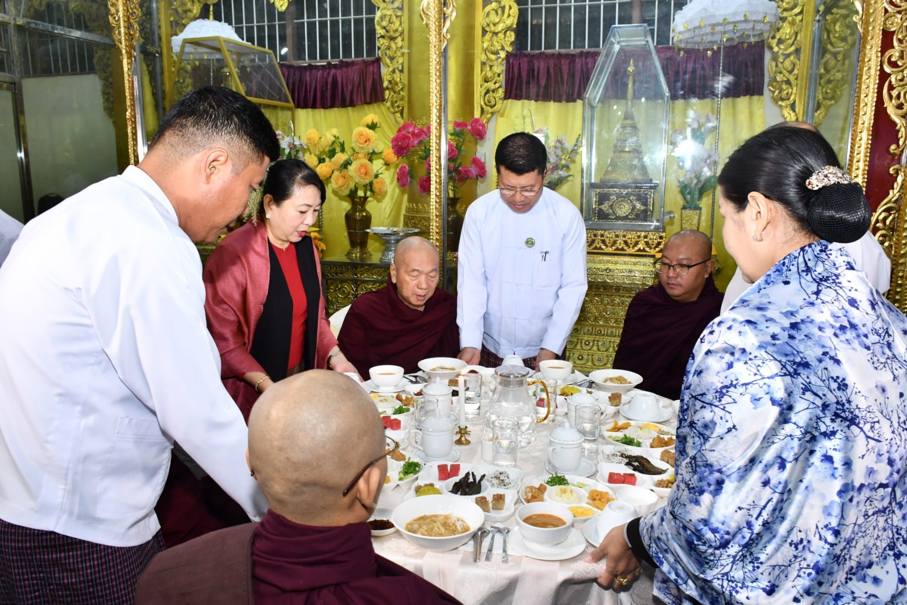 ဧရာဝတီတိုင်းဒေသကြီး၊ ပုသိမ်မြို့၏ ကျက်သရေဆောင် ရွှေမုဋ္ဌောမဟာစေတီတော် မြတ်ကြီးတွင် မြတ်စွာဘုရားအမှူးပြုသောရဟန္တာမထေရ်အပါး (၅၀၀)တို့အား (၅၀၁)ဆူ စတုမဓူ ဆေးဆွမ်းတော်ကပ်လှူပူဇော်ပွဲရေစက်ချ အခမ်းအနားကို ယနေ့နံနက်ပိုင်းက အဆိုပါ စေတီတော်မြတ်ကြီး၏ ရင်ပြင်တော်ပေါ်ရှိ ဦးမောင်ကြီးအာရုံခံတန်ဆောင်းတွင်ကျင်းပရာ အခမ်းအနားသို့ တိုင်းဒေသကြီးဝန်ကြီးချုပ် ဦးတင်မောင်ဝင်းနှင့်ဇနီး၊ အနောက်တောင်တိုင်း စစ်ဌာနချုပ်တိုင်းမှူးနှင့်ဇနီး၊ ပုသိမ်လေတပ်စခန်းဌာနချုပ်မှူးနှင့်ဇနီး၊ အစိုးရအဖွဲ့ဝင် ဝန်ကြီးများနှင့် ဇနီးများ၊ ဌာနဆိုင်ရာများနှင့် အလှူရှင်များ တက်ရောက်ခဲ့ကြပြီး တိုင်းဒေသကြီးဝန်ကြီးချုပ်သည်ဦးမောင်ကြီးအာရုံခံတန်ဆောင်းရှိ ဗုဓ္ဒဆင်းတုတော်မြတ်အား ဆွမ်း၊ ဆီမီး၊ ပန်း၊ ရေချမ်း ကပ်လှူပူဇော်ခဲ့သည်။