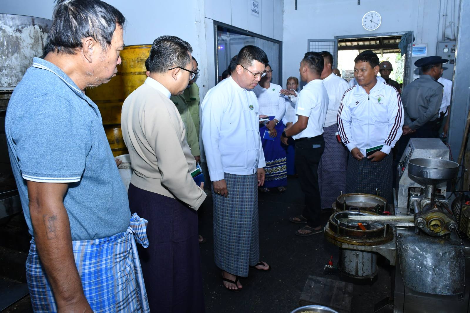 ယင်းနောက် တိုင်းဒေသကြီးဝန်ကြီးချုပ်နှင့်အဖွဲသည် ဟင်္သာတမြို့၊ ညောင်ပင်ရပ်ကွက်၊ ဓမ္မာရုံလမ်းရှိ “နိုင်”ဆီစက်သို့သွားရောက်၍ ပဲပုပ်ဆီကြိတ်ခွဲထုတ်လုပ်မှု အခြေအနေများအား သွားရောက်ကြည့်ရှုစစ်ဆေးခဲ့ပြီး မြေပဲ၊ နှမ်း၊ ပဲပုပ် ဆီများကြိတ်ခွဲထုတ်လုပ်မှု ကုန်ကြမ်းရရှိမှု၊ ဈေးကွက်ရရှိမှုအခြေအနေများအား ရှင်းလင်းတင်ပြ ခဲ့ရာ တိုင်းဒေသကြီးဝန်ကြီးချုပ်က သန့်ရှင်းလတ်ဆတ်၍ ကျန်းမာရေးနှင့်ညီညွတ်သည့် စားသုံးဆီများထုတ်လုပ်နိုင်ရေးနှင့် အဆင့်မီဆီကြိတ်စက်များနှင့် စားသုံးဆီများပိုမိုထုတ်လုပ်နိုင်ရေး၊ စားသုံးဆီဖူလုံရေးအတွက် ဆီထွက်နှုန်းကောင်းမွန်သည့် ပဲပုပ်၊ နေကြာ၊ မြေပဲစသည့်ဆီထွက်သီးနှံများပိုမိုစိုက်ပျိုးထုတ်လုပ်နိုင်ရေးဆောင်ရွက်ရန်မှာကြားခဲ့သည်။