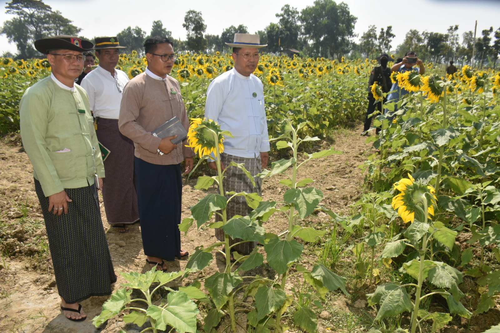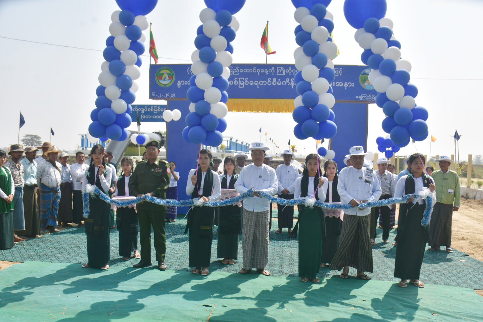 ထို့နောက် တိုင်းဒေသကြီးဝန်ကြီးချုပ်နှင့် အဖွဲ့သည် ရေကြည်မြို့နယ်၊ ဆီဆုံကုန်းကျေးရွာရှိ တောင်သူဦးလှမြင့်၏ စိုက်ဧက(၅)ဧကတွင် စိုက်ပျိုးထားသည့် ရေဆင်းစပ်မျိုး(၁)နေကြာအောင်မြင်ဖြစ်ထွန်းနေမှုများနှင့် ဆိုလာစနစ်ဖြင့် ရေသွင်းခြင်းလုပ်ငန်း ဆောင်ရွက်နေမှုများကိုကြည့်ရှုအားပေးပြီး ပိုးမွှားအန္တရာယ်မကျရောက်စေရေး၊ ဝတ်မှုန်ကူးခြင်းများအတွက် ပျားပုံးများထားရှိမှု၊ ရေ၊ မြေဩဇာအချိန်ကိုက် ထည့်သွင်းအသုံးပြုနိုင်ရေးနှင့် အောင်မြင်ဖြစ်ထွန်းအောင်မြင်အောင် ဆောင်ရွက်ကြရန်တို့ကို မှာကြားခဲ့သည်။ ဆက်လက်၍ တိုင်းဒေသကြီးဝန်ကြီးချုပ်နှင့် အဖွဲ့သည် ကျုံပျော်ခရိုင်၊ ရေကြည်မြို့နယ်၊ ကညင်ငူကျေးရွာတွင် (၇၈)နှစ်မြောက် ပြည်ထောင်စုနေ့ကို ကြိုဆိုဂုဏ်ပြုသောအားဖြင့်ကျင်းပသည့် နွားရေတိုက်လျှပ်စစ်မြစ်ရေတင်စီမံကိန်း (၁၀၀၀)ဧက ဖွင့်ပွဲအခမ်းအနားသို့ တက်ရောက်၍ တိုင်းဒေသကြီးဝန်ကြီးချုပ်သည် တာဝန်ရှိသူများနှင့်အတူ ဖဲကြိုးဖြတ်ဖွင့်လှစ်ပေးကာ စုပေါင်းမှတ်တမ်းတင်ဓာတ်ပုံရိုက်ကူးခဲ့ပြီး စီမံကိန်းဆောင်ရွက်ပြီးစီးမှုများအား လှည့်လည်ကြည့်ရှုစစ်ဆေးခဲ့သည်။ ထို့နောက် စီမံကိန်းရှင်းလင်းဆောင်တွင် အခမ်းအနားဒုတိယပိုင်းကို ဆက်လက်ပြုလုပ်ရာ တိုင်းဒေသကြီးဝန်ကြီးချုပ်က“ နွားရေတိုက်လျှပ်စစ်မြစ်ရေတင်စီမံကိန်းအား (၂၀၂၂-၂၀၂၃) ဘဏ္ဍာရေးနှစ်မှစပြီး တိုင်းဒေသကြီးအစိုးရအဖွဲ့ ငွေလုံးငွေရင်း ရန်ပုံငွေခွင့်ပြုချက်ဖြင့် ဆောင်ရွက်ခဲ့ခြင်းဖြစ်ပြီး ယခု(၂၀၂၄-၂၀၂၅) ဘဏ္ဍာရေးနှစ်မှစ၍ ဆောင်ရွက်ပြီးစီးသည့်အပိုင်းများမှ အကျိုးပြုဧက(၅၀၀)အား ရေစတင်ပေးဝေသွားမည်ဖြစ်ပါကြောင်း၊ စီမံကိန်းမဆောင်ရွက်မီက နွားရေတိုက်စီမံကိန်းတွင်ရှိသည့် လယ်၊ ယာများတွင် ရေကြီးနစ်မြုပ်သဖြင့် ရေကျနောက်စိုက် စပါးကိုသာ အဓိကအားထားစိုက်ပျိုးနေရ၍ အောင်ရေလိုအပ်ချိန်တွင် ရေအခက်အခဲ ကြုံတွေနေရပါကြောင်း၊ မြစ်ရေတင် အနေဖြင့်ရေပေးဝေနိုင်သဖြင့် တောင်သူများသီးထပ်စွမ်းအား တိုးချဲ့ စိုက်ပျိုးလာနိုင်မည့်အပြင် အရည်အသွေးပြည့်ဝသည့် ဈေးကွက်ဝင်သီးနှံများ စိုက်ပျိုးထုတ်လုပ်နိုင်မည်ဖြစ်ပါကြောင်း၊ ယခုမြစ်ရေတင်စီမံကိန်းဆောင်ရွက်ပေးခြင်းအားဖြင့် ရေကျနောက်စိုက် မိုးစပါးကို စိုက်ပျိုးနိုင်သည့်အပြင် ဒုတိယသီးနှံဖြစ်သောနွေစပါးကို ဆက်လက်စိုက်ပျိုးသွားနိုင်မည်ဖြစ်သည့်အတွက် ဒေသခံတောင်သူများ၏ လူမှုစီးပွားဘဝတိုးတက်ဖို့များစွာအထောက်အကူ ဖြစ်စေမည်ဖြစ်ပါကြောင်း၊ နိုင်ငံတော်ကငွေကြေးအမြောက်အမြားအကုန်အကျခံပြီး ဆောင်ရွက်ပေးထားသော မြစ်ရေတင်စီမံကိန်းအားရေရှည်တည်တံ့အောင်သက်ဆိုင်ရာတာဝန်ရှိသူများနှင့် ပူးပေါ